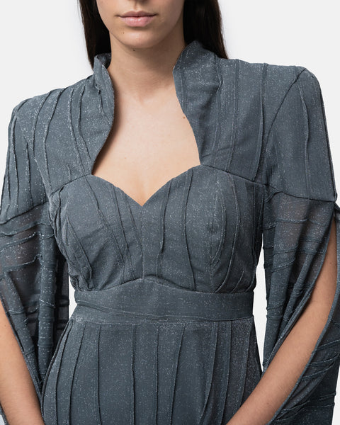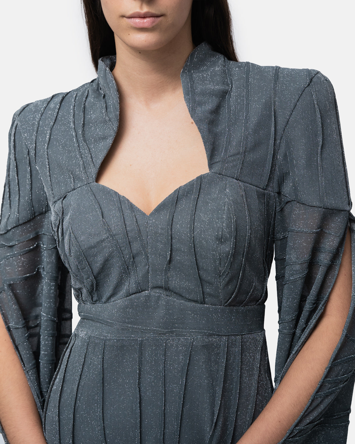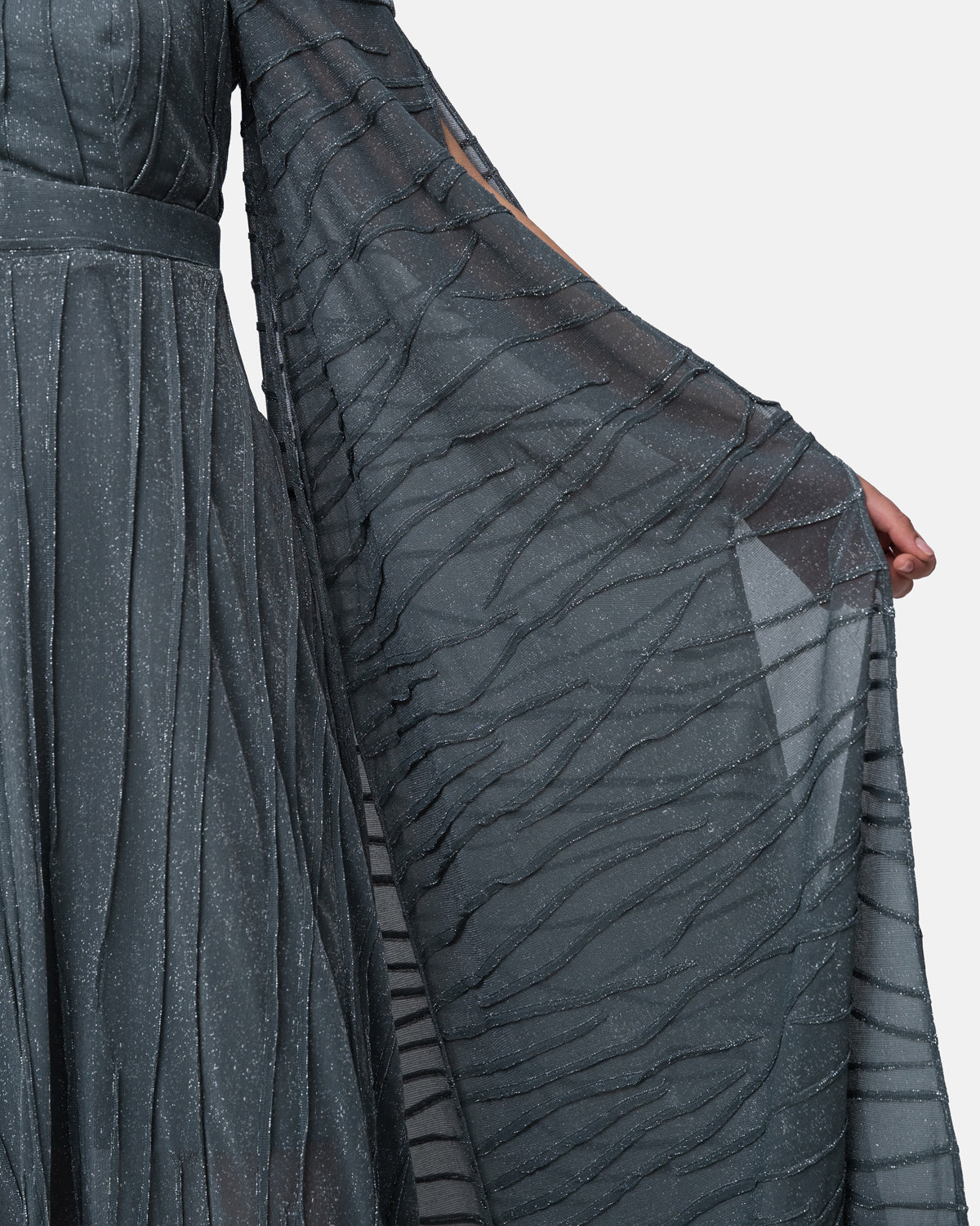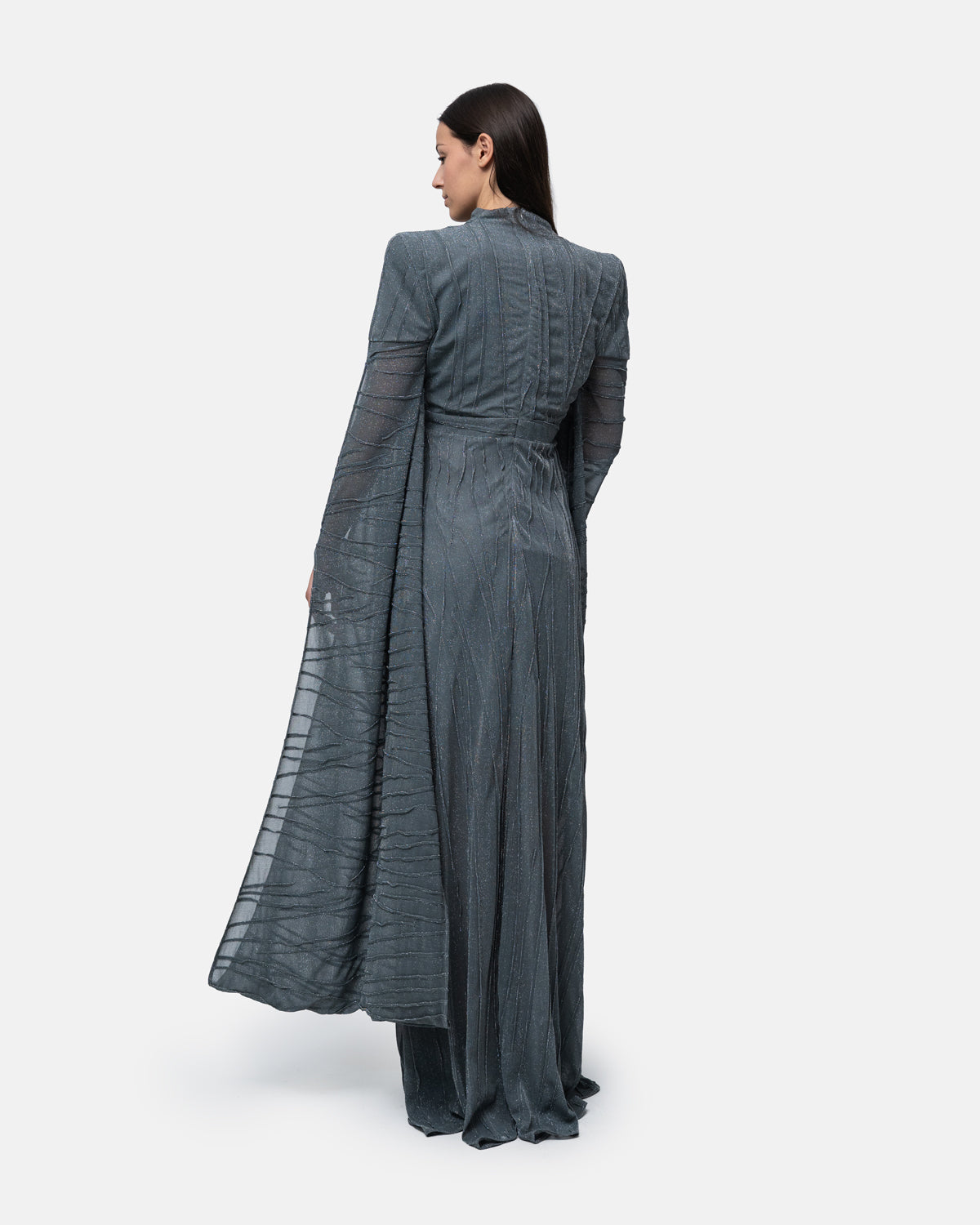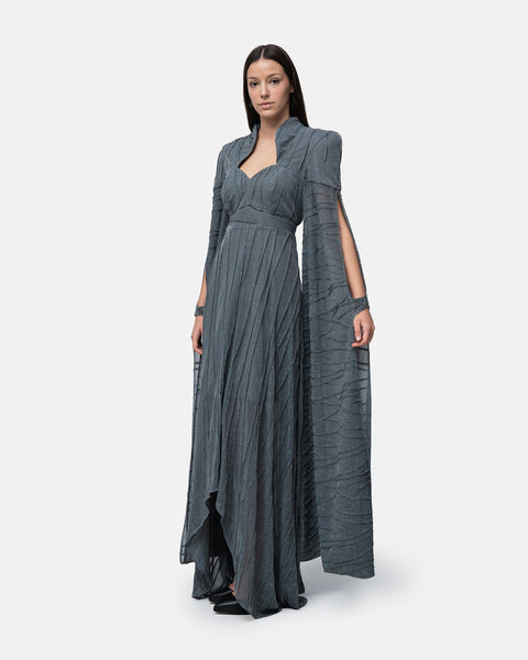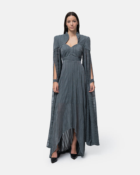 Long empire-line Dress with asymmetrical hemline, princess neckline and very long open sleeves
