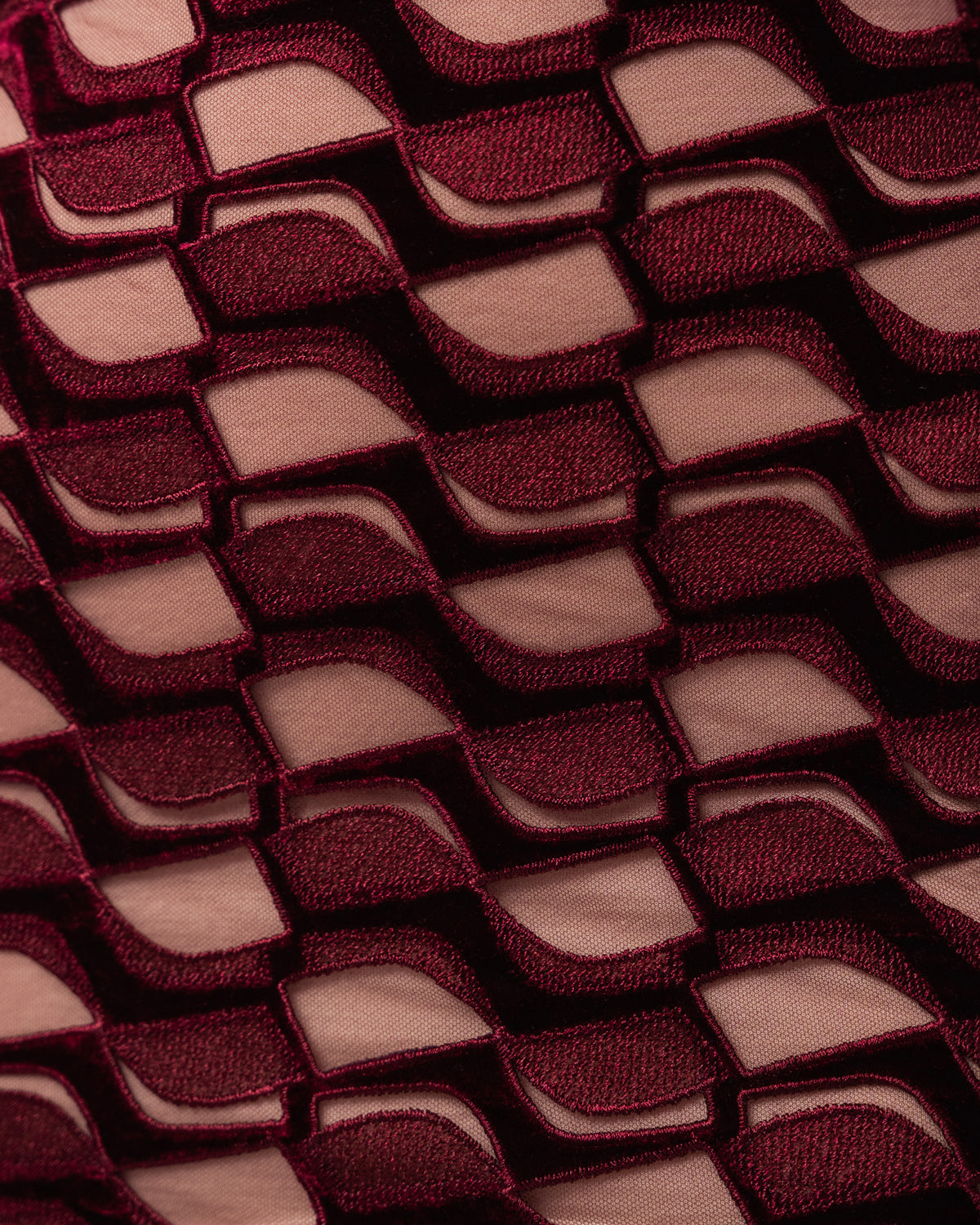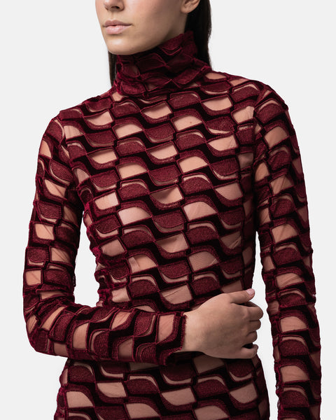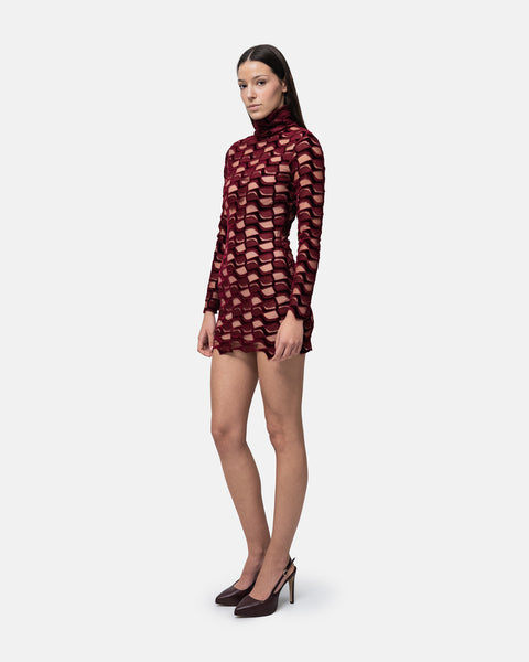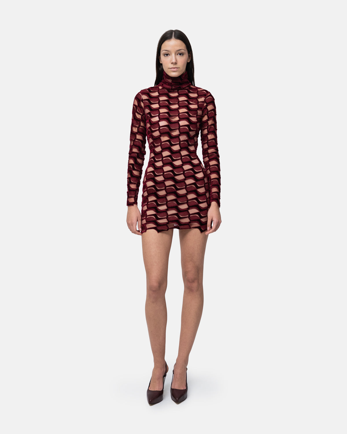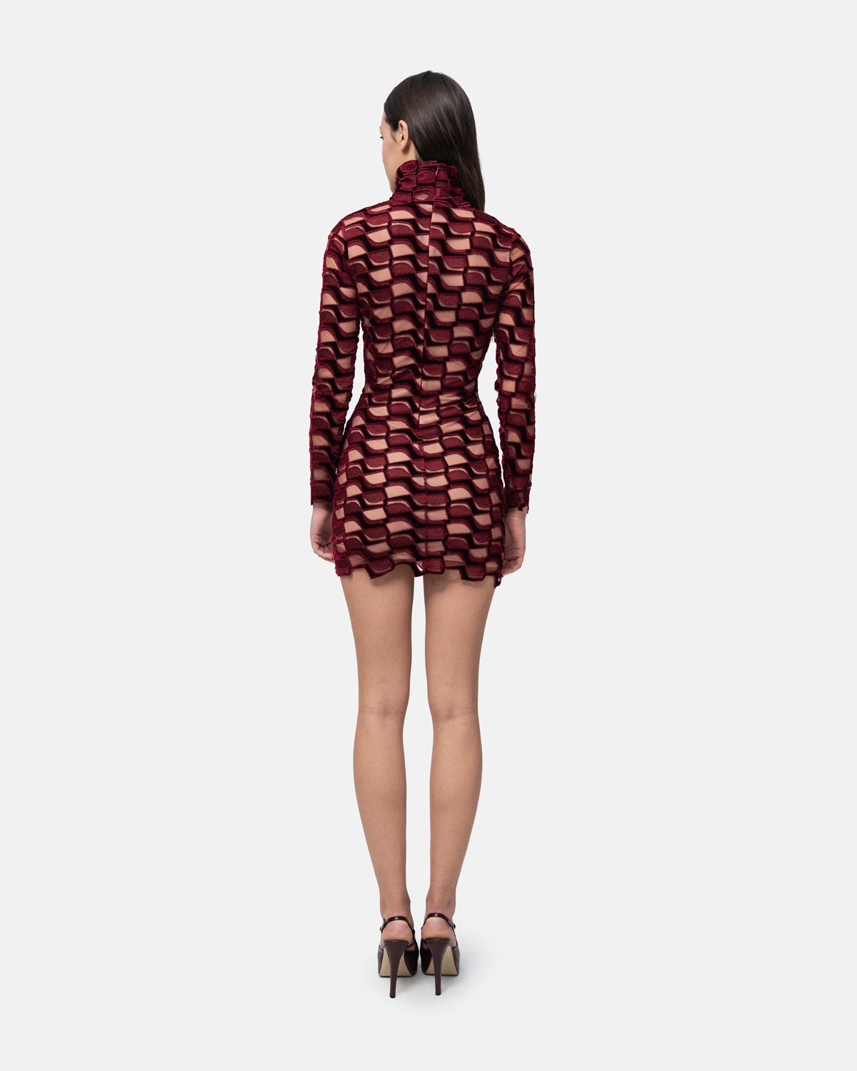 Short, fitted Dress with long sleeves and a high neckline, in sheer fabric with a velvety graphic design
