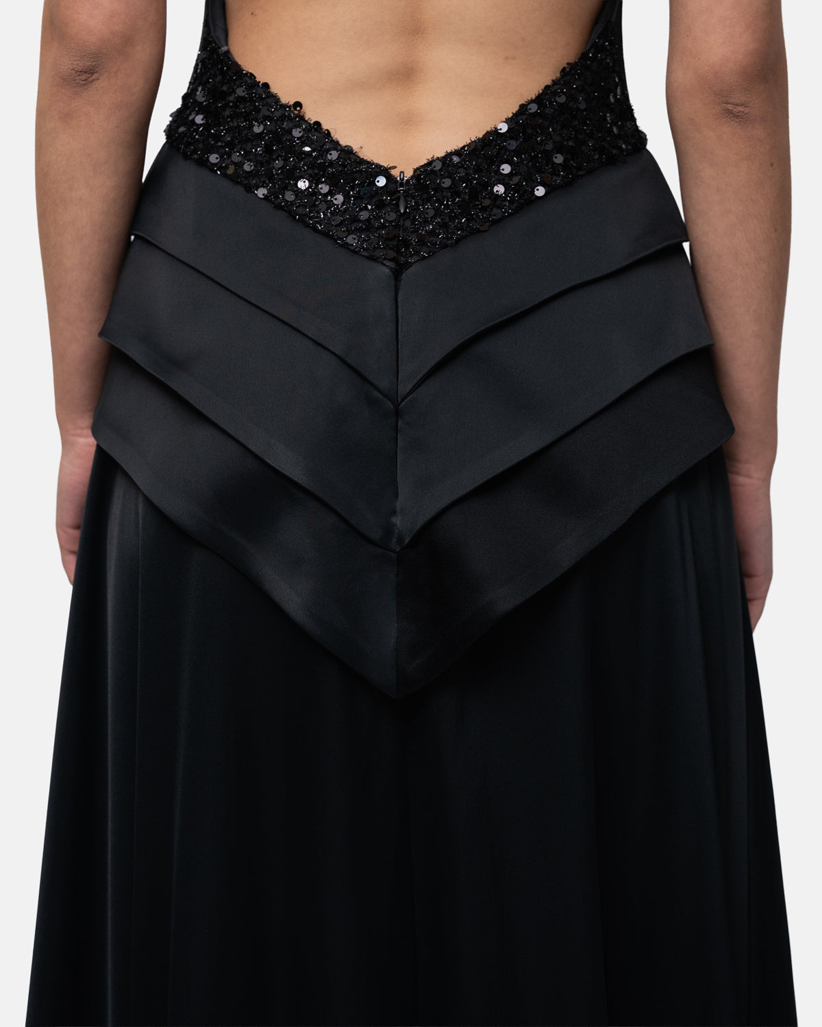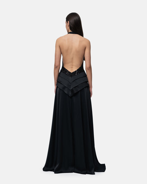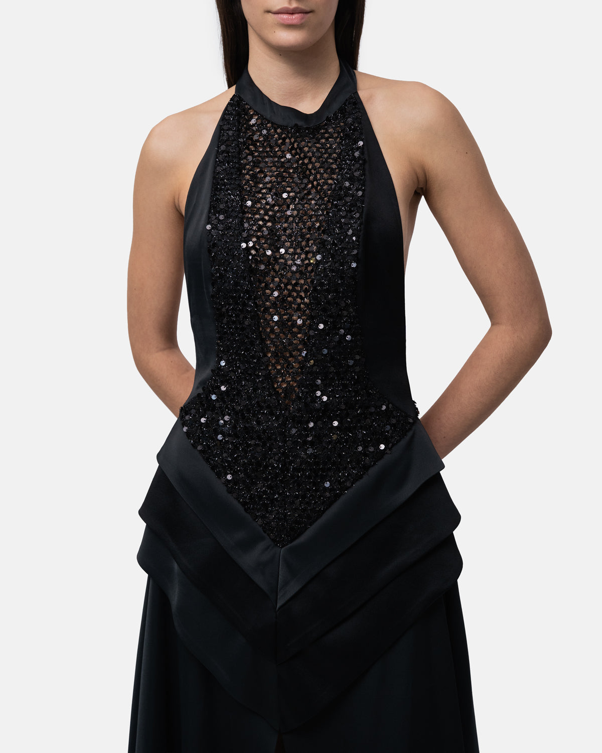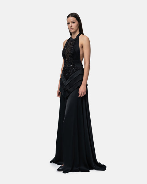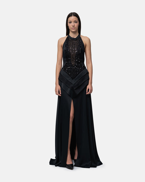 Long evening Dress with high lace bodice, open back and graphic pleats at the hips, slit at the front of the skirt