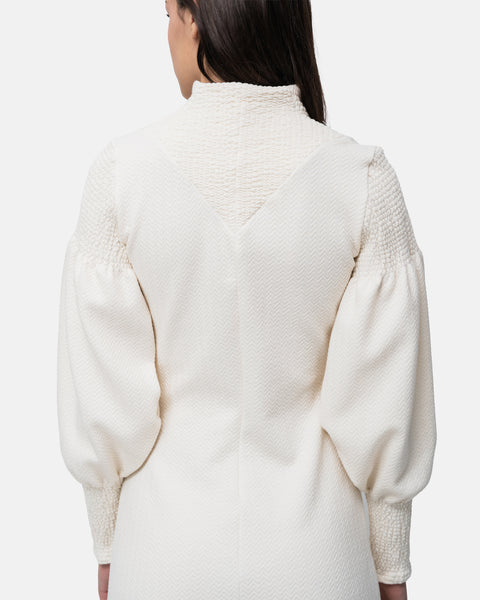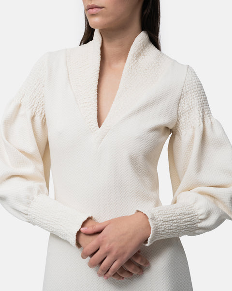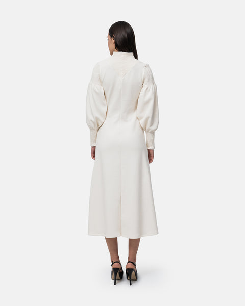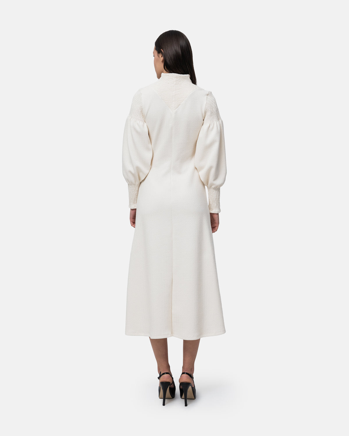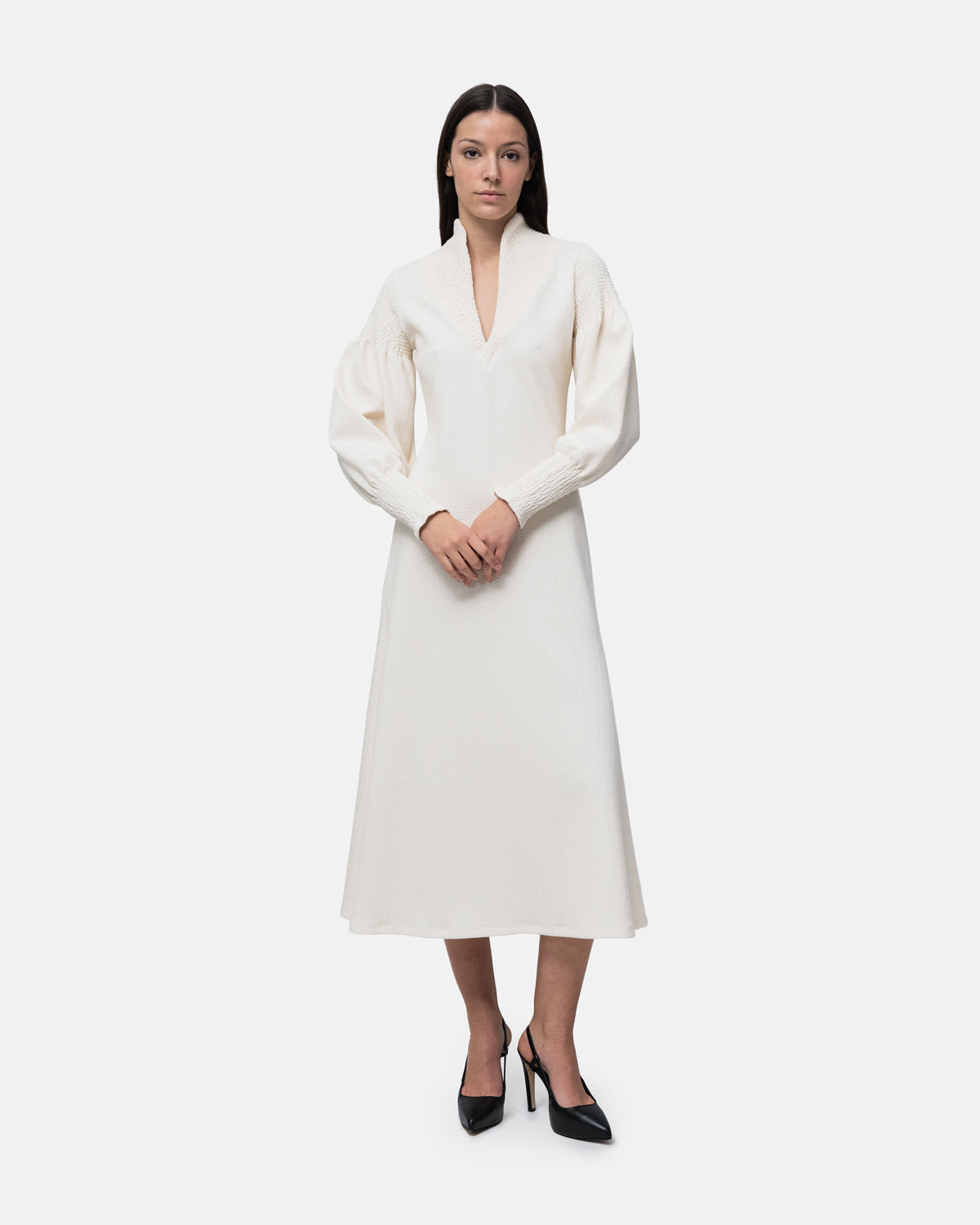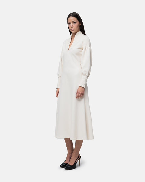 Flared midi Dress, V-neckline, long balloon sleeves and collar with elastic stitching
