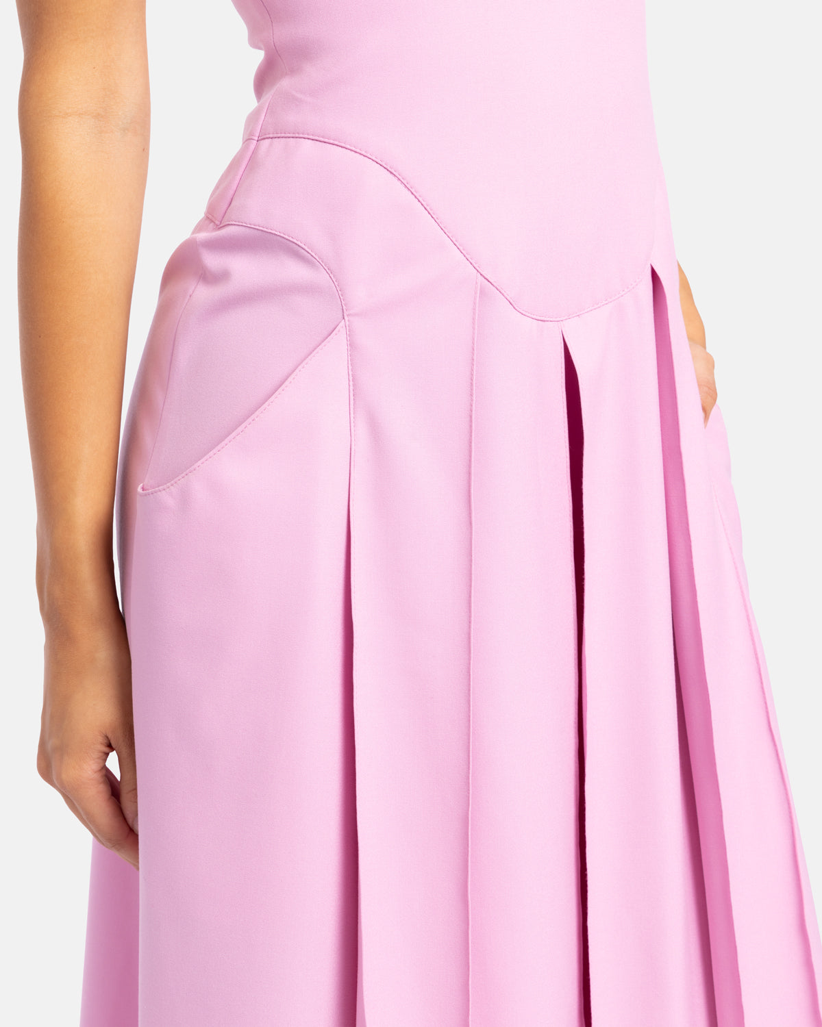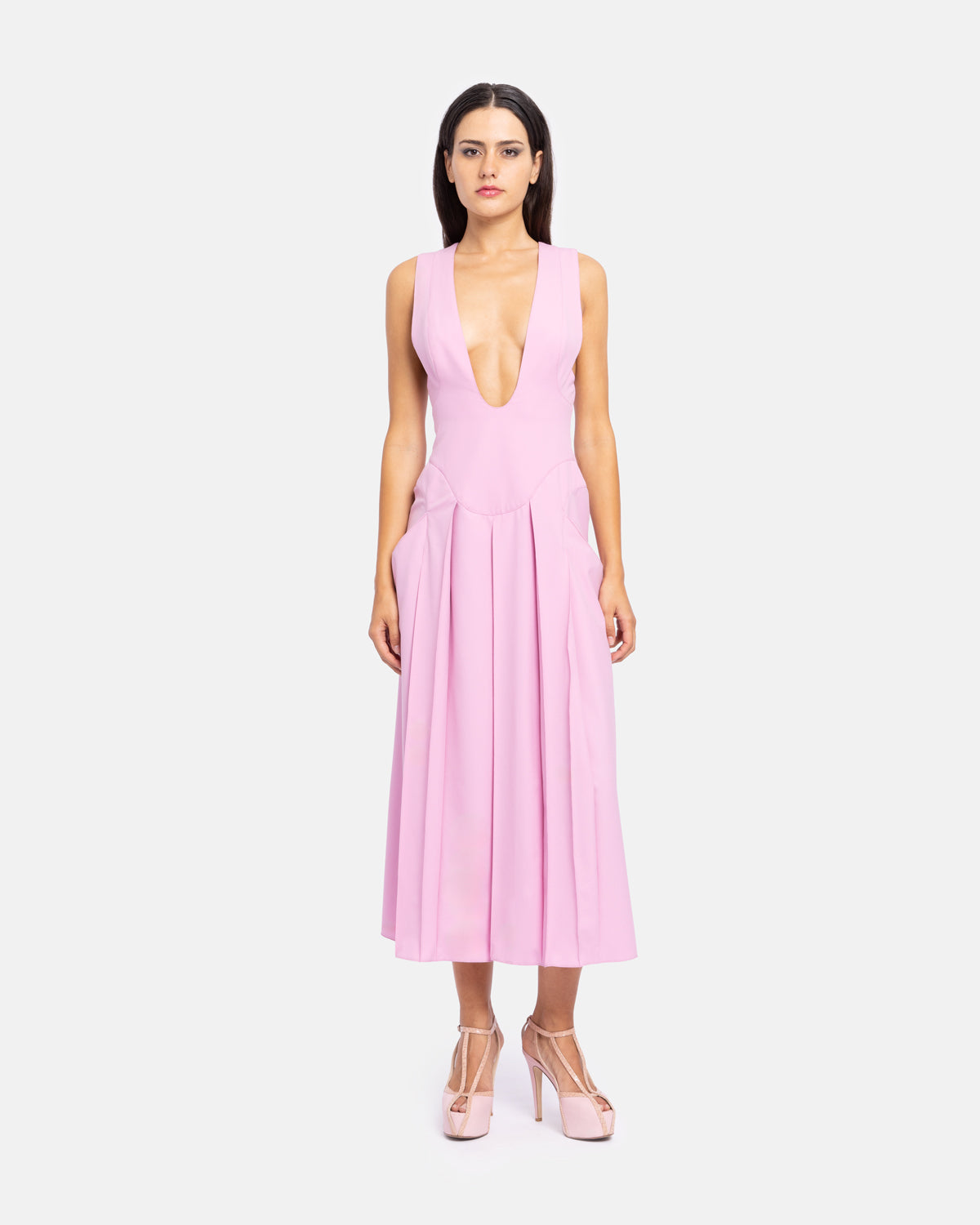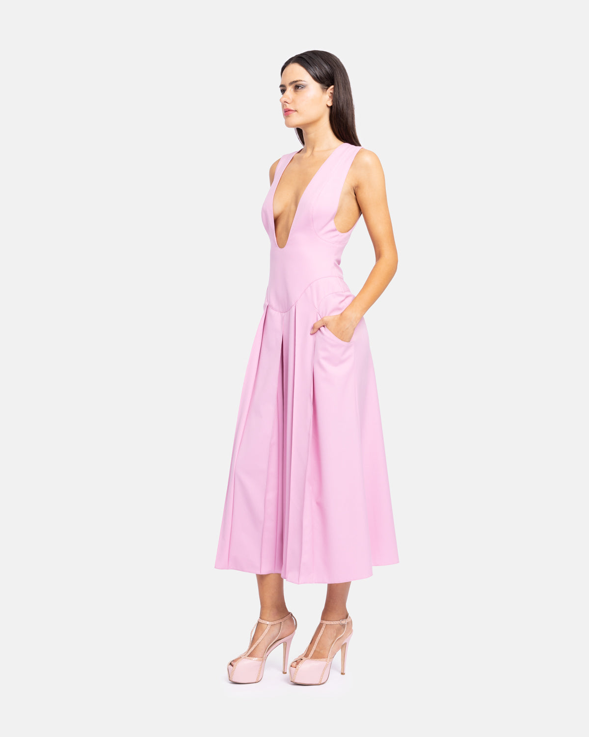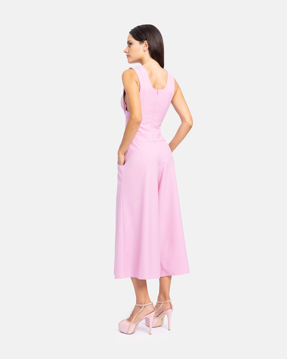 Midi jumpsuit, geometric with straps, pleats, and folds.