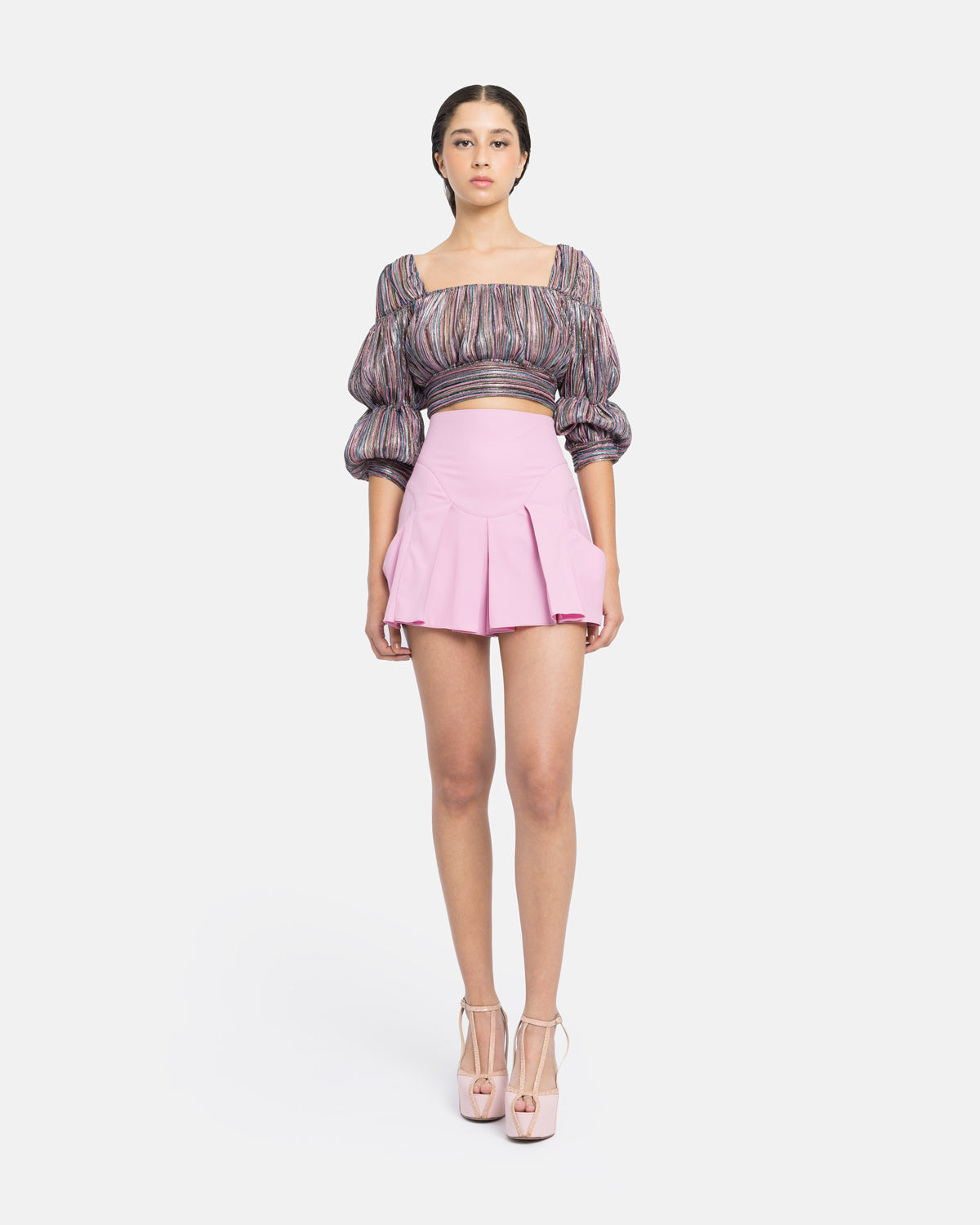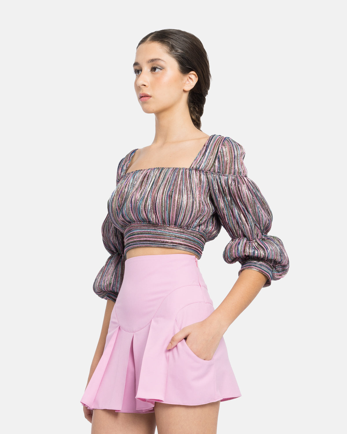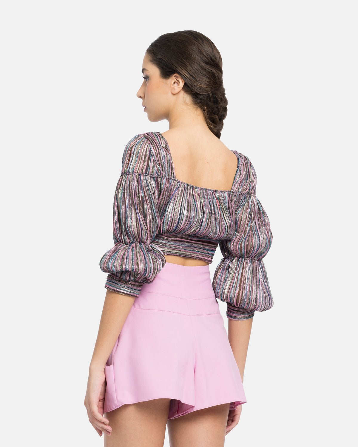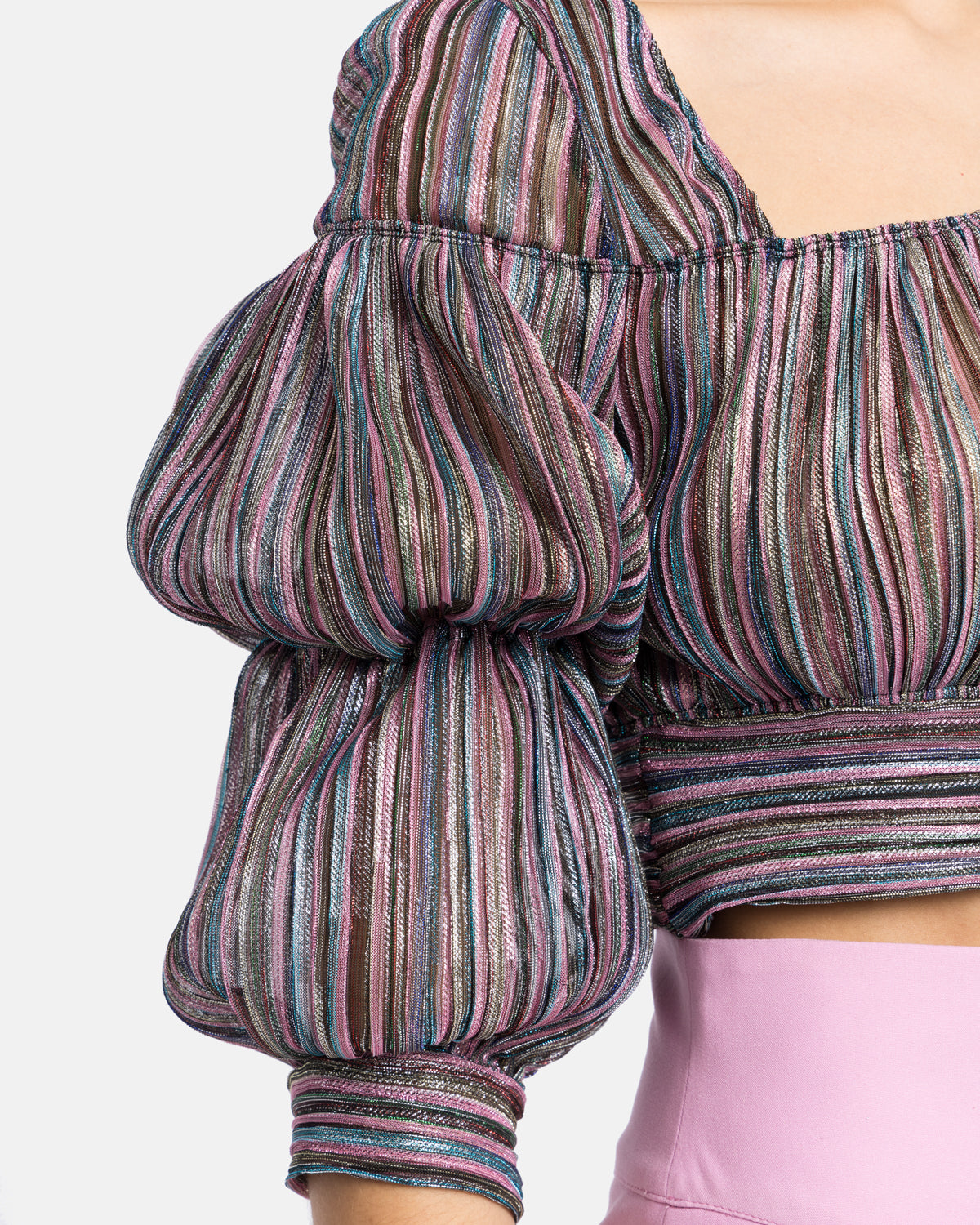 Top with a square neckline, double balloon sleeves, and a draped body.
