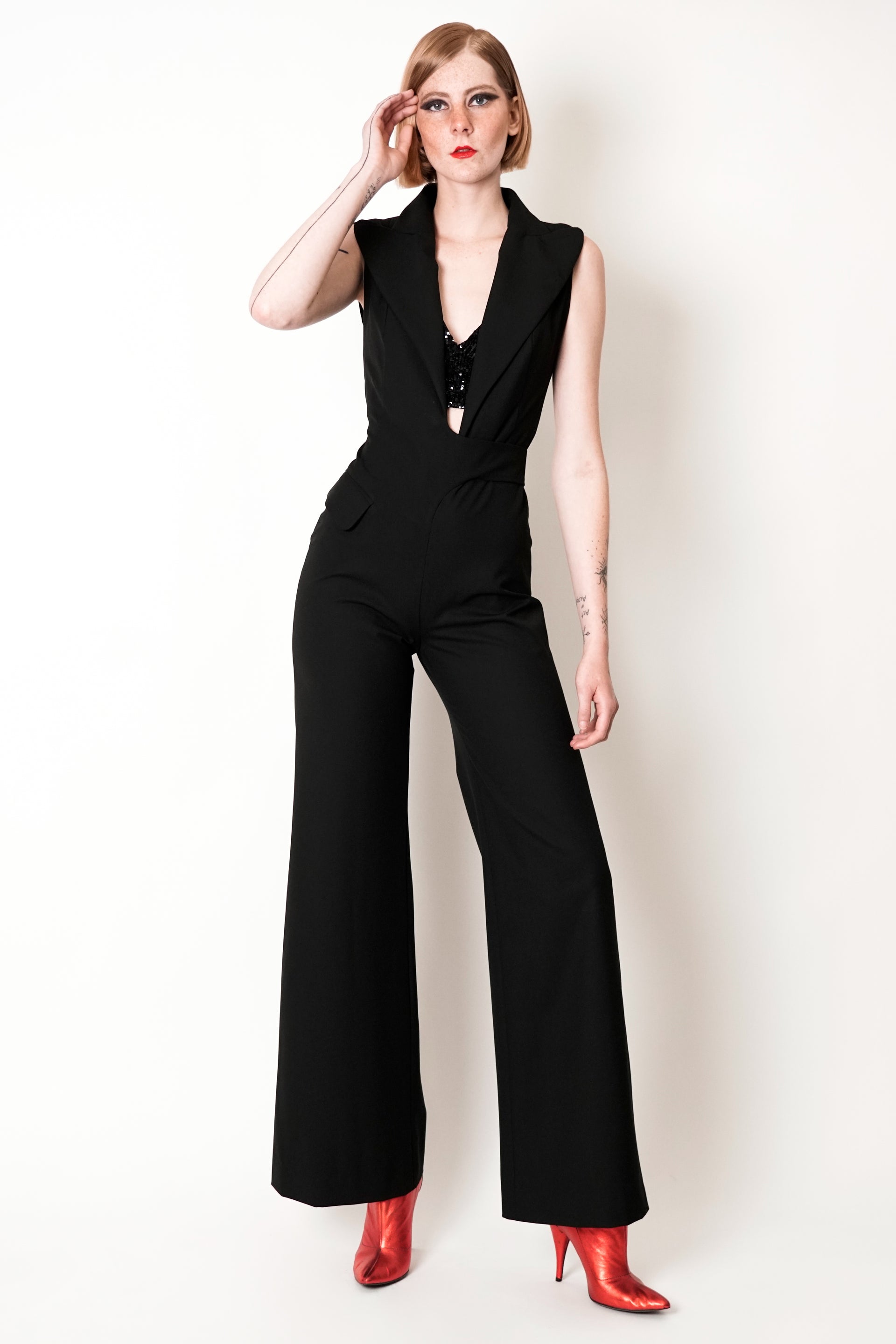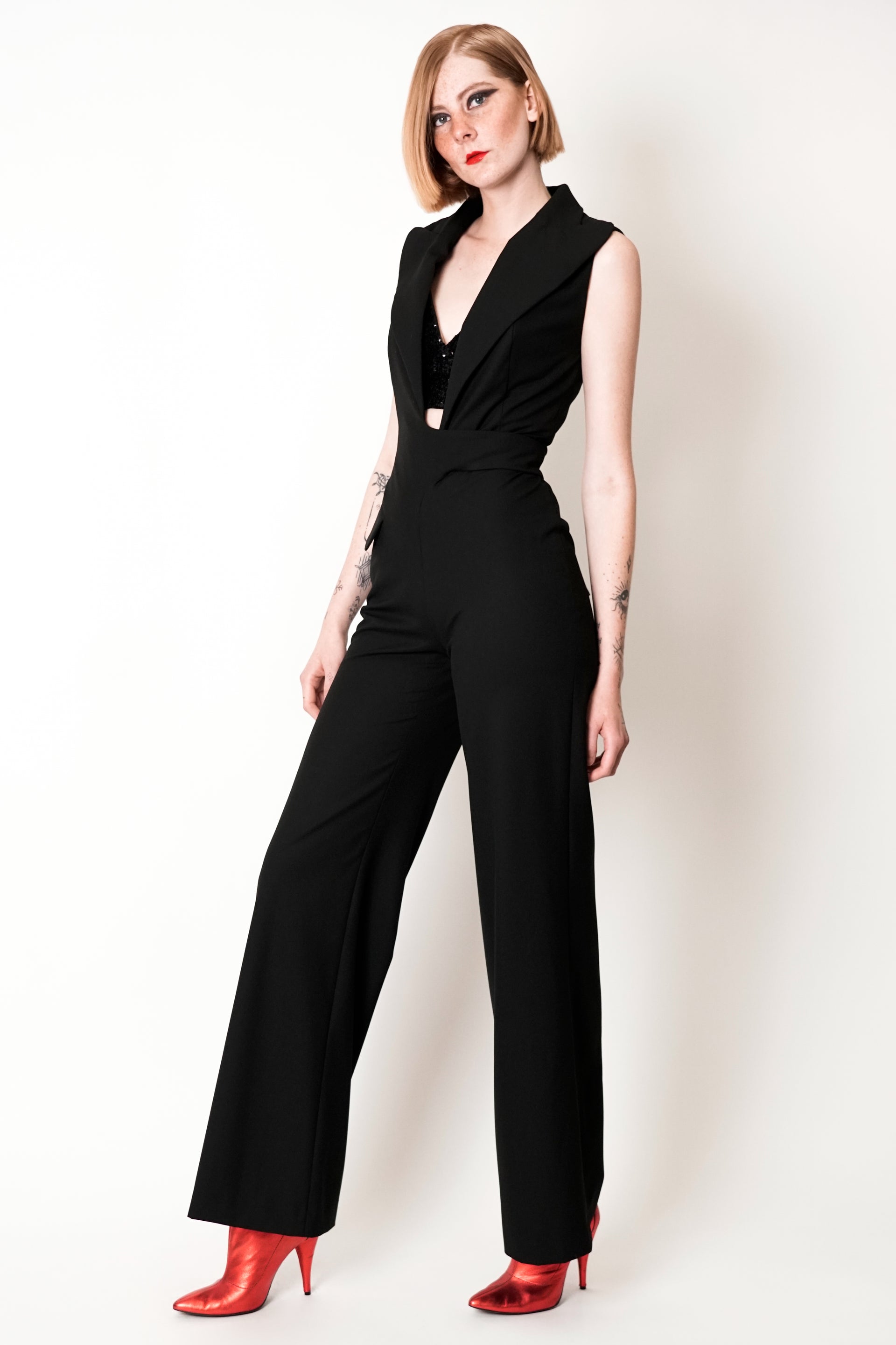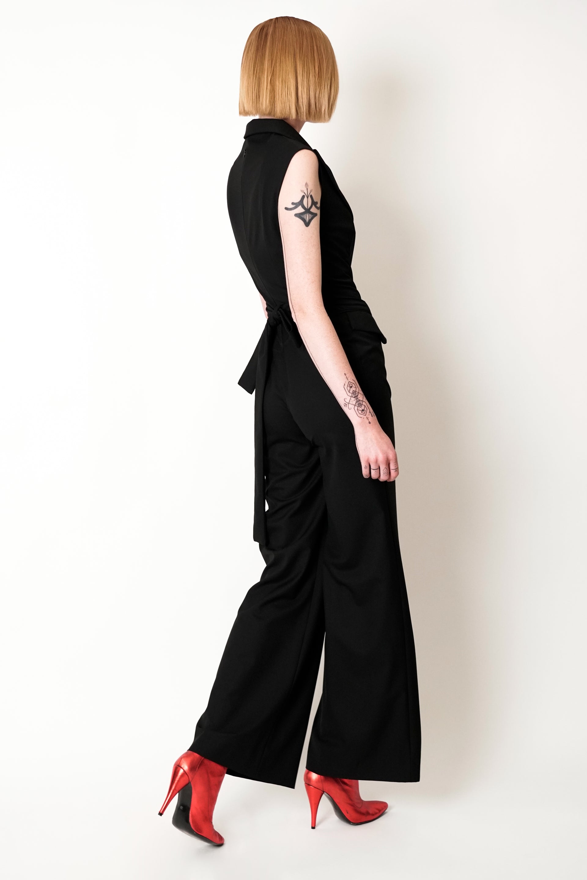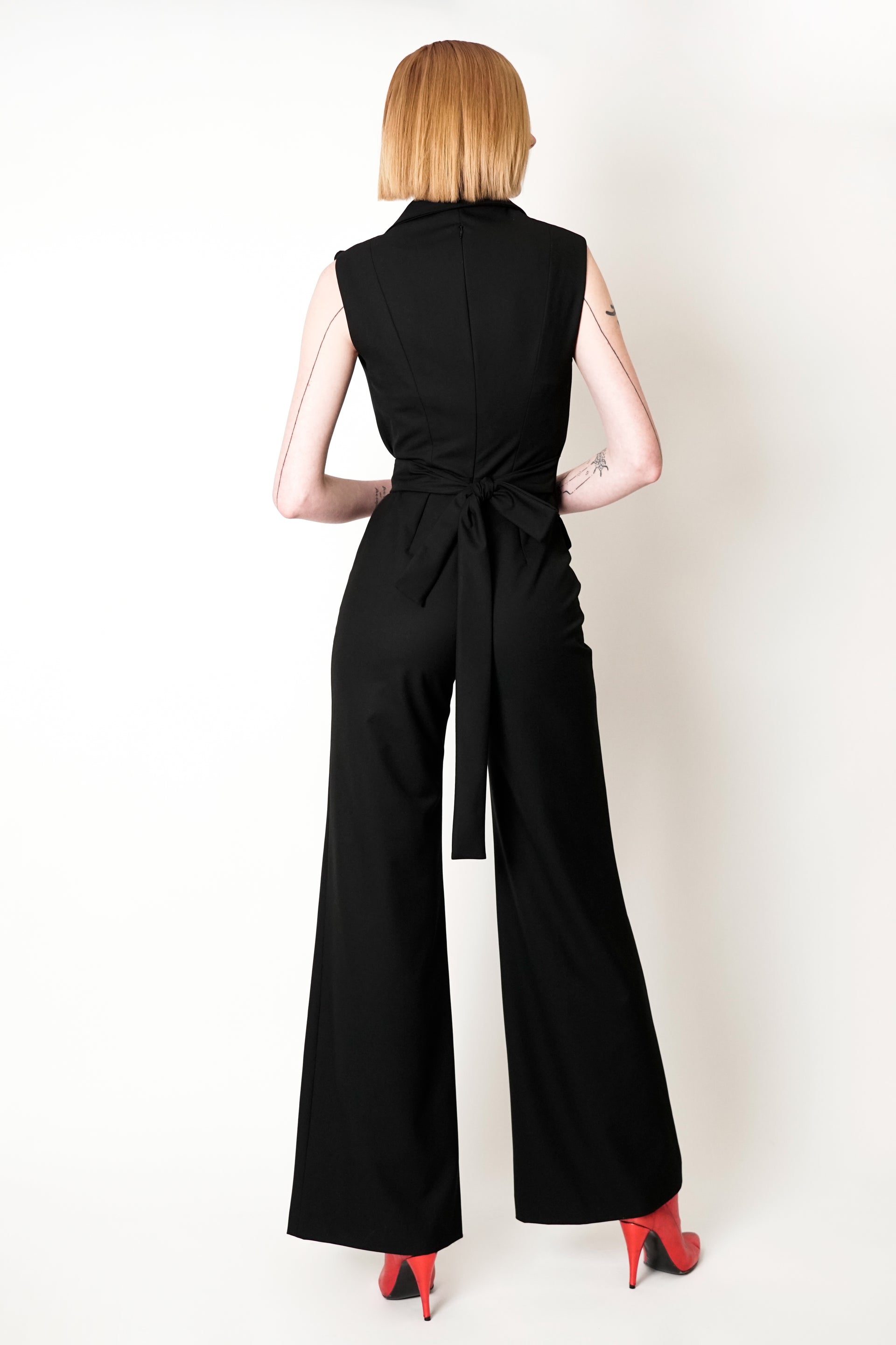 Jumpsuit with a wide and rounded collar and lapel in asymmetry at the front, broad shoulders in 80s style, sleeveless, and wide legs, fastens with a tie at the back.