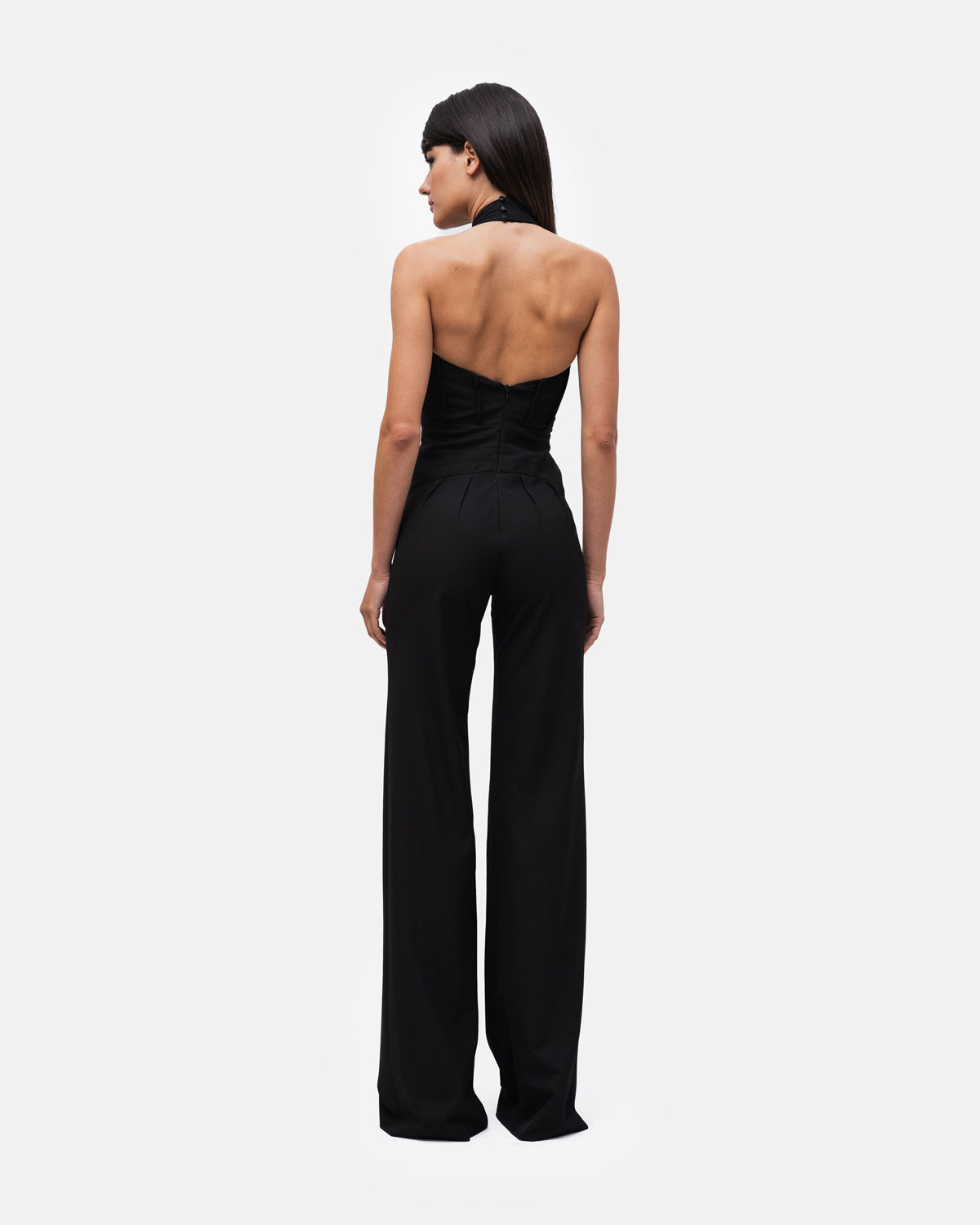 Jumpsuit with a high collar and a bare back, with a cut-out waist and multiple ribs forming a very graphic design