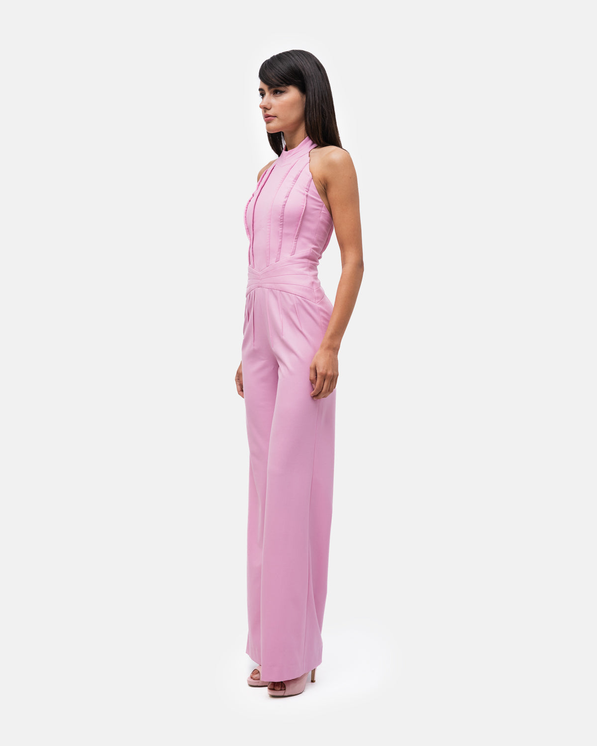 Jumpsuit with a high collar and a bare back, with a cut-out waist and multiple ribs forming a very graphic design