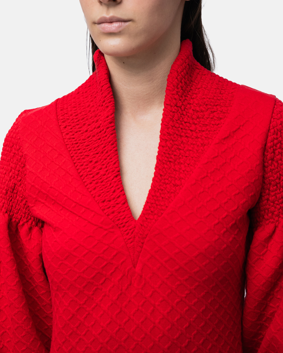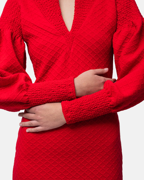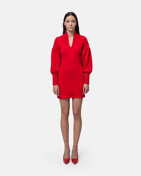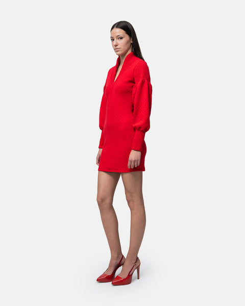Short fitted Dress, V-neckline, long balloon sleeves and collar with elastic stitching