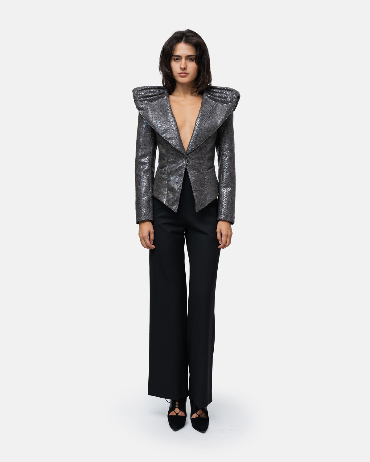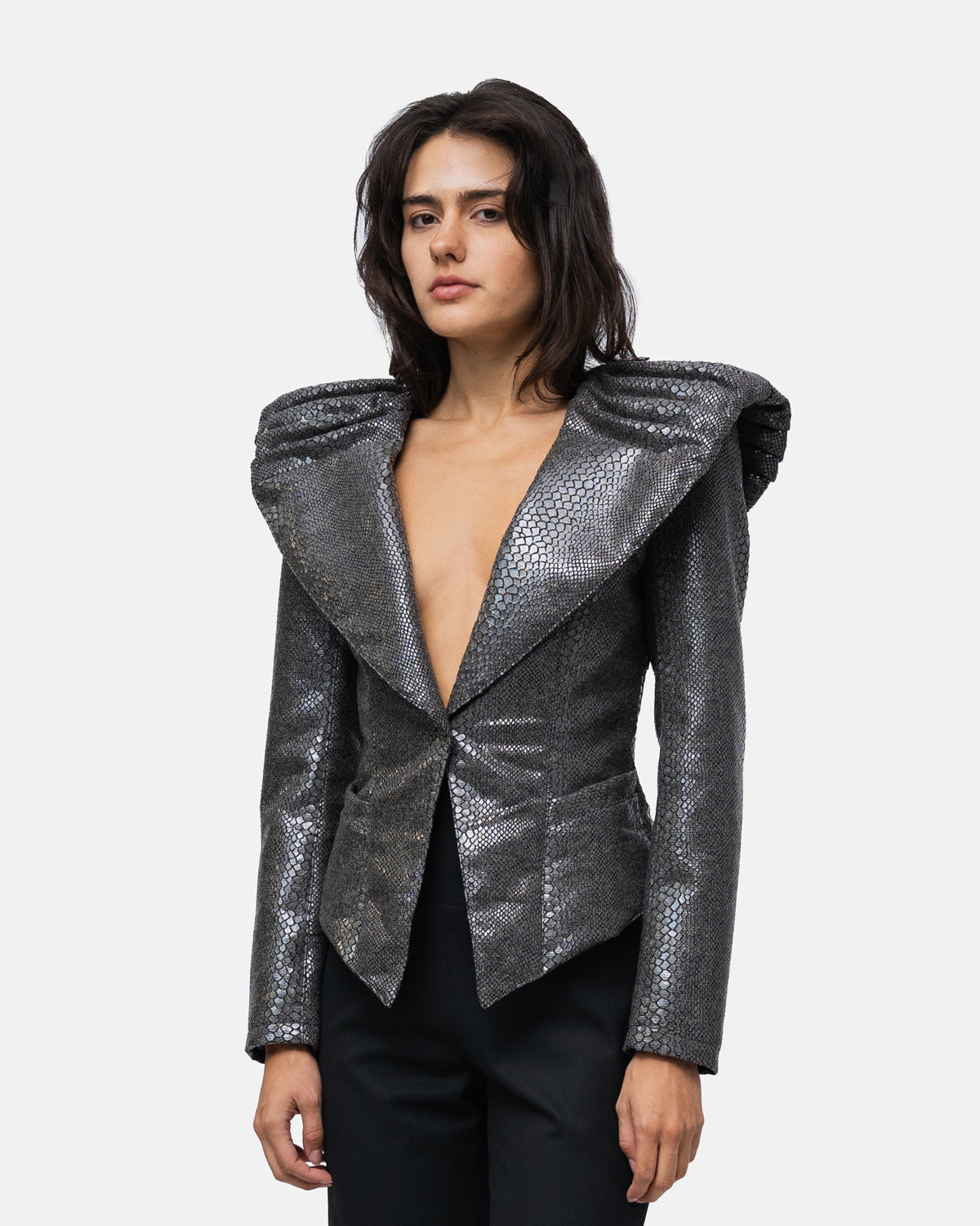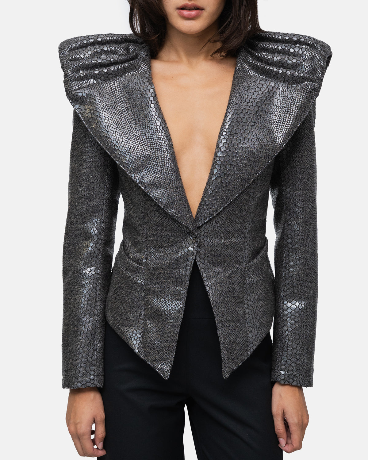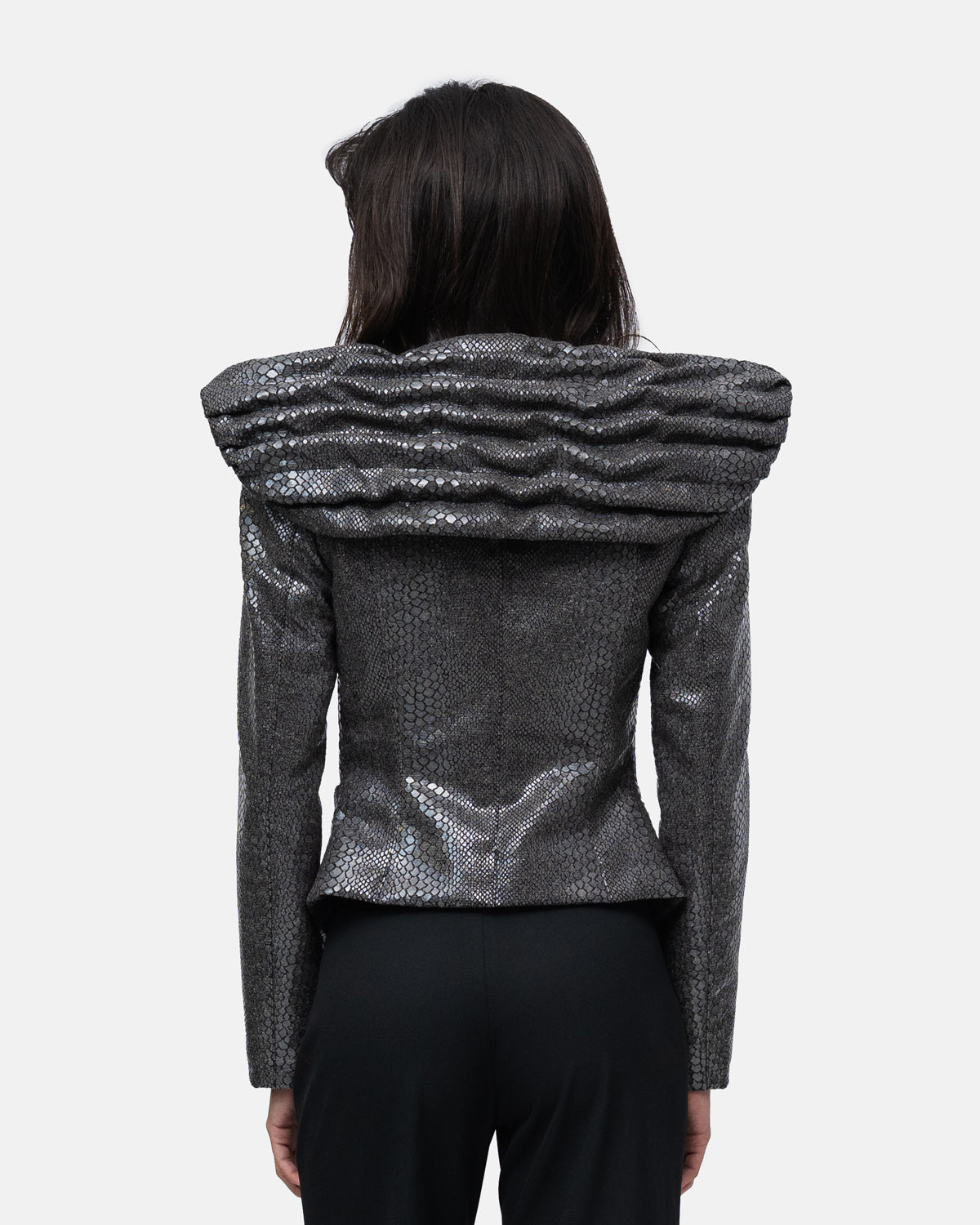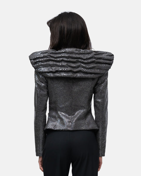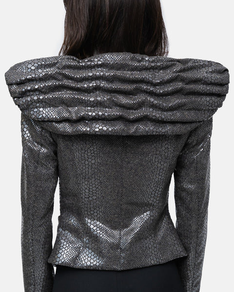 Belted blazer with high, broad shoulders and a draped collar with a cape effect at the back, in wool with snake print,