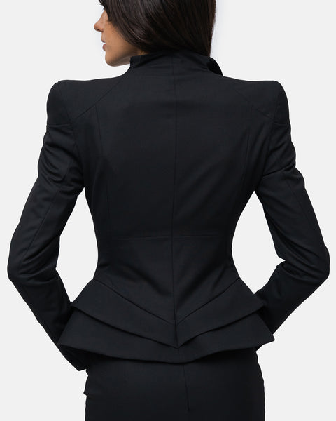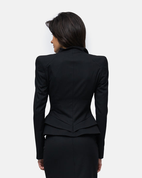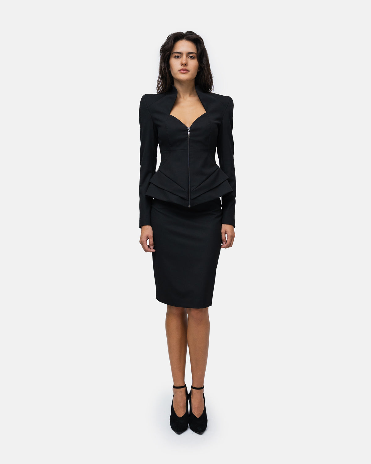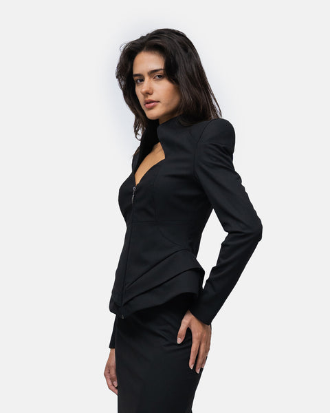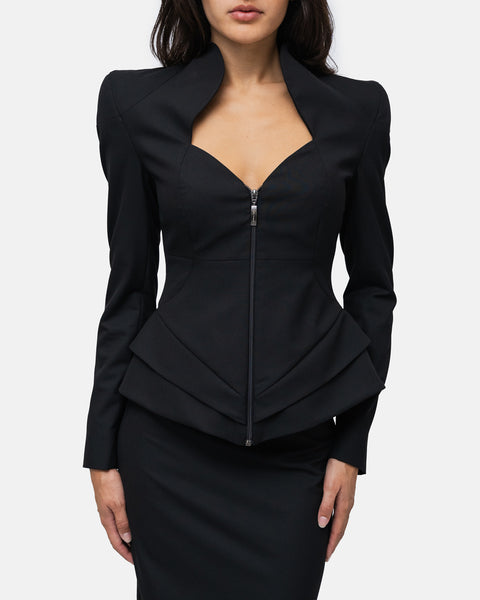 Blazer with broad, raised shoulders, sweetheart neckline, zip fastening, defined waist and pronounced hips with double graphic pleats.