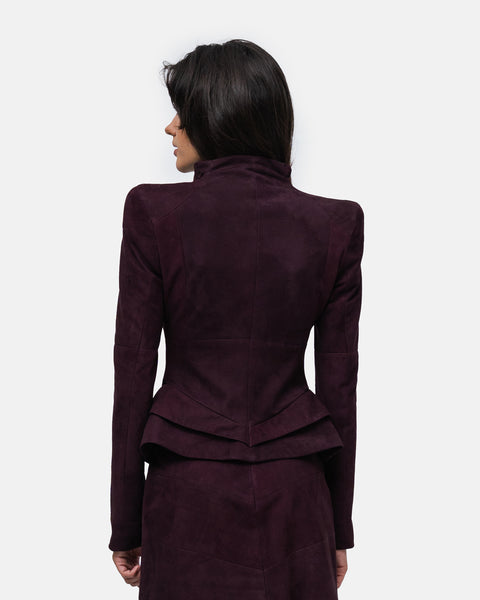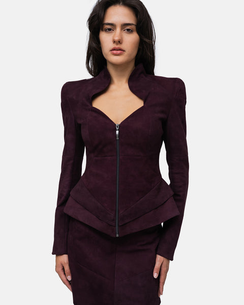 Suede blazer with broad, raised shoulders, sweetheart neckline, zip fastening, defined waist and pronounced hips with double graphic pleats.