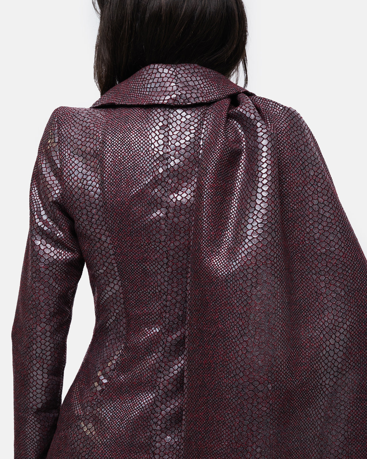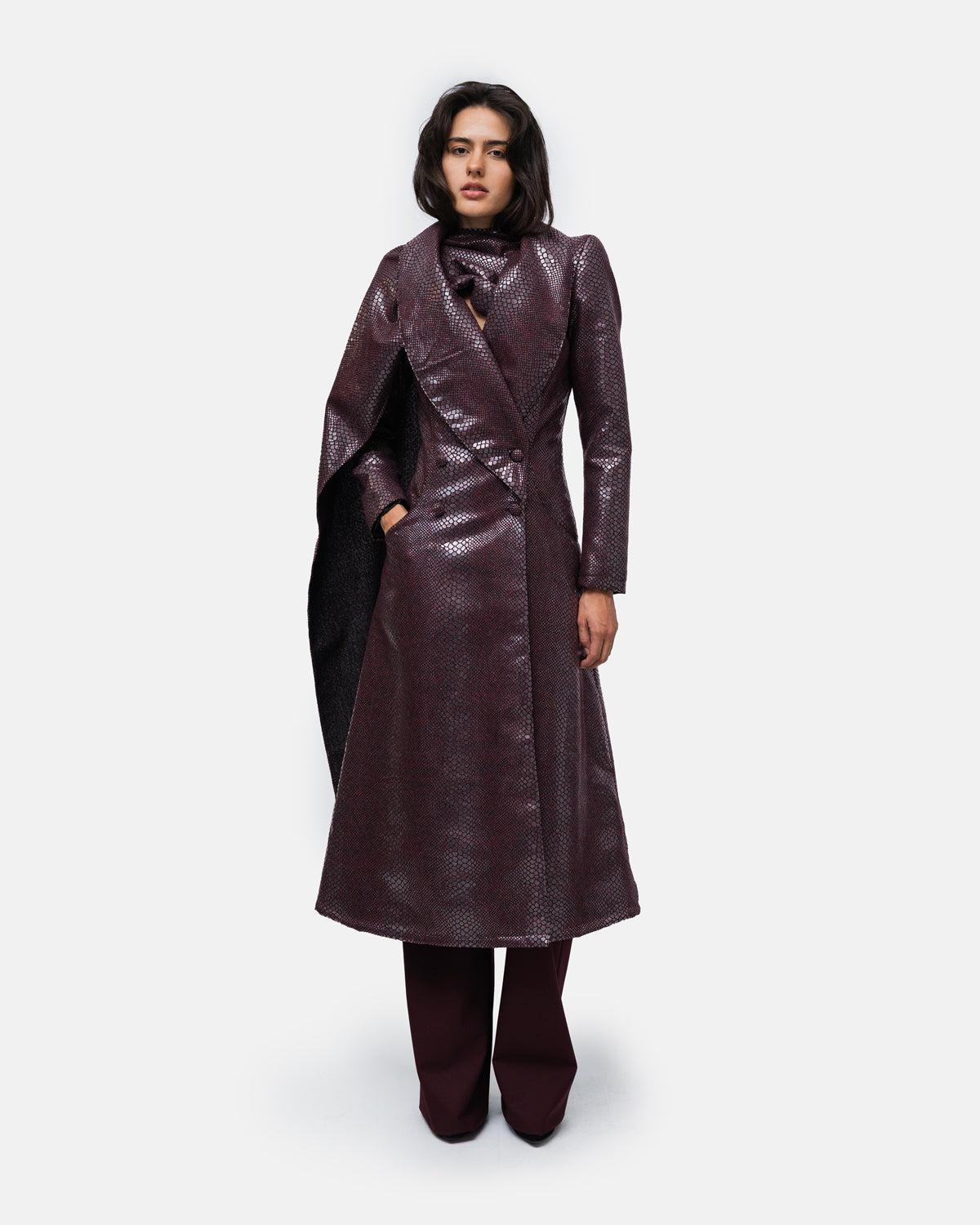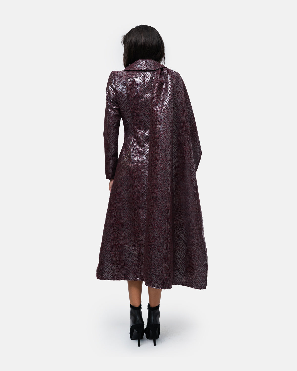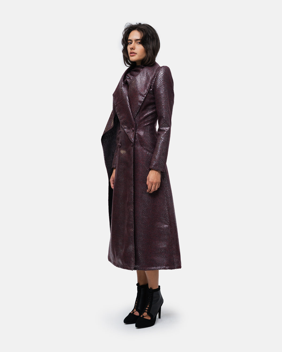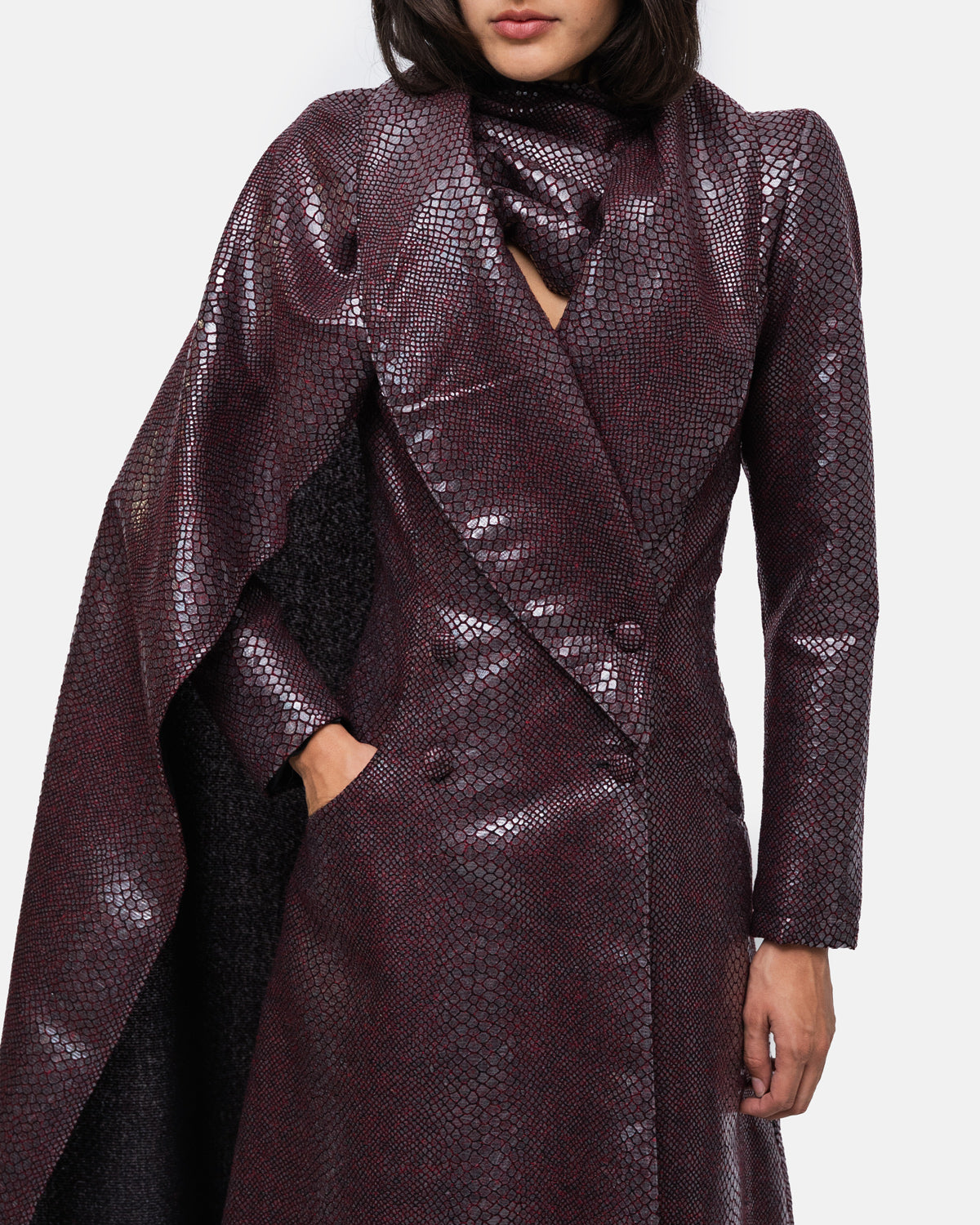 Long wool Coat with snake print, double-breasted with wide collar and long scarf coming out of the collar