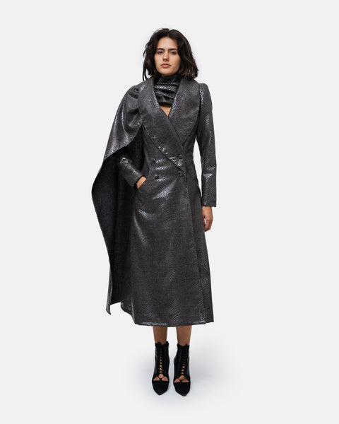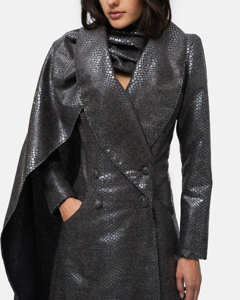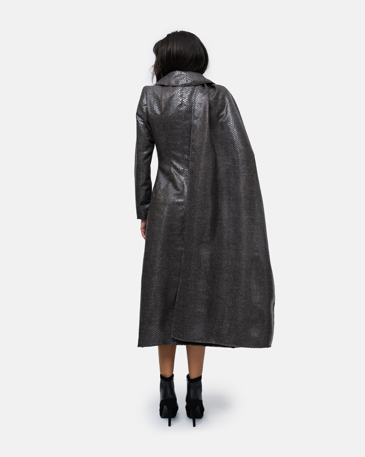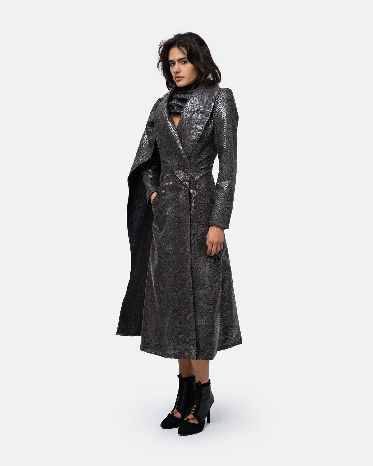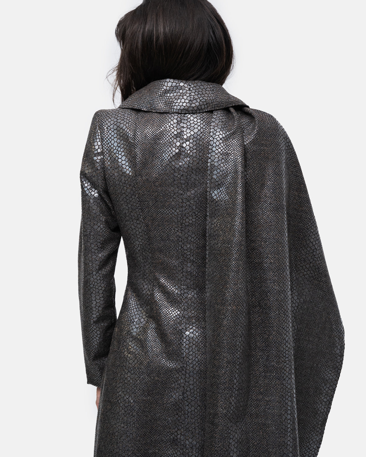 Long wool Coat with snake print, double-breasted with wide collar and long scarf coming out of the collar