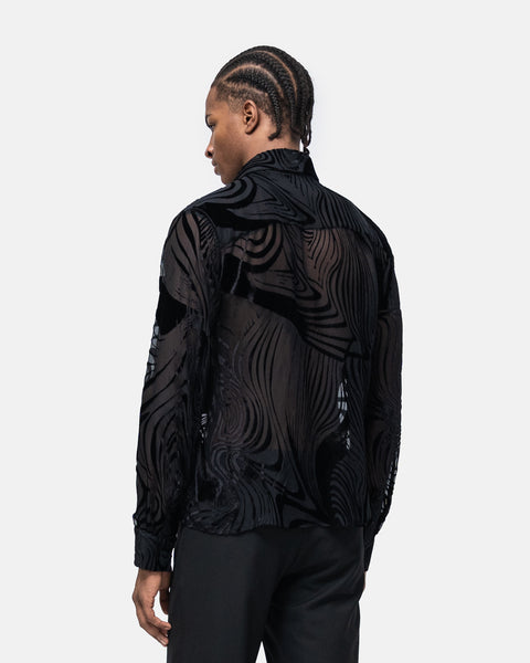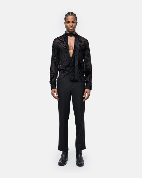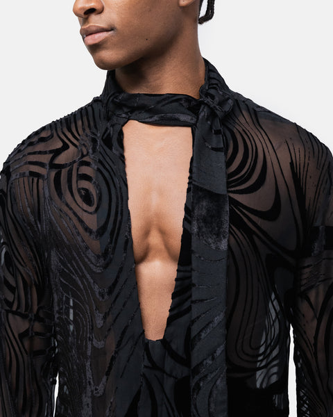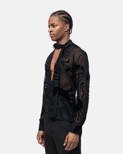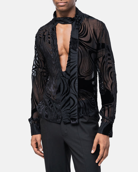 Silk pattern graphic shirt with asymmetrical built-in strap with side tie effect