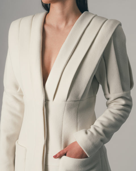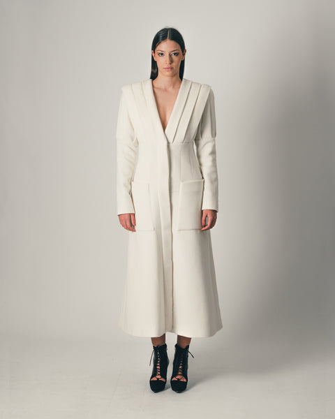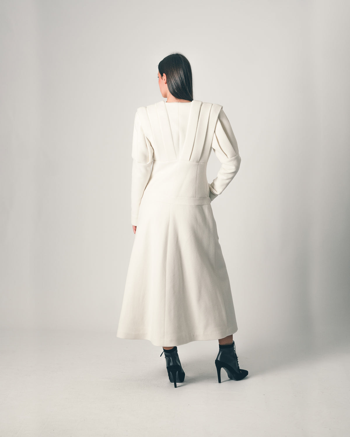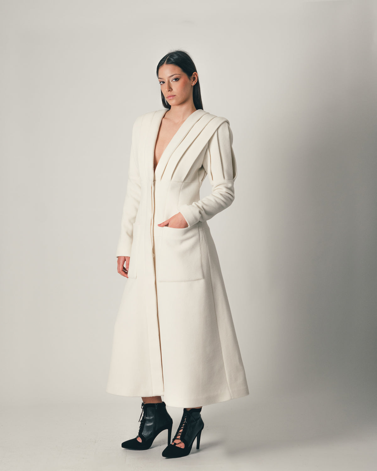 Long coat in pure wool with graphic design, with wide pleats on the upper body and sleeves and a defined waistline