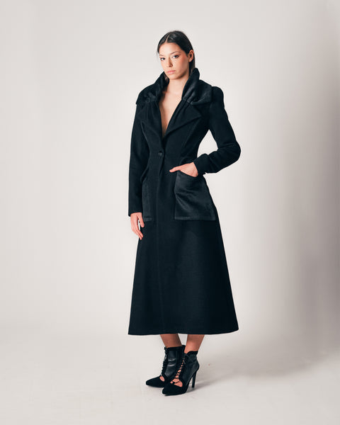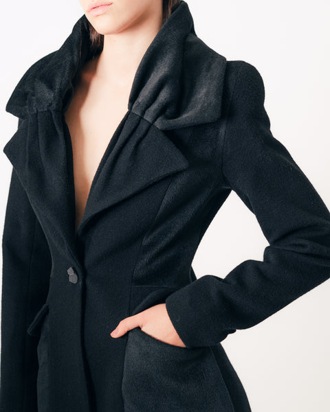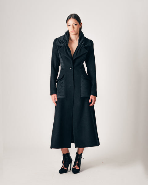 Long coat mix wool | Alpaca, a graphic draped collar in a flower shape and a defined waistline.