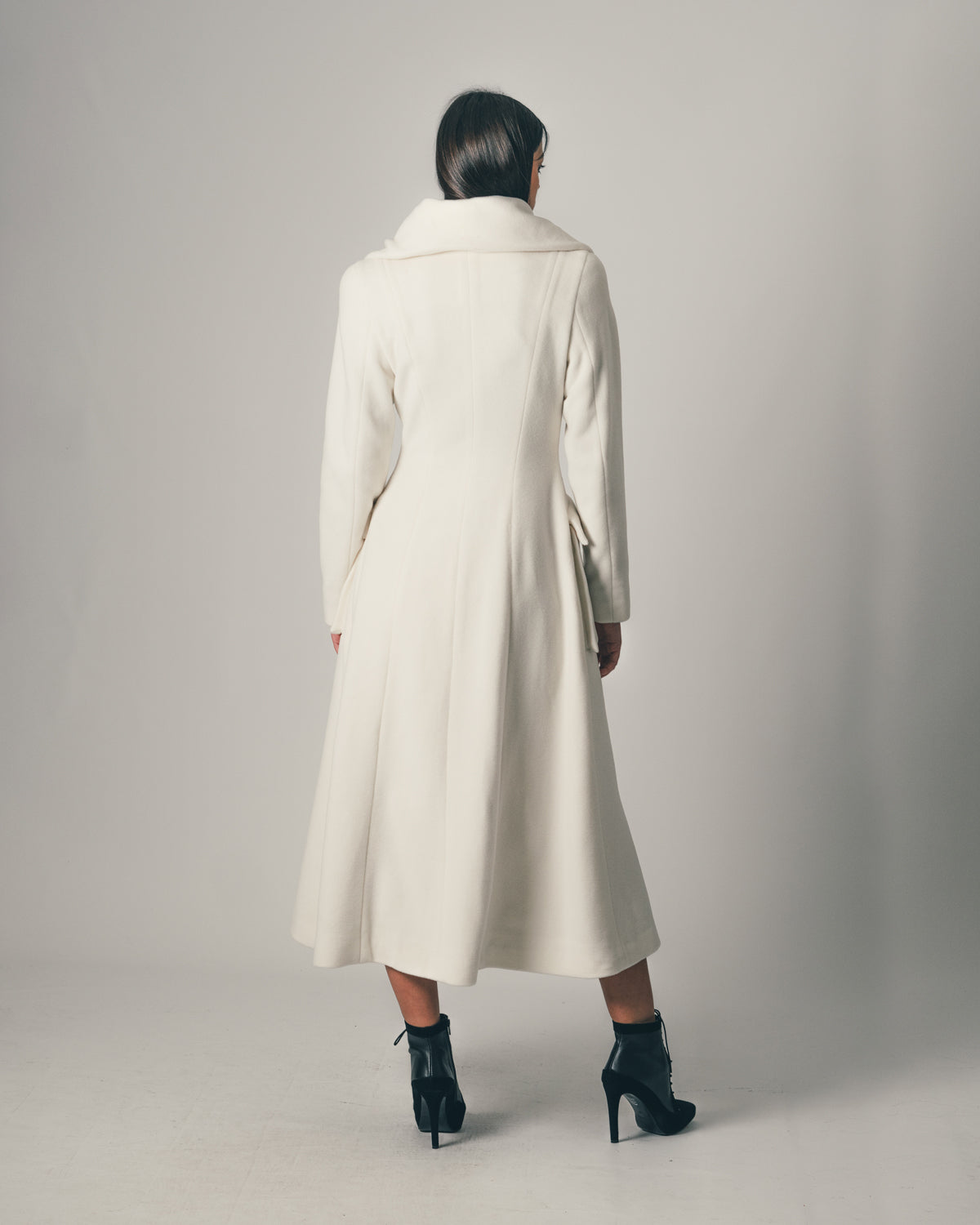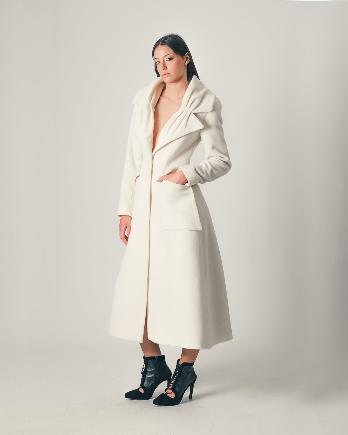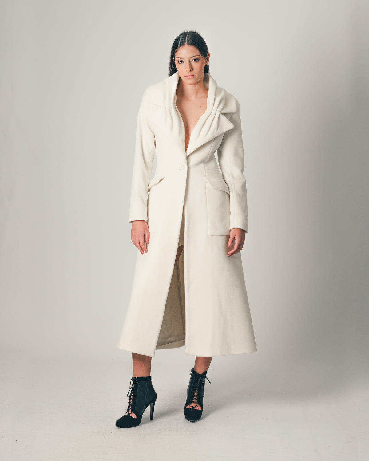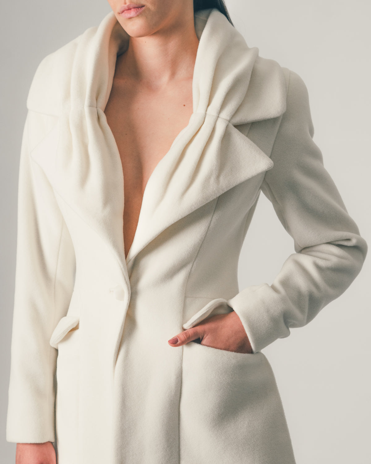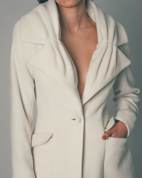 Long coat in pure wool with a graphic draped collar in a flower shape and a defined waistline.