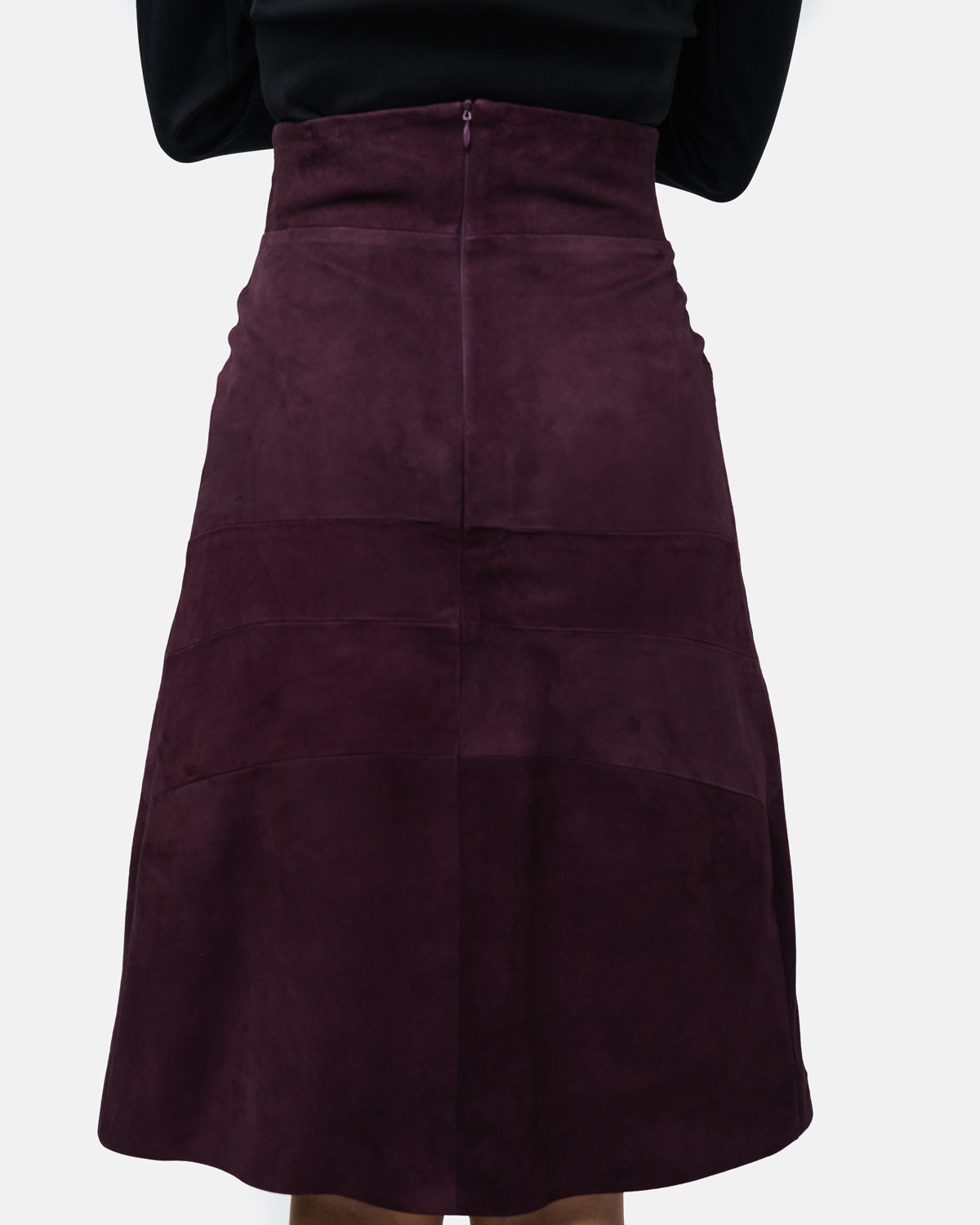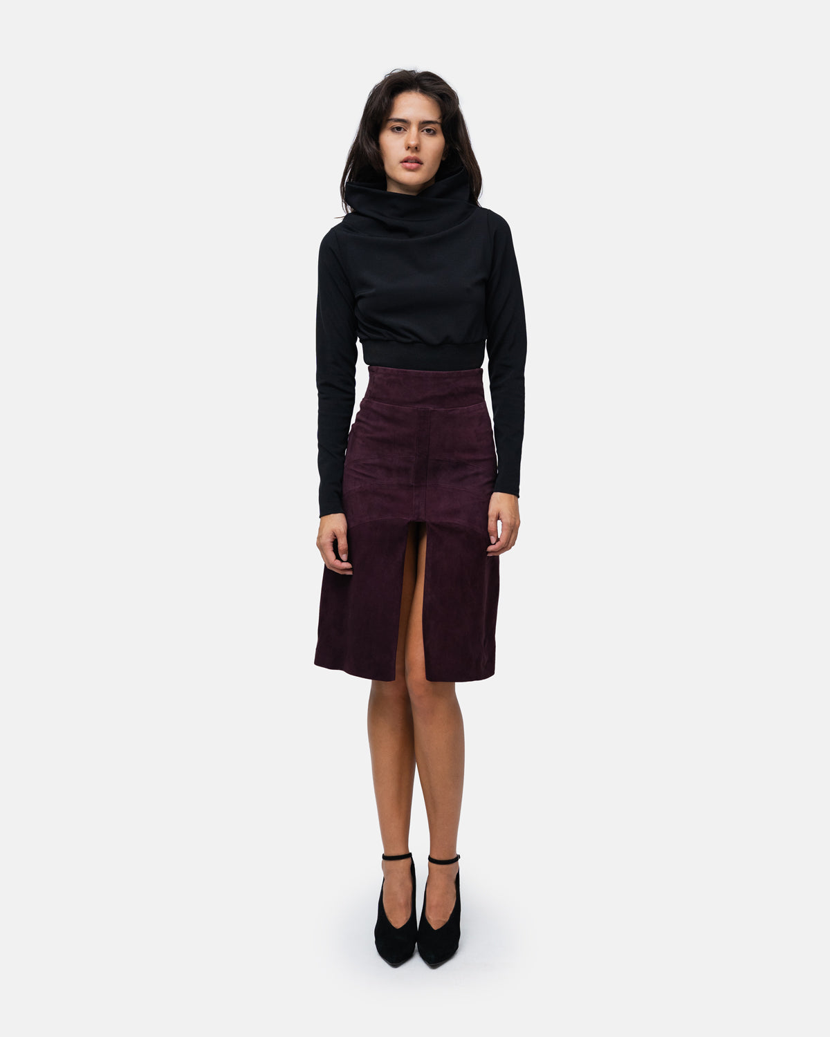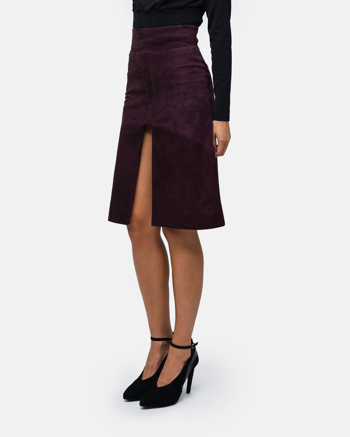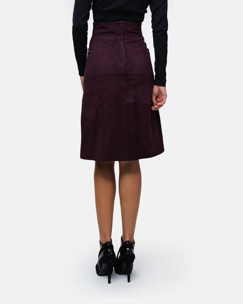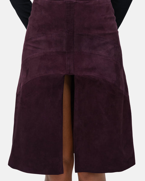 Knee-length suede skirt with high waist, graphic design and front slit