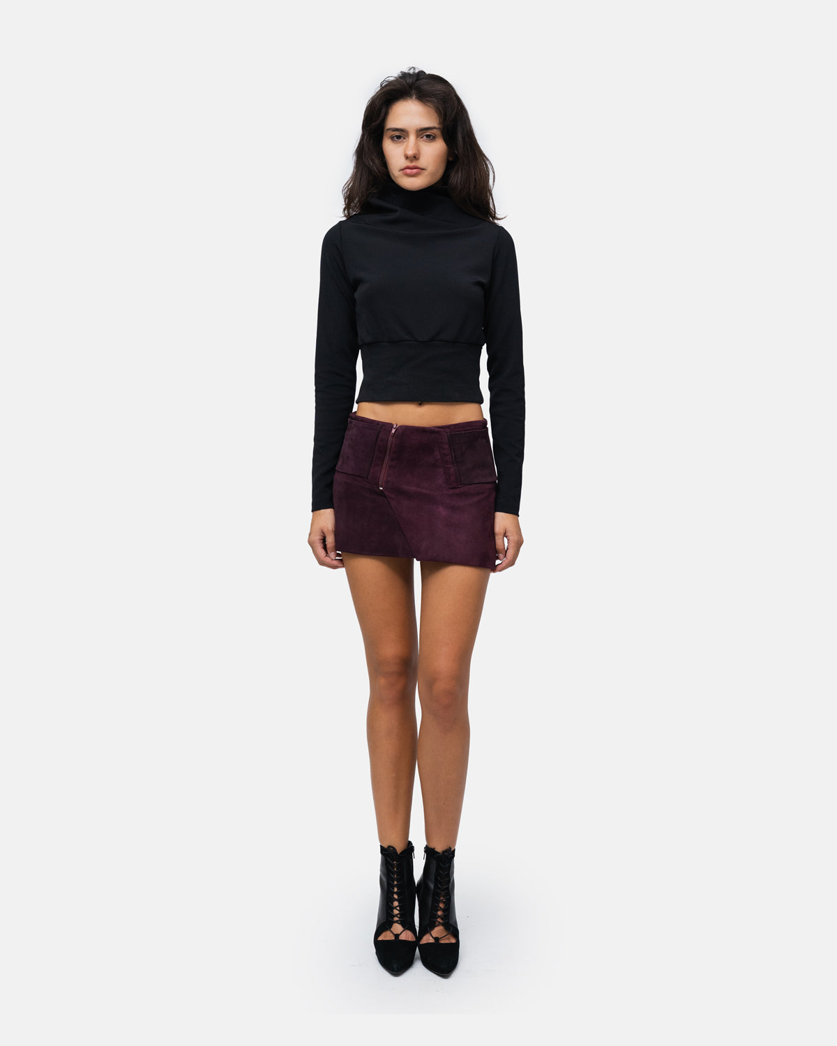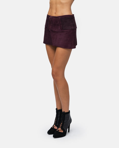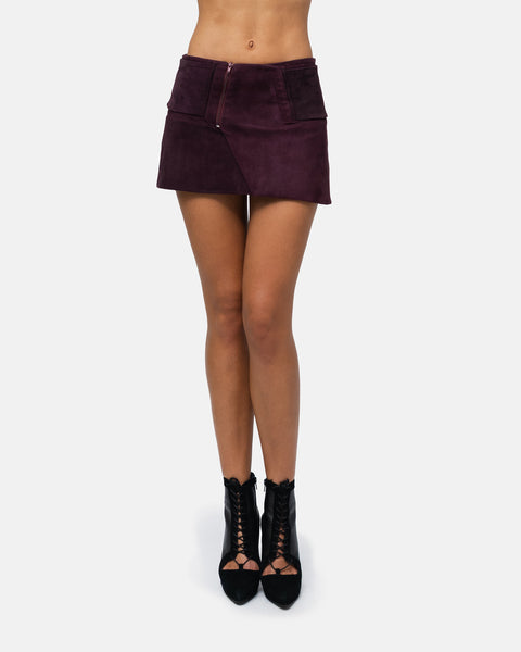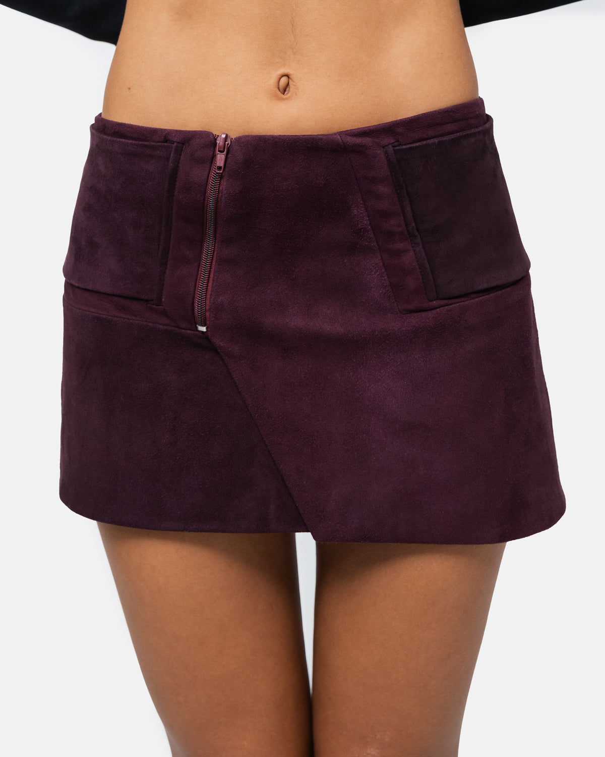 Asymmetrical suede mini skirt with wide belt.