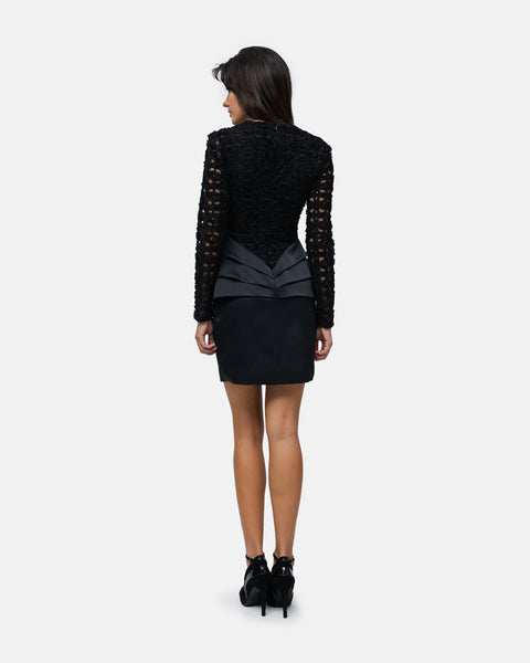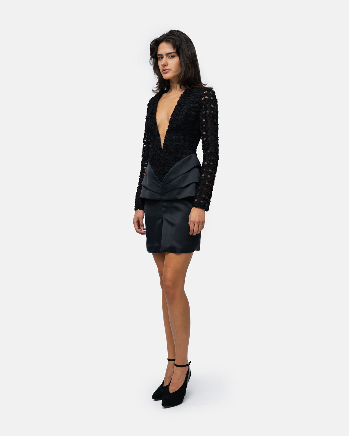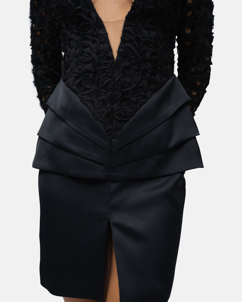 V-neck Dress with lace bodice and long sleeves, skirt with graphic pleats and front slit