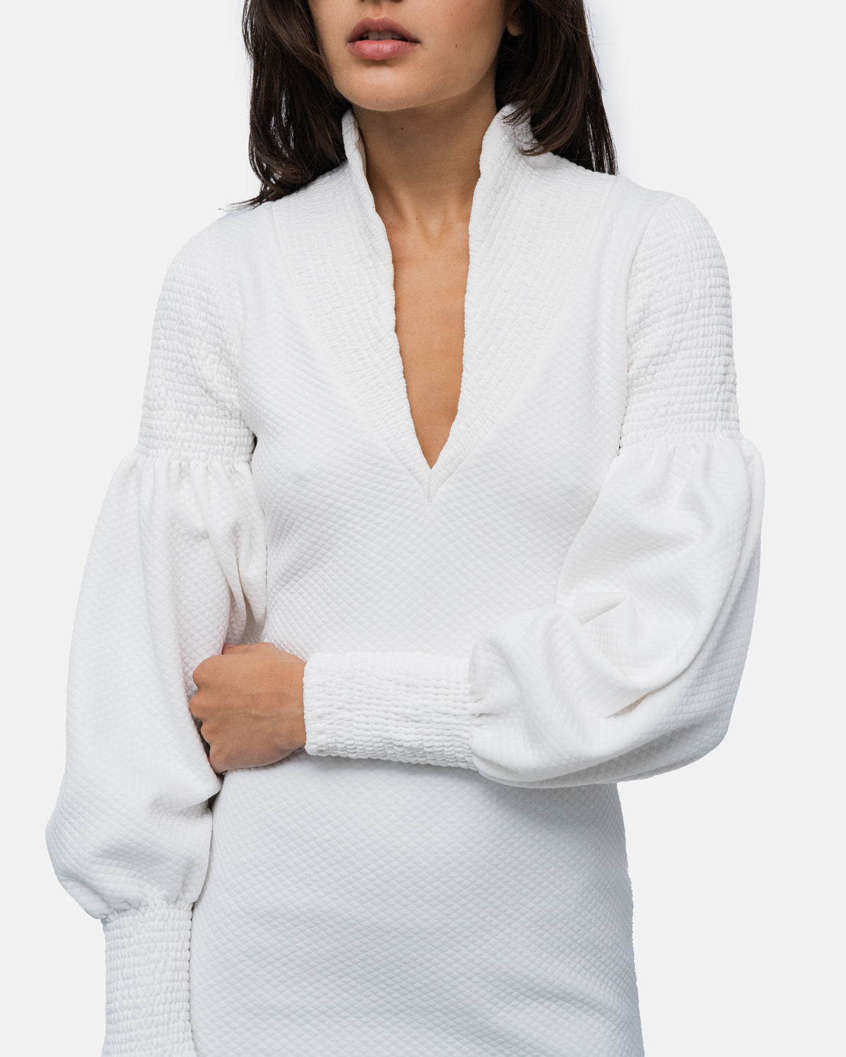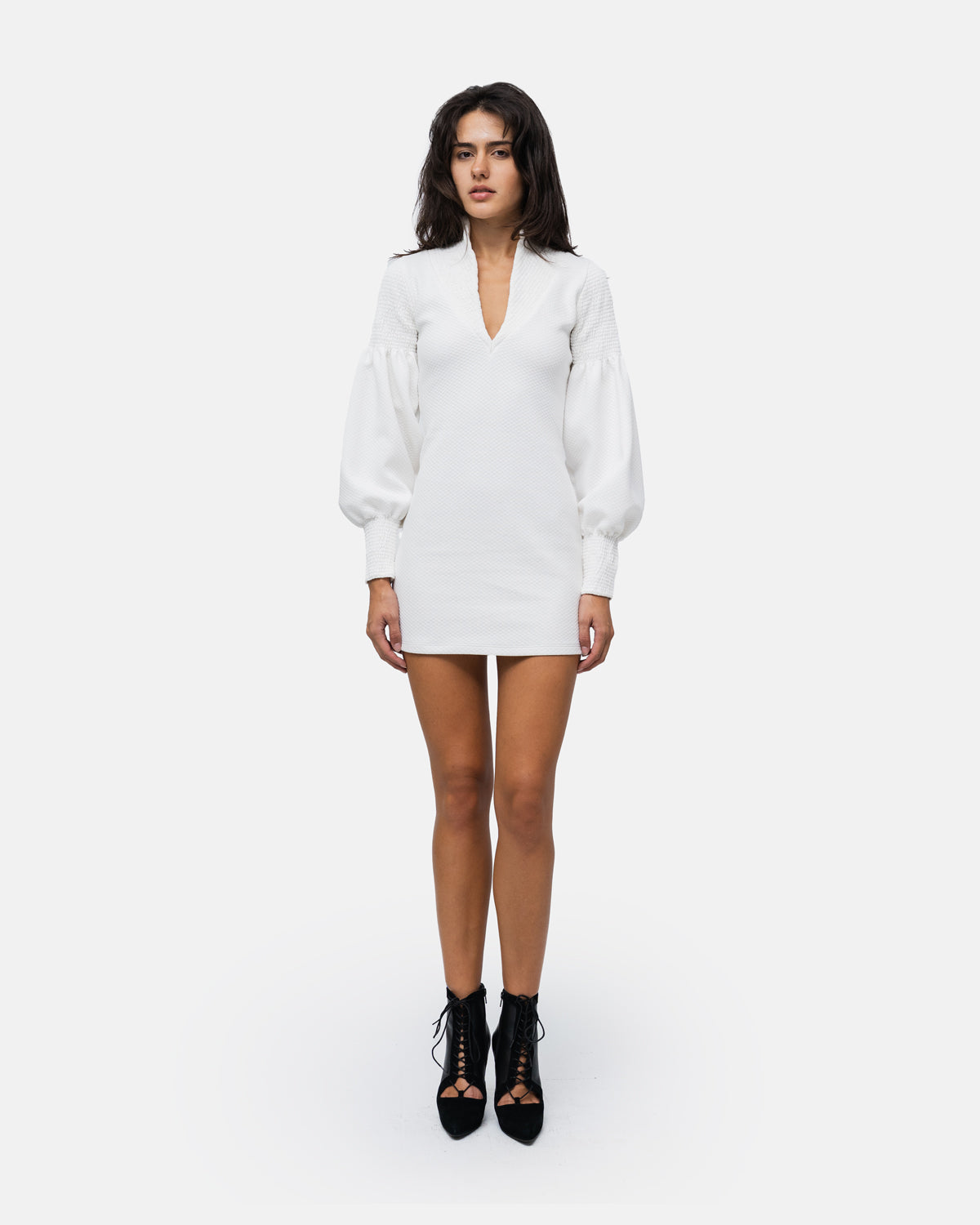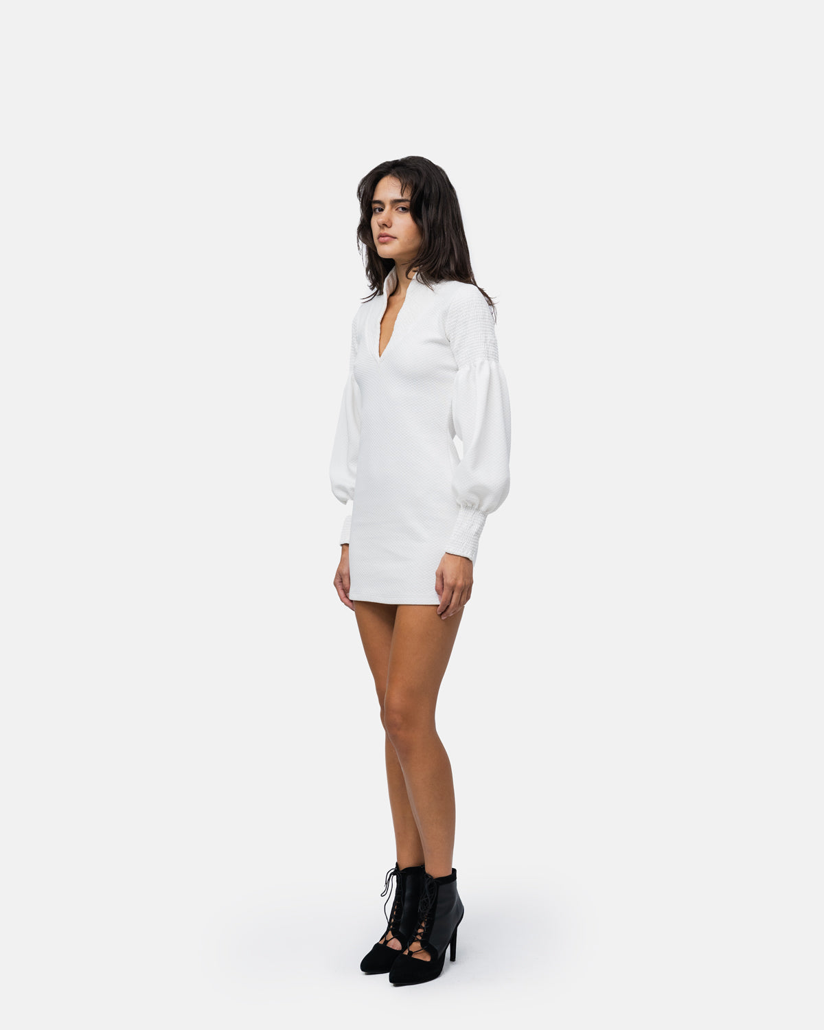 Short fitted Dress, V-neckline, long balloon sleeves and collar with elastic stitching