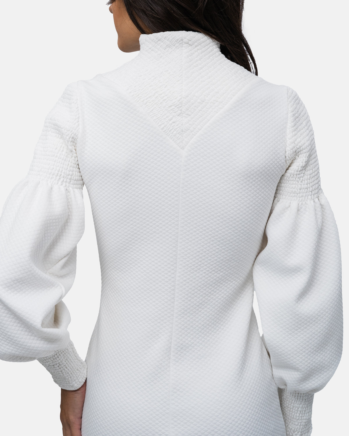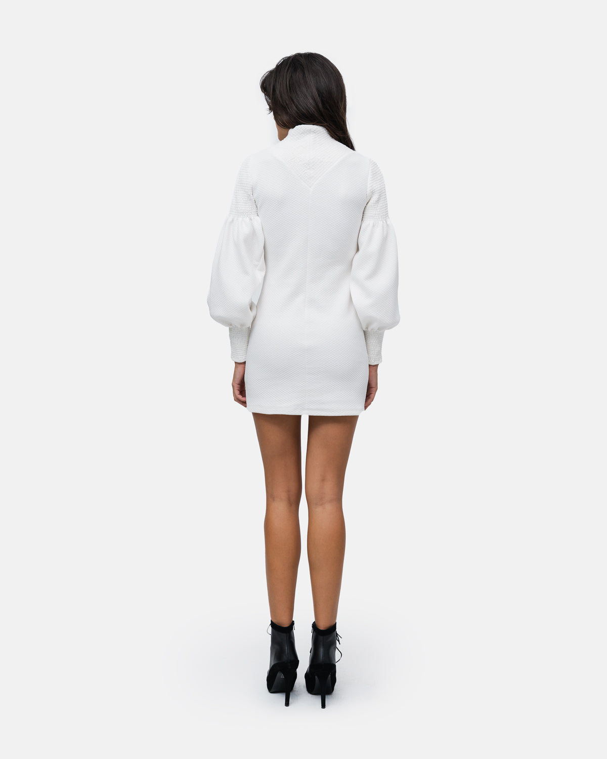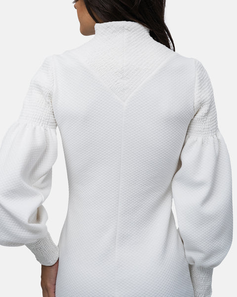 Short fitted Dress, V-neckline, long balloon sleeves and collar with elastic stitching