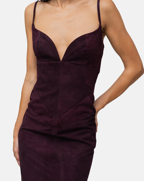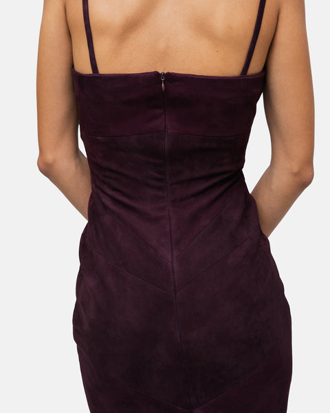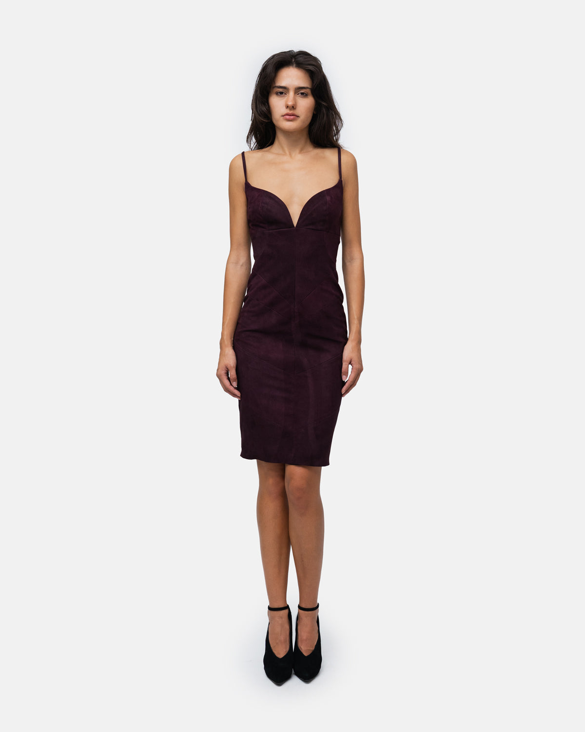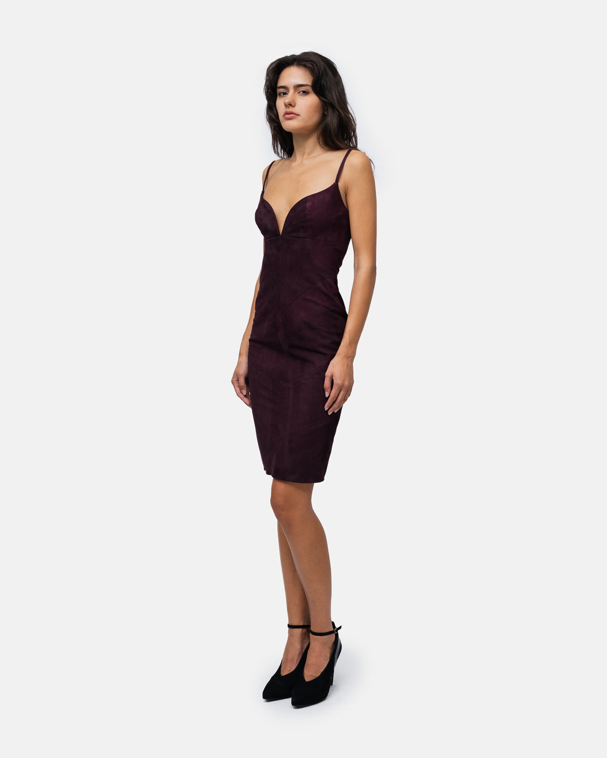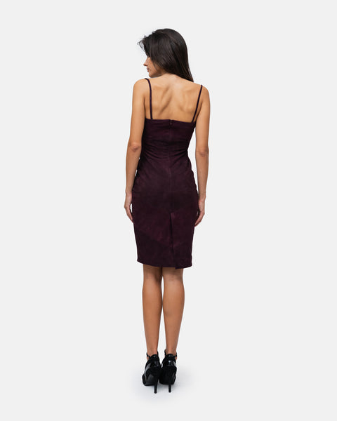 Graphic patchwork dress, fitted suede knee-length with princess neckline and straps