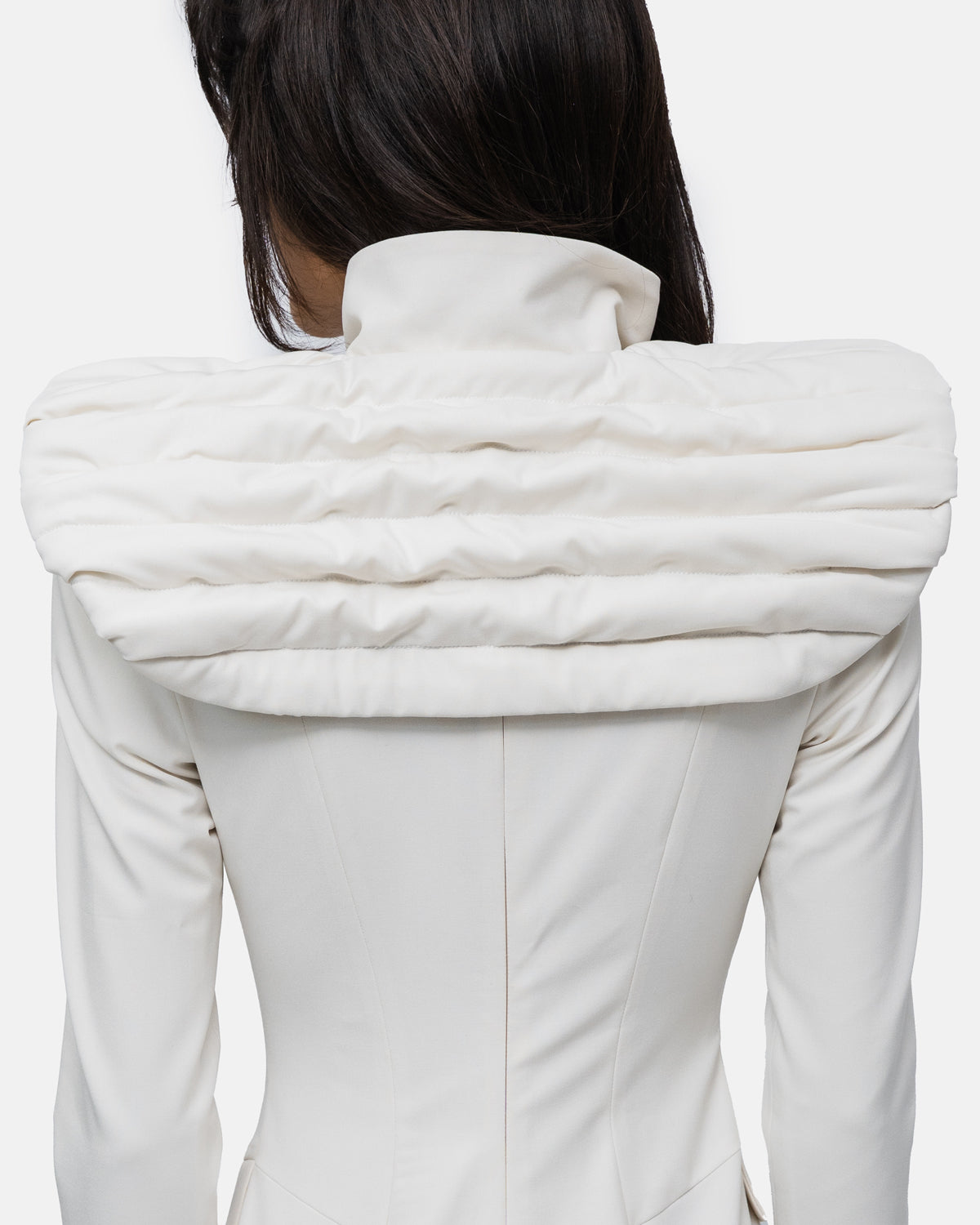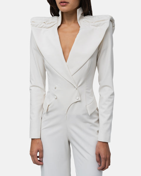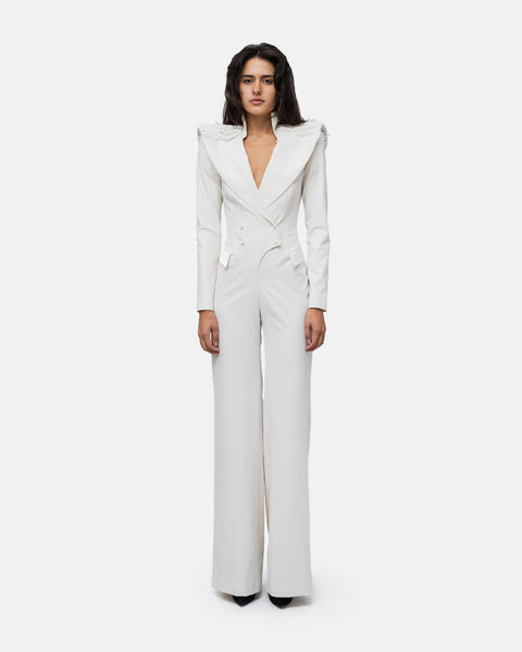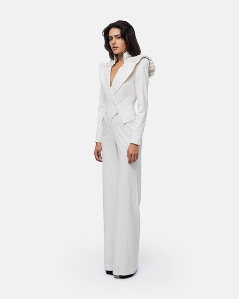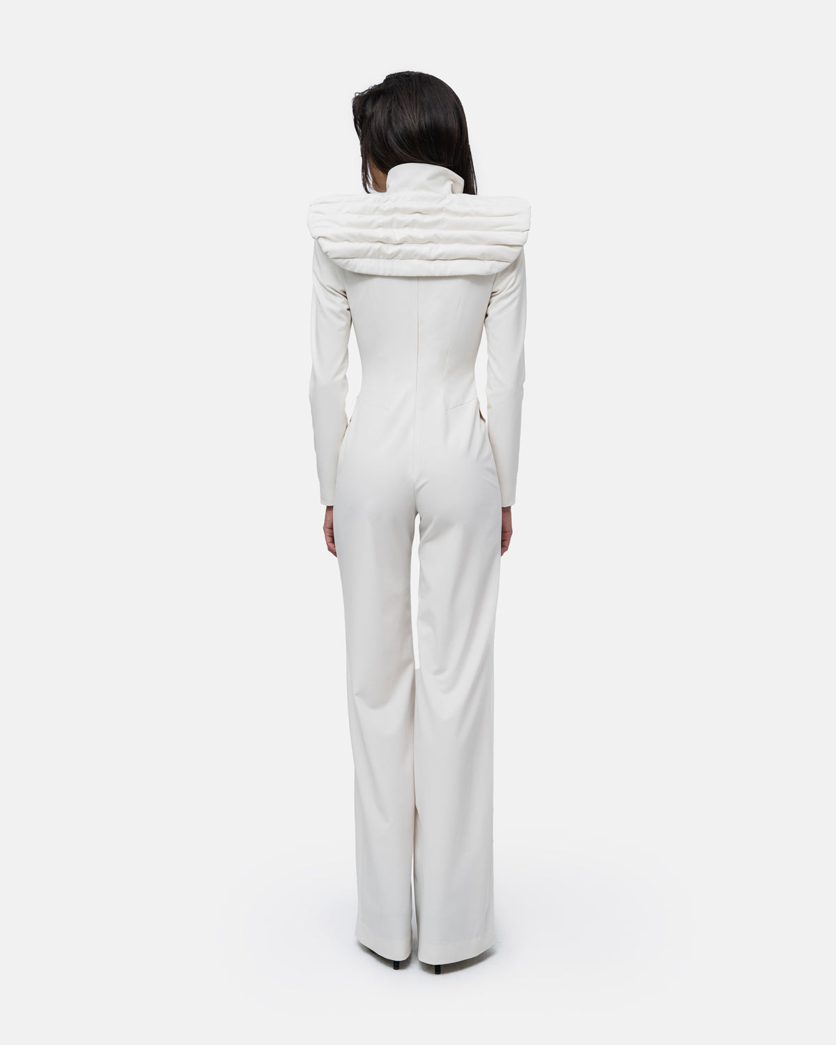 Long-sleeved jumpsuit with wide, high shoulders, draped collar with cape effect at the back, and wide legs.