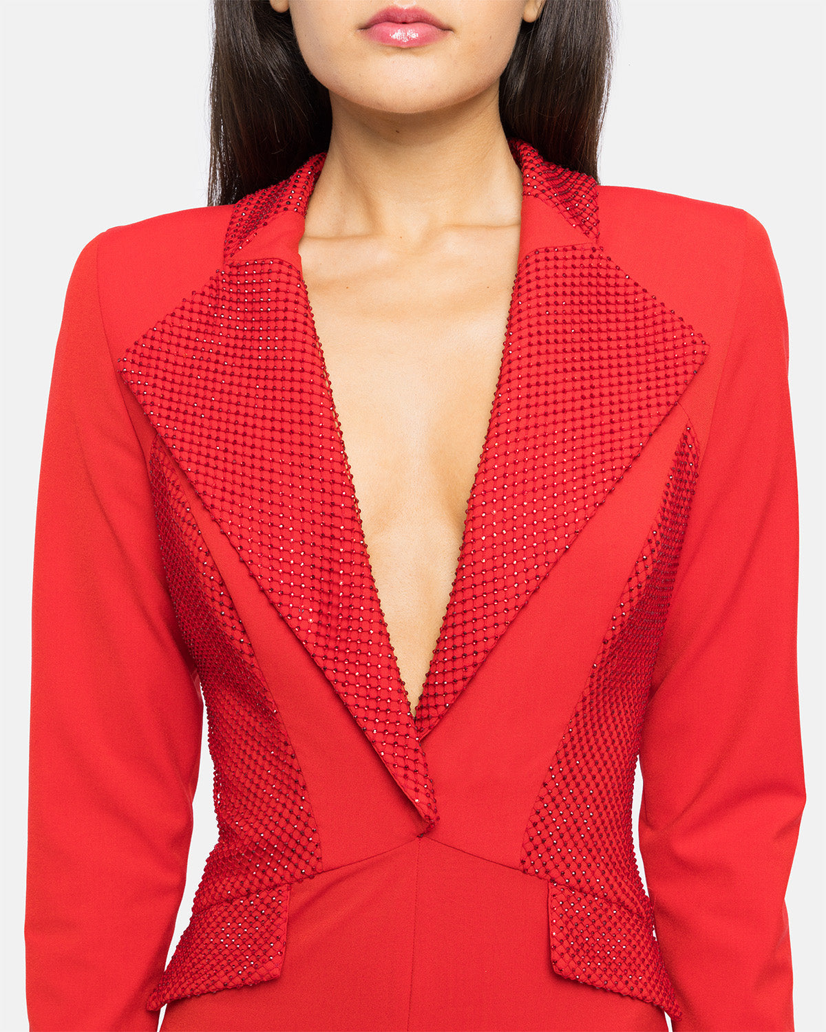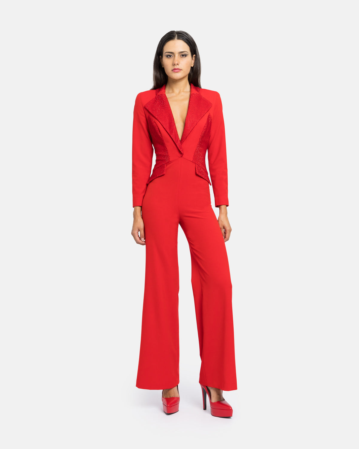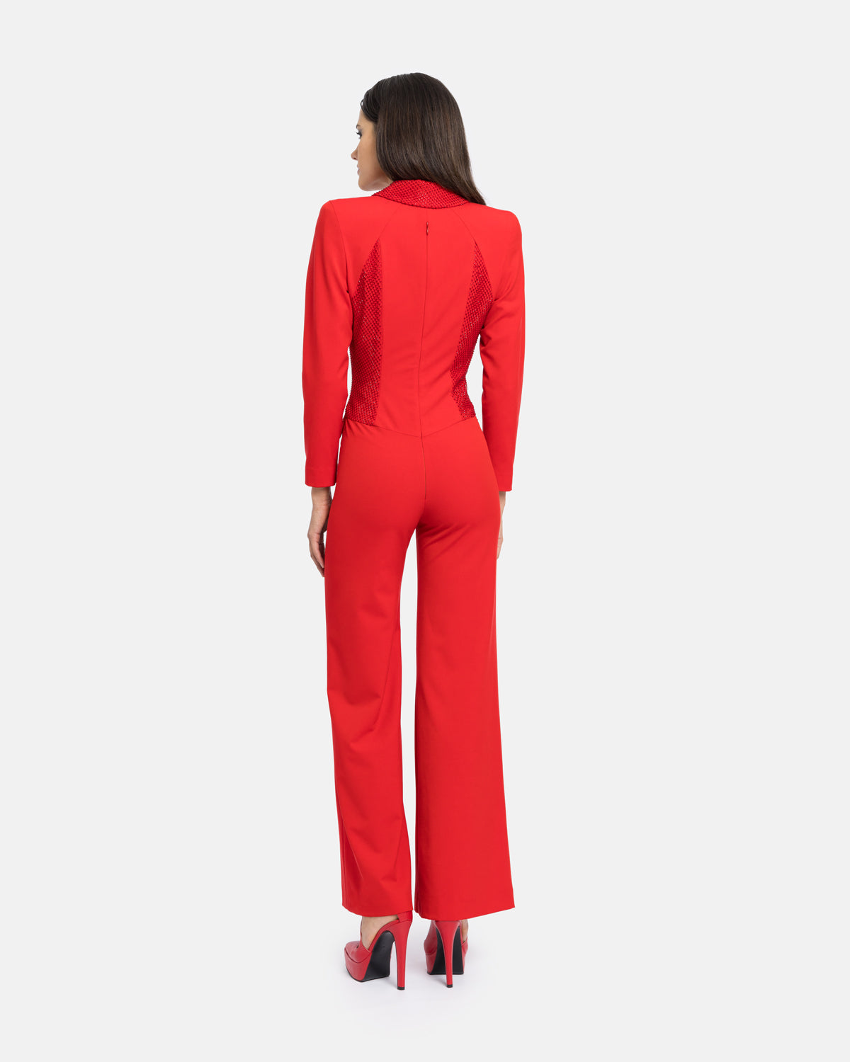 Combinaison/costume fumeur à manches longues, jambes larges, col et détails en cristal.