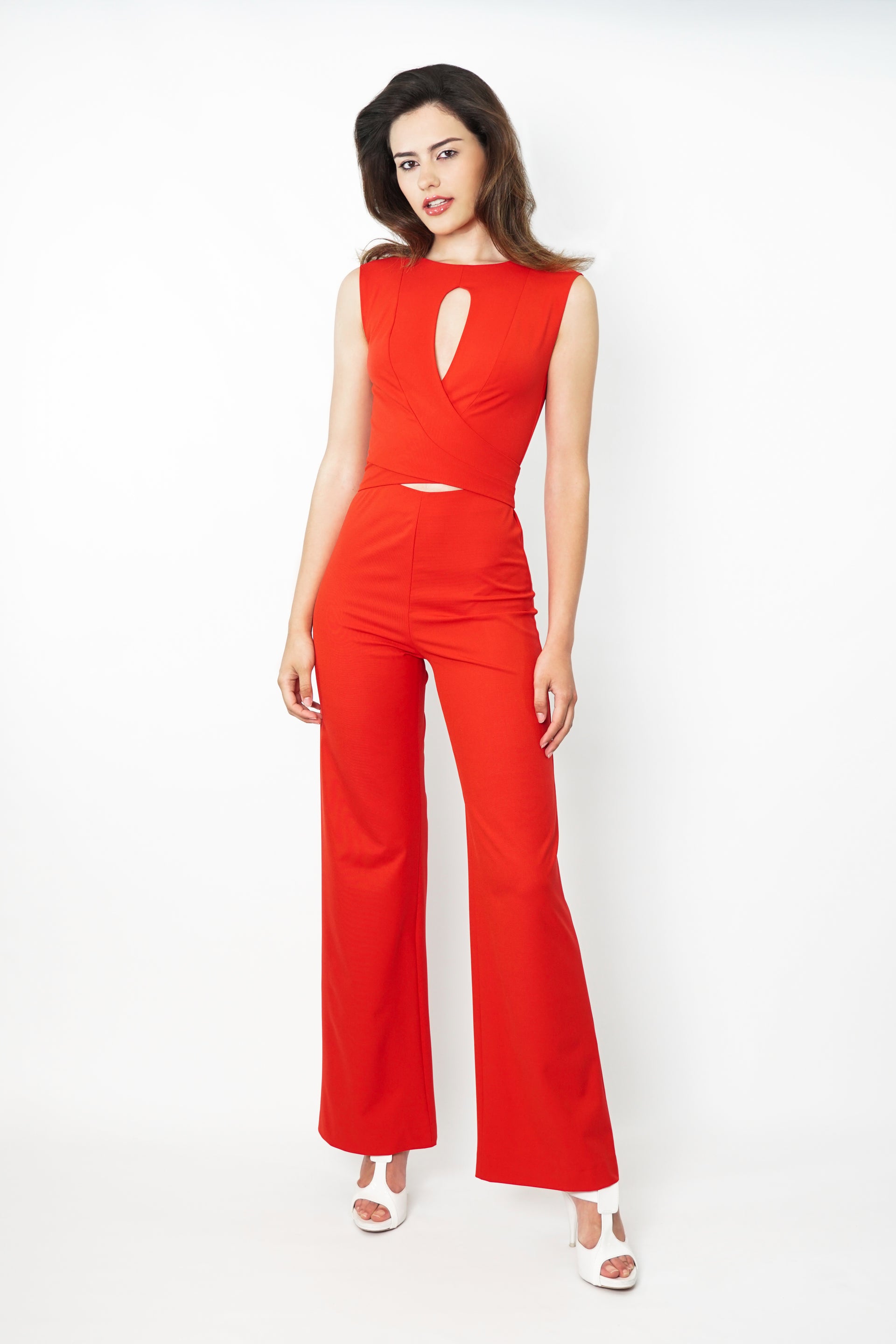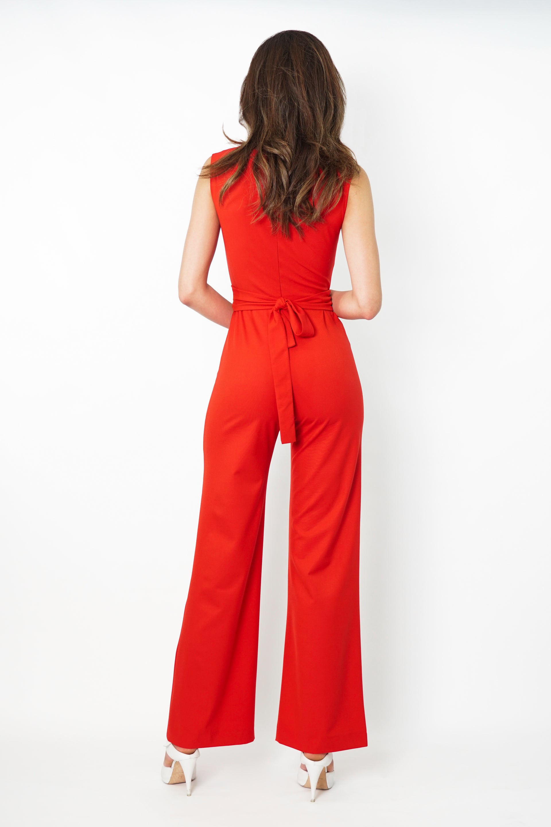 Combinaison sans manches, col rond avec une encolure ovale et une coupe portefeuille avec un nœud dans le dos et des jambes longues et larges Composition: |