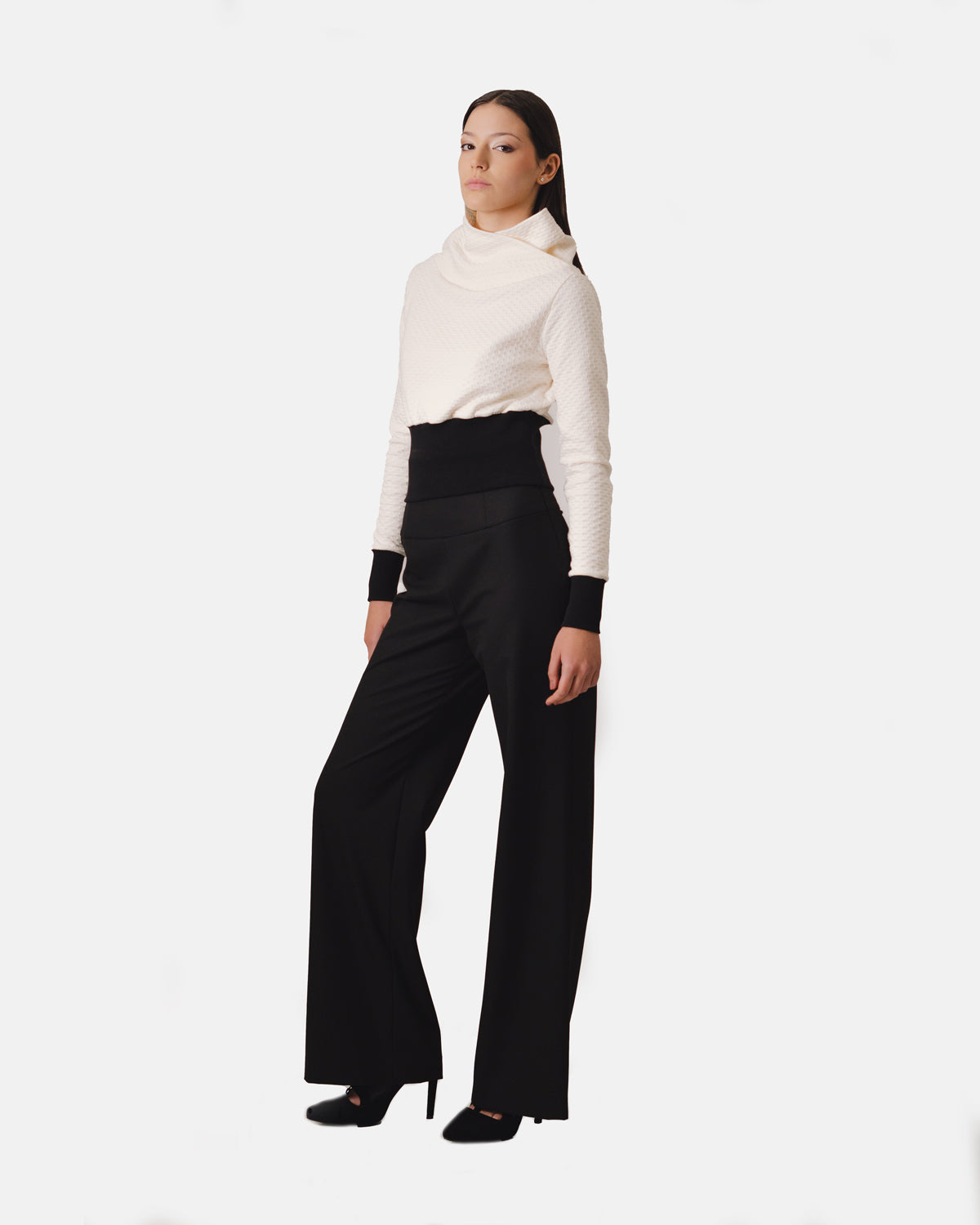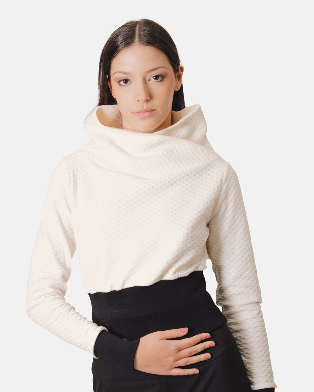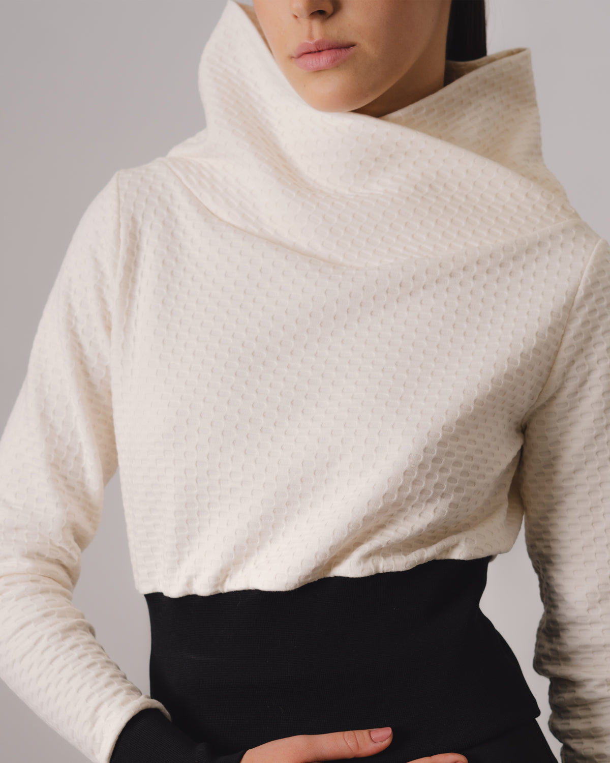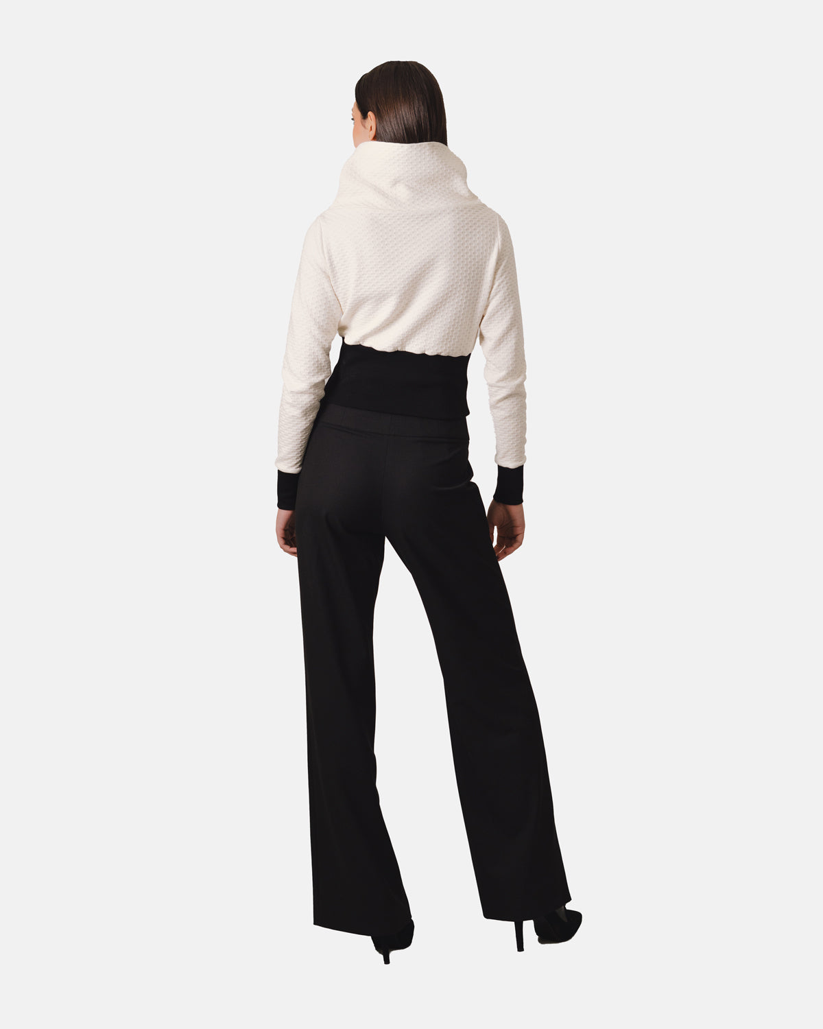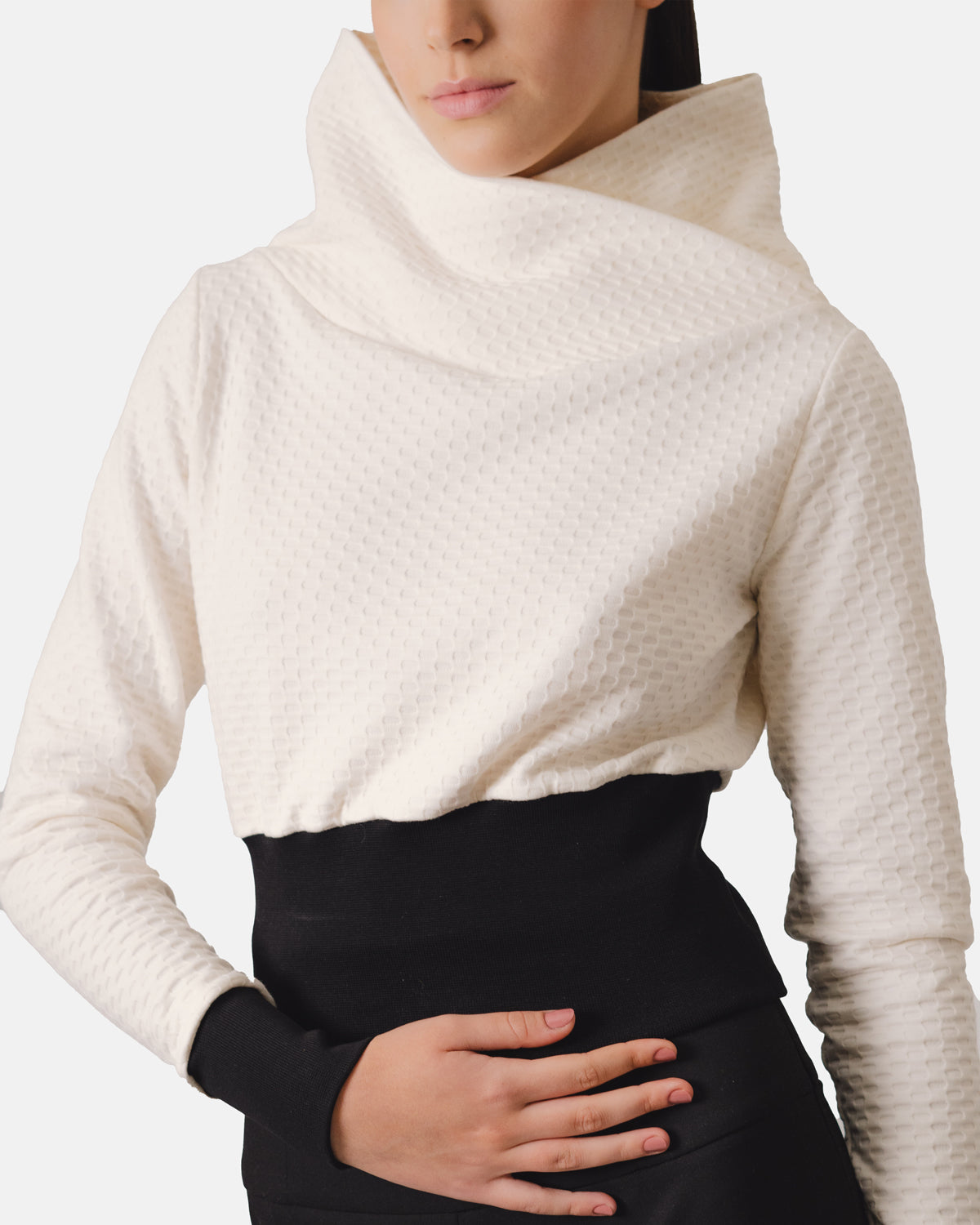Two-tone jumper with open, crossover high neck, ribbed waistband and cuffs