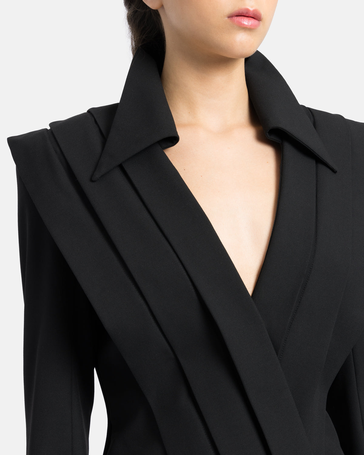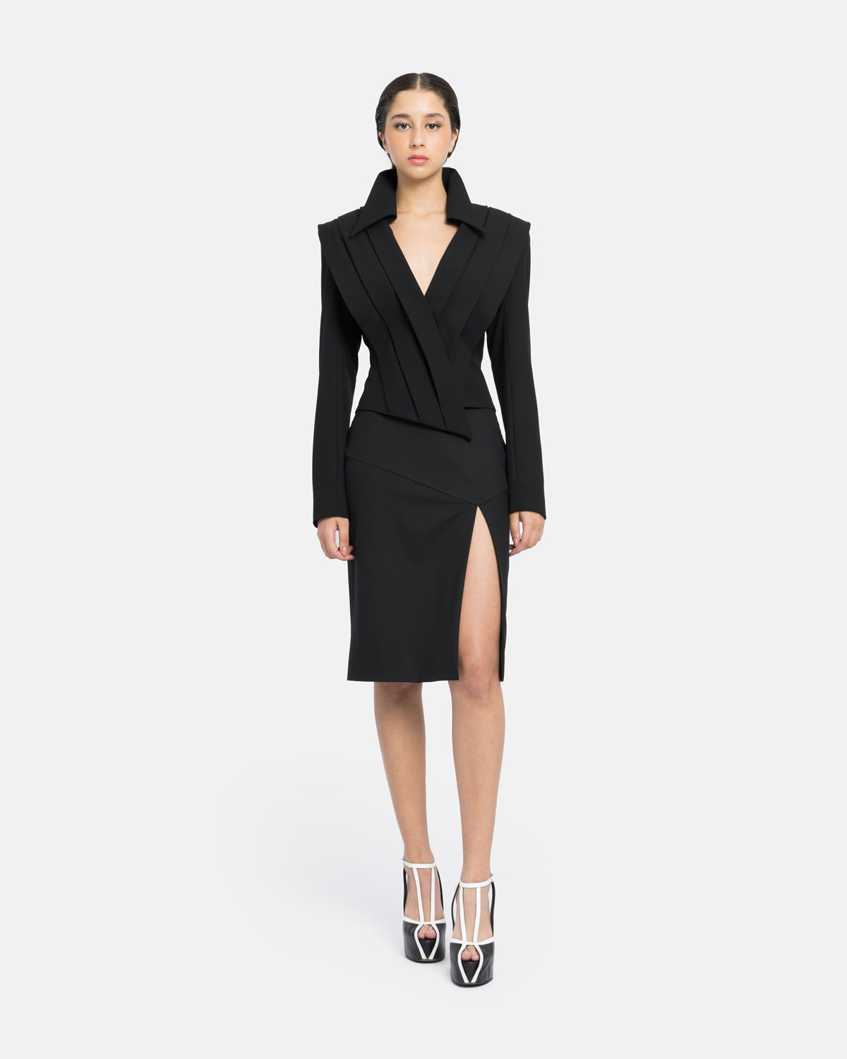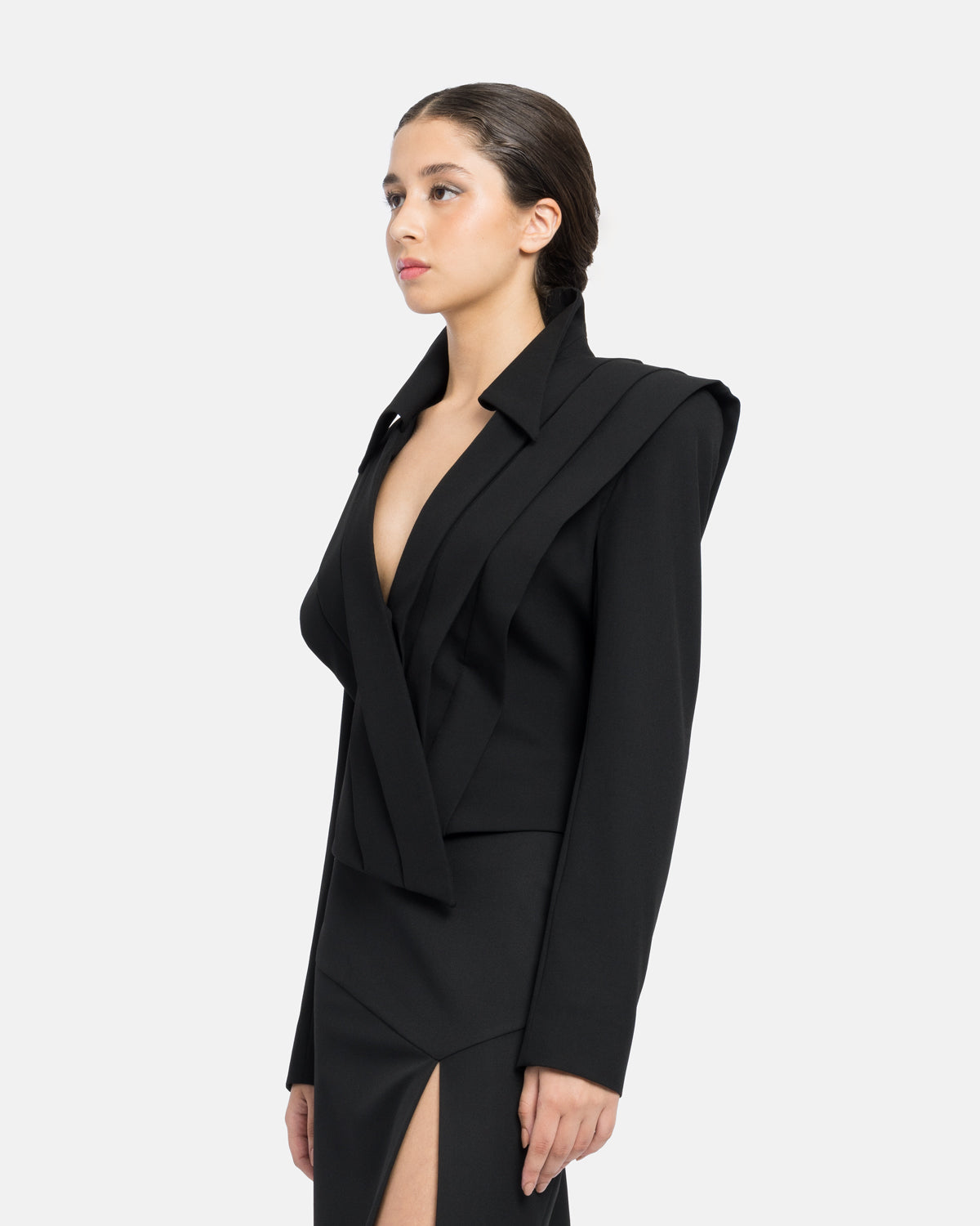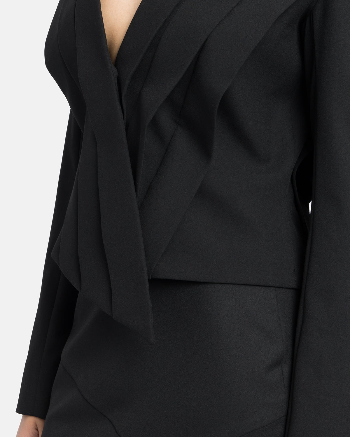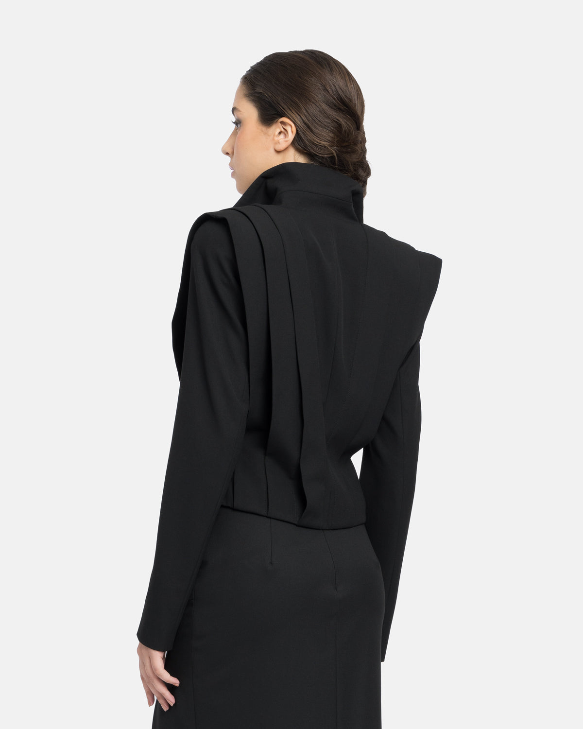 Blazer with geometric pleats at the front and back, ending in asymmetry.