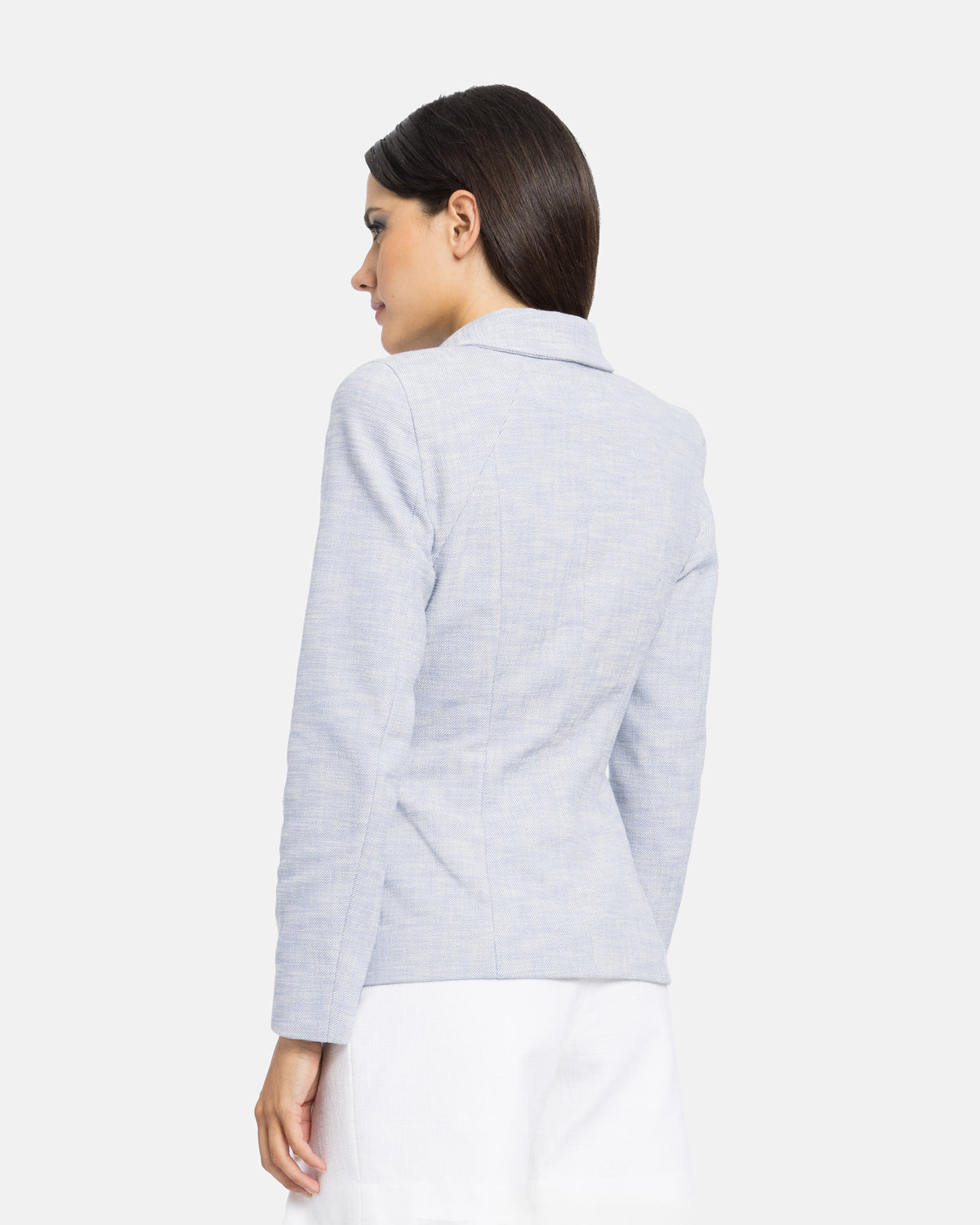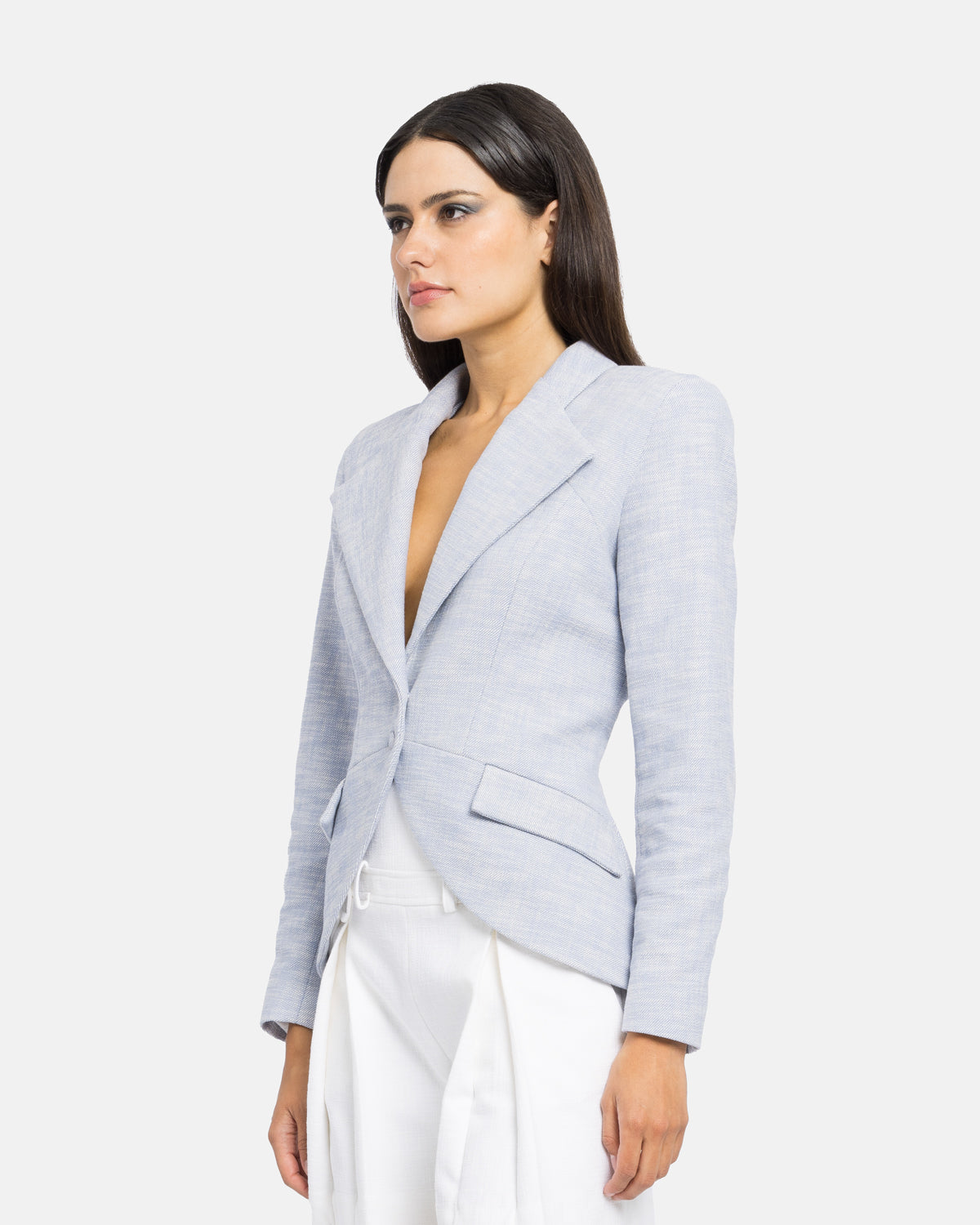 Fitted graphic blazer with broad shoulders, wide collar, and band.