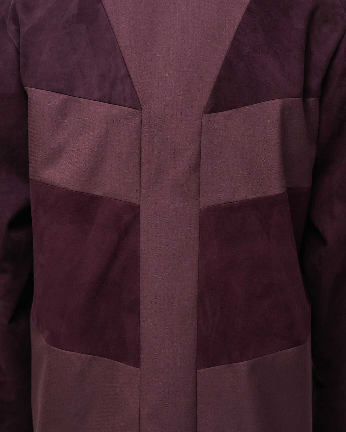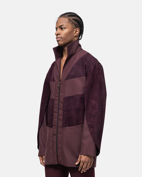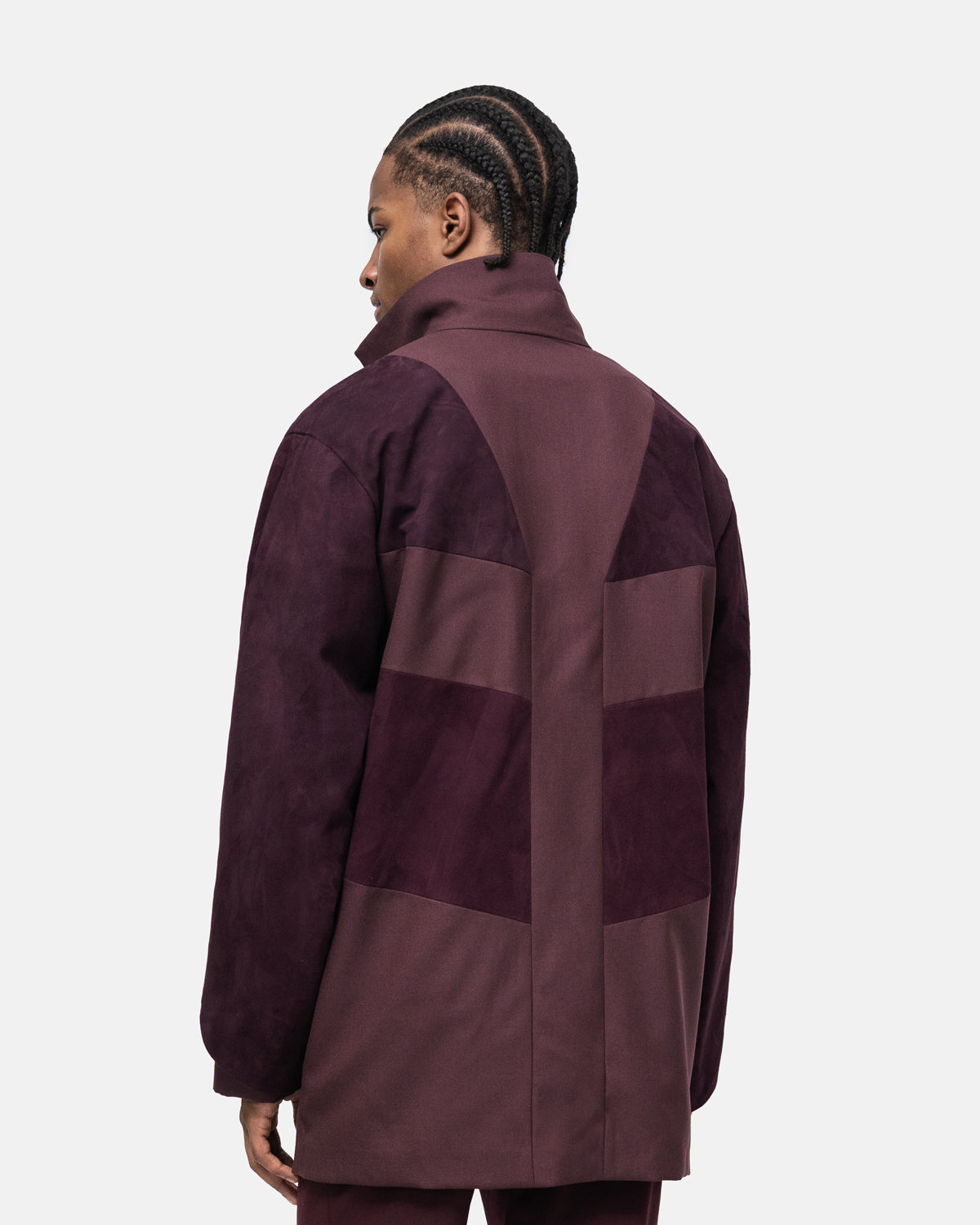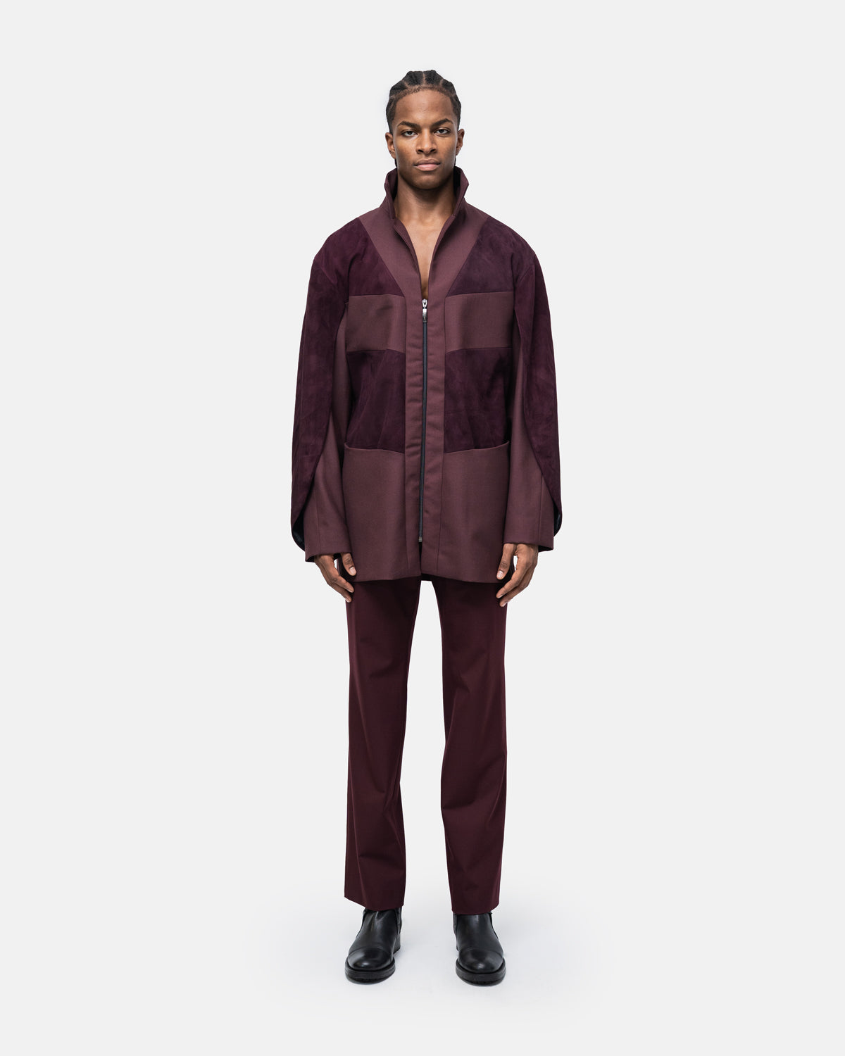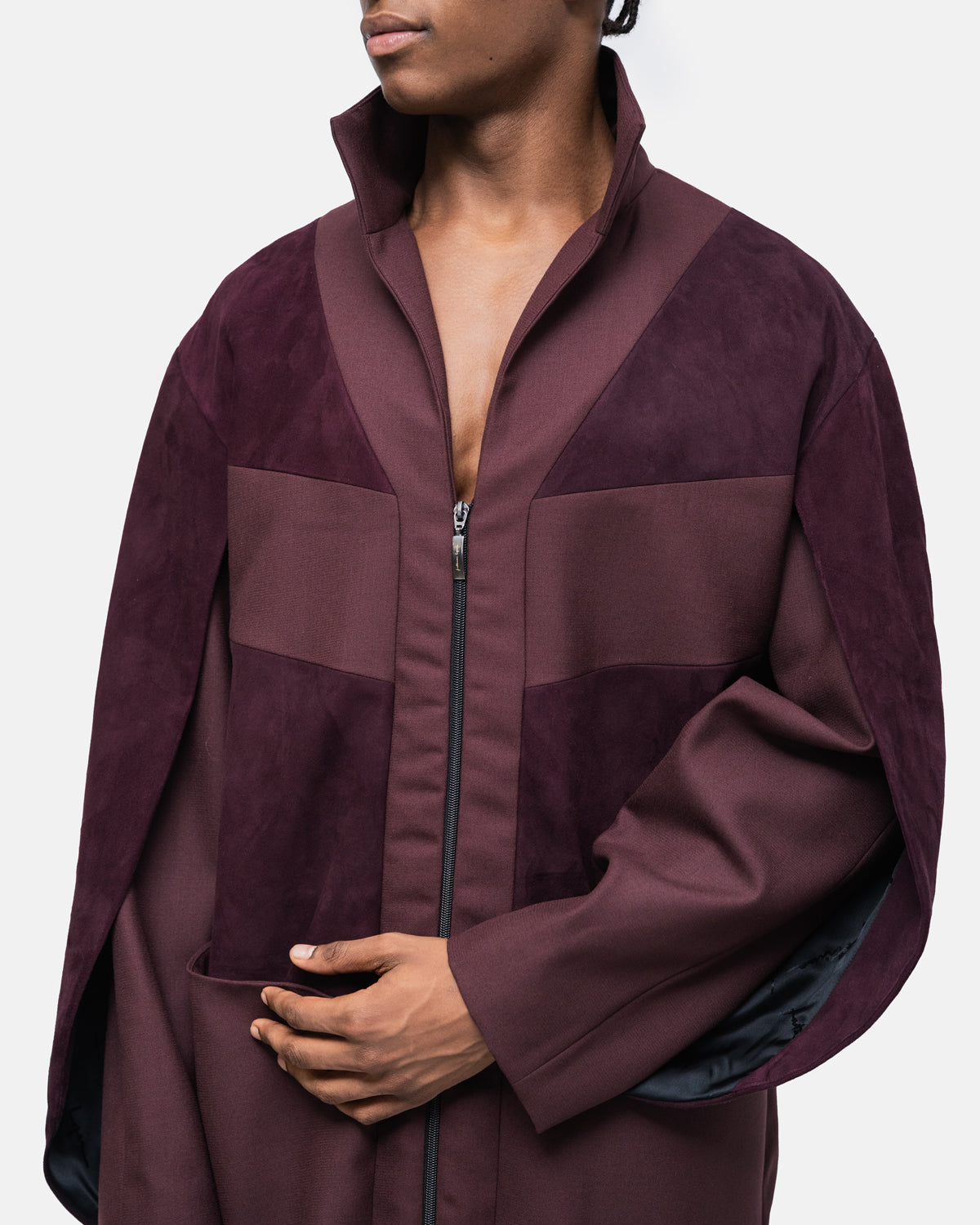 Oversized graphic coat with Suede | Wool patchwork and overlapping sleeves, fastens with a zip.