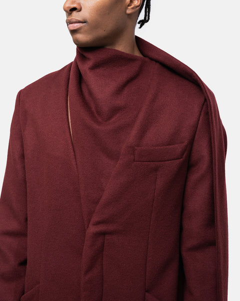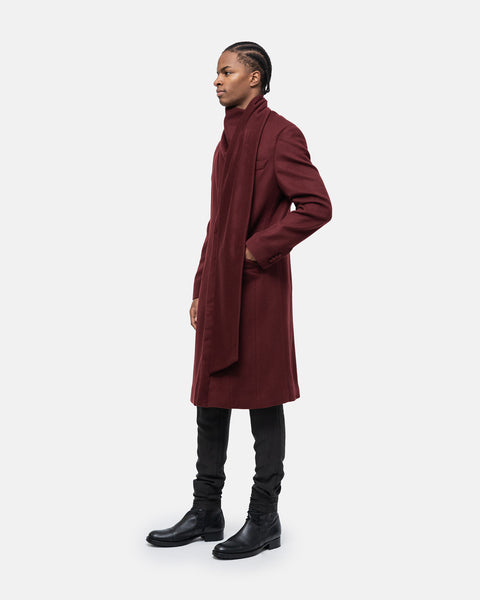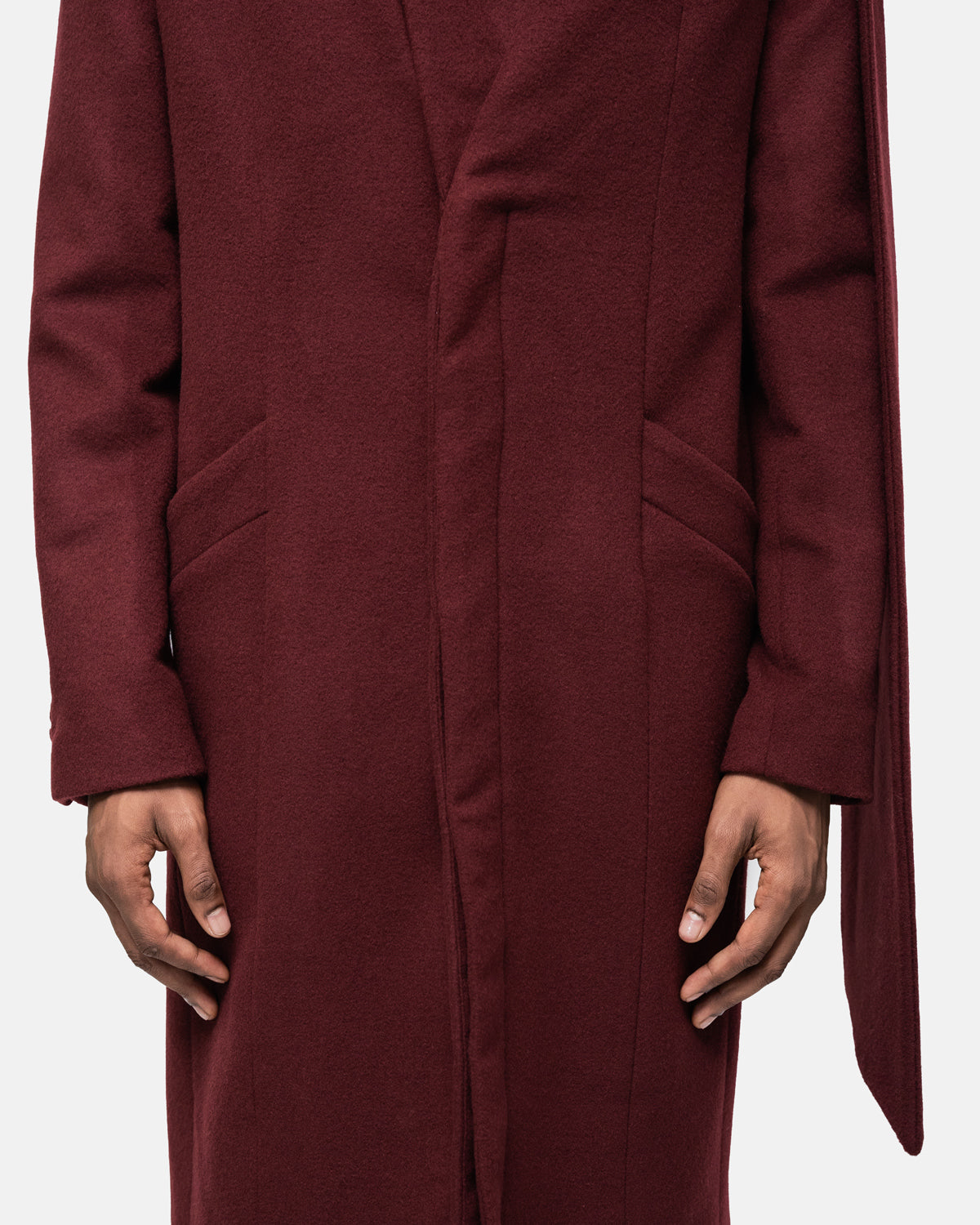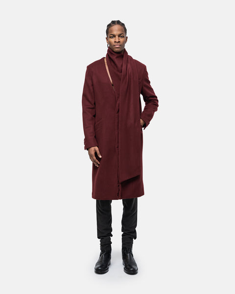 Wool coat with asymmetrical collar that crosses over and transforms into a scarf