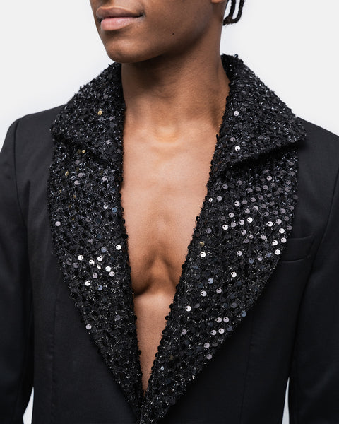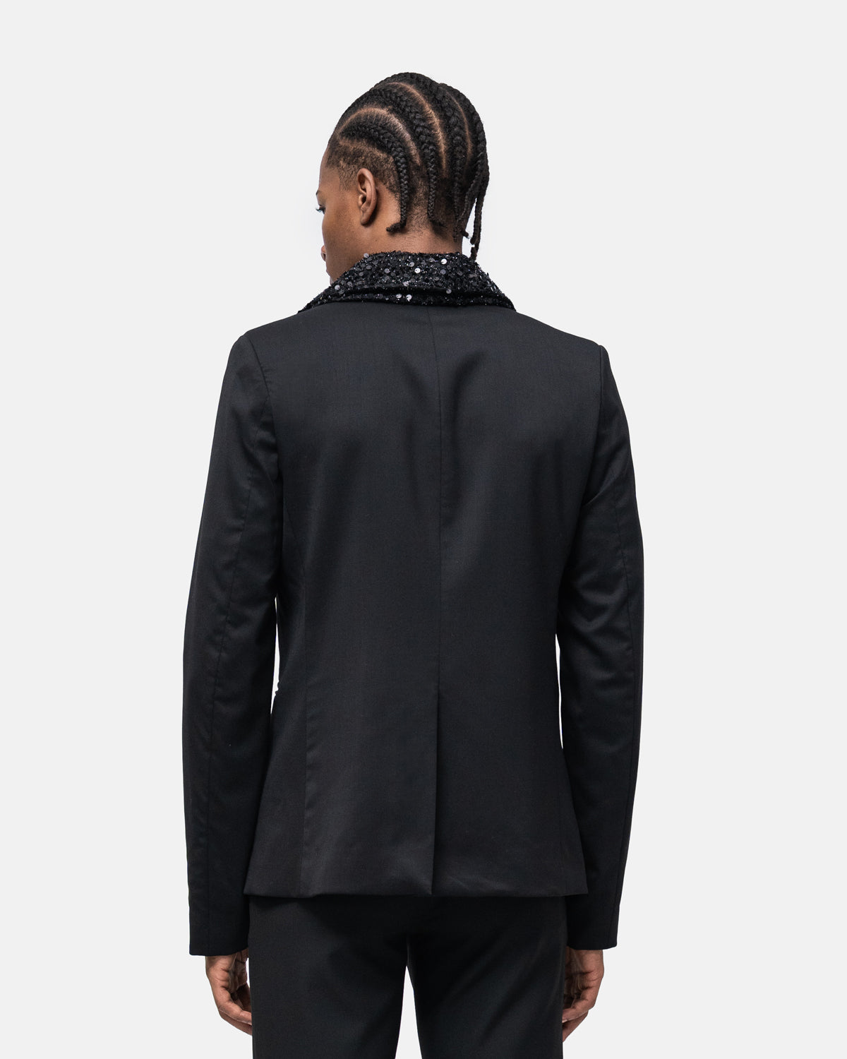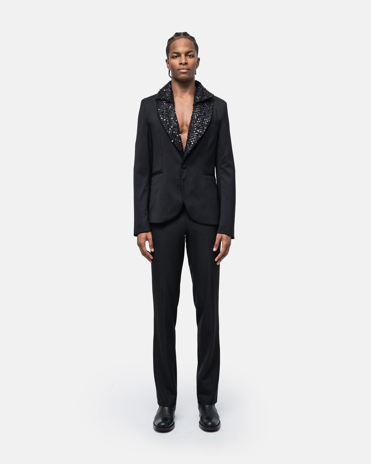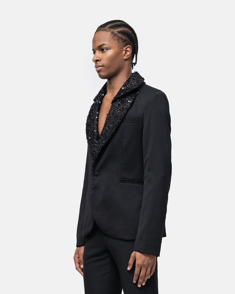 High tailoring Tuxedo two-piece suit in virgin wool, fitted, double overlapping Lace collar