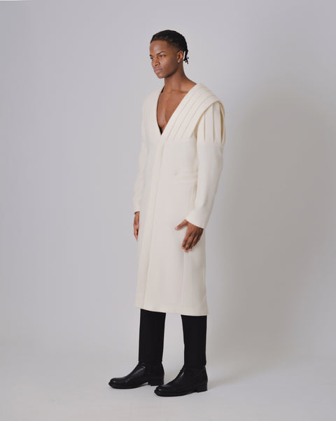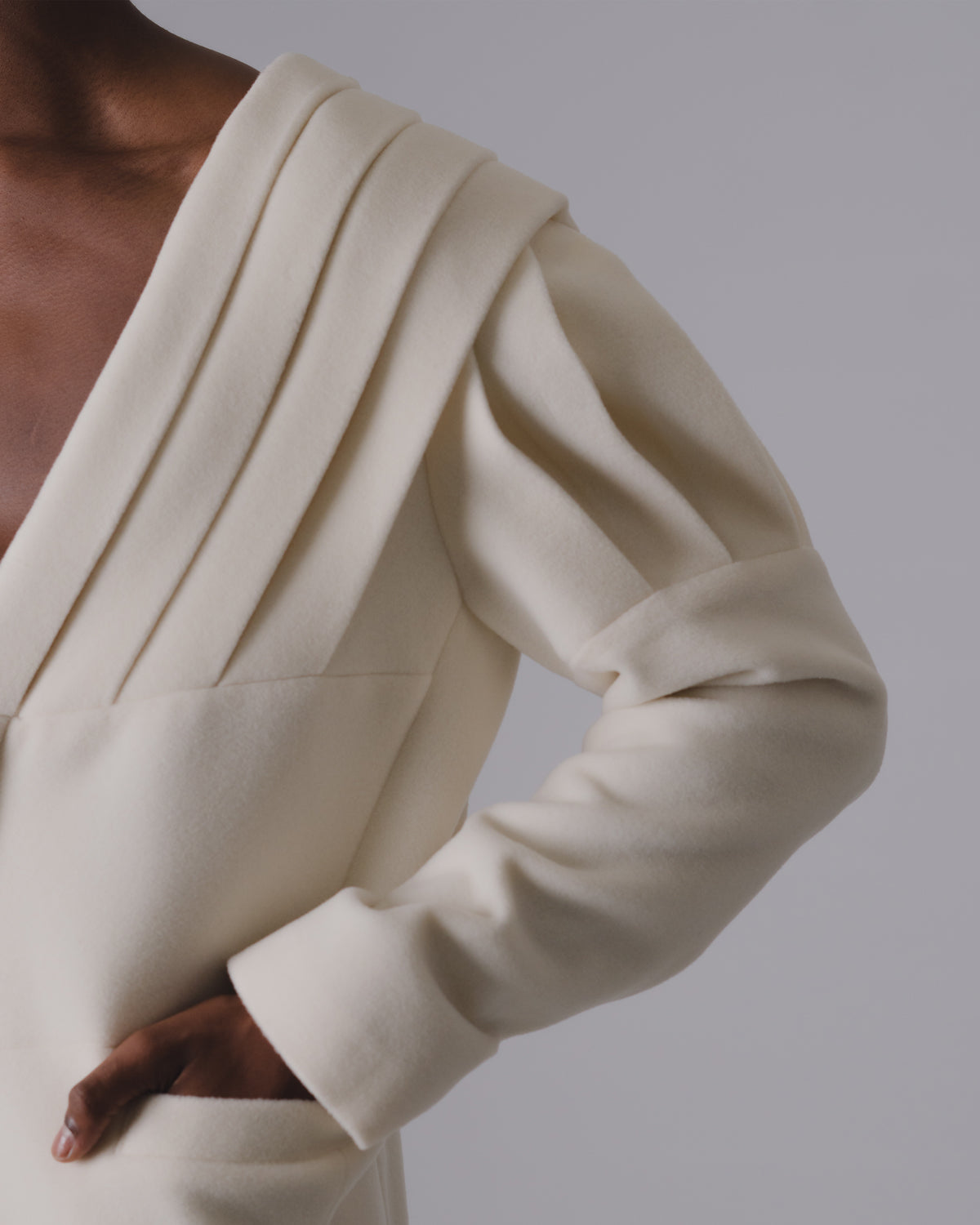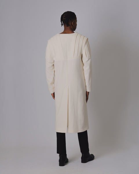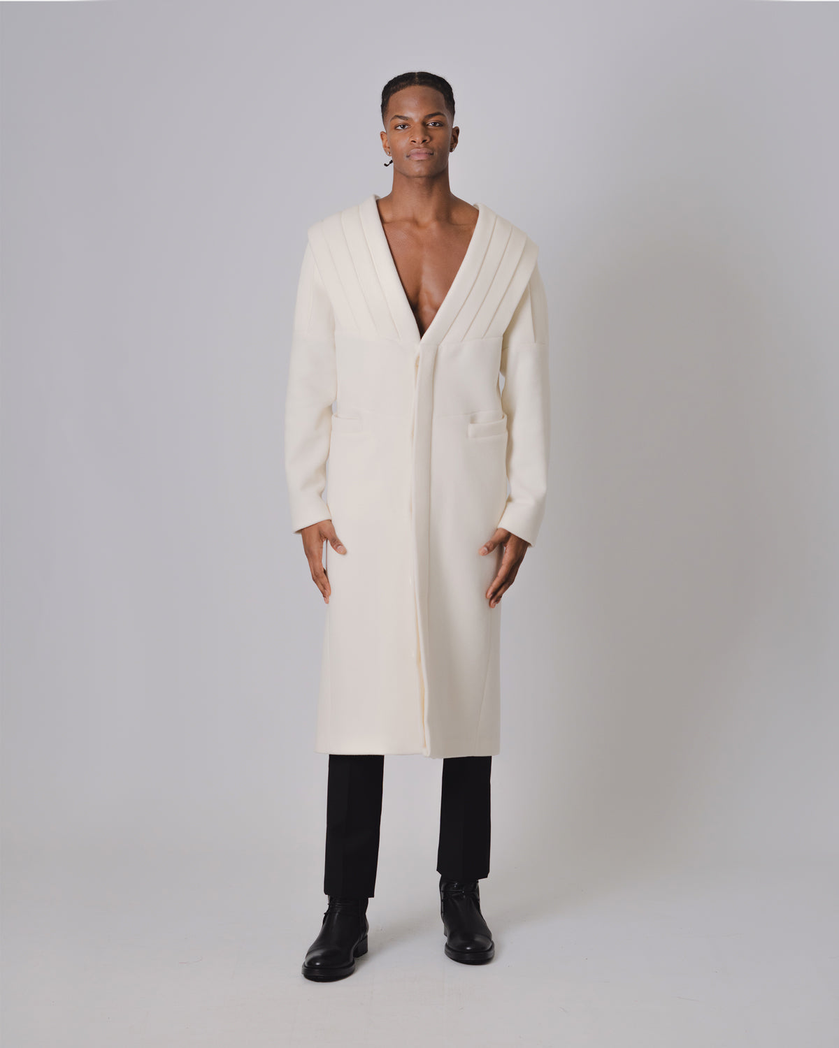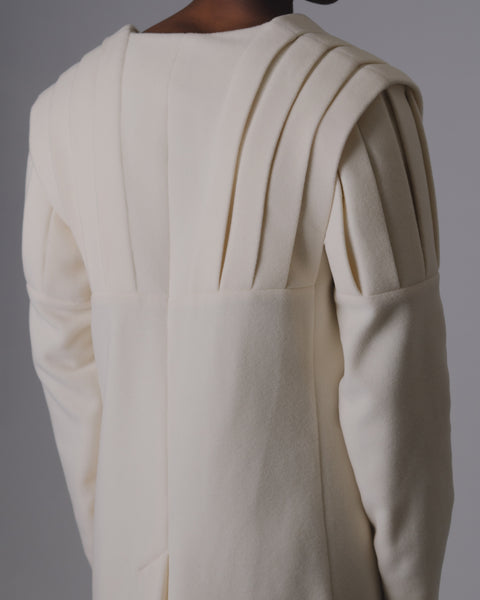 Long coat in pure wool with graphic design, with wide pleats on the upper body and sleeves.