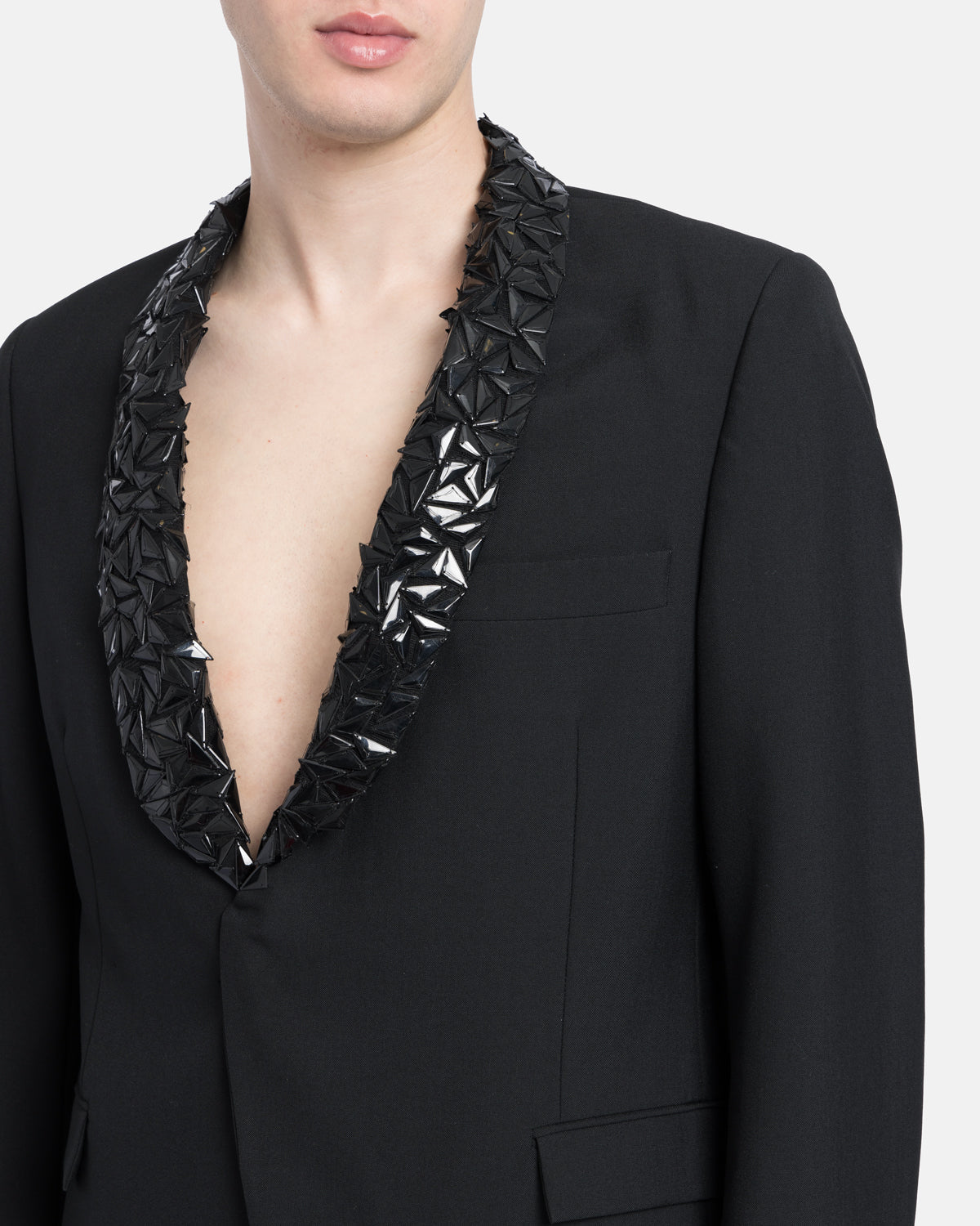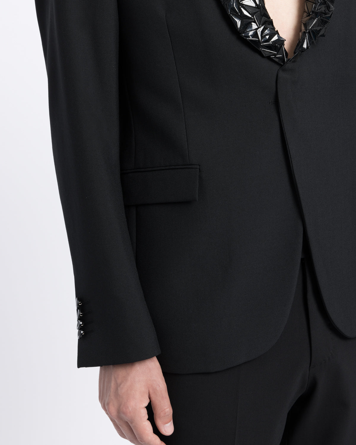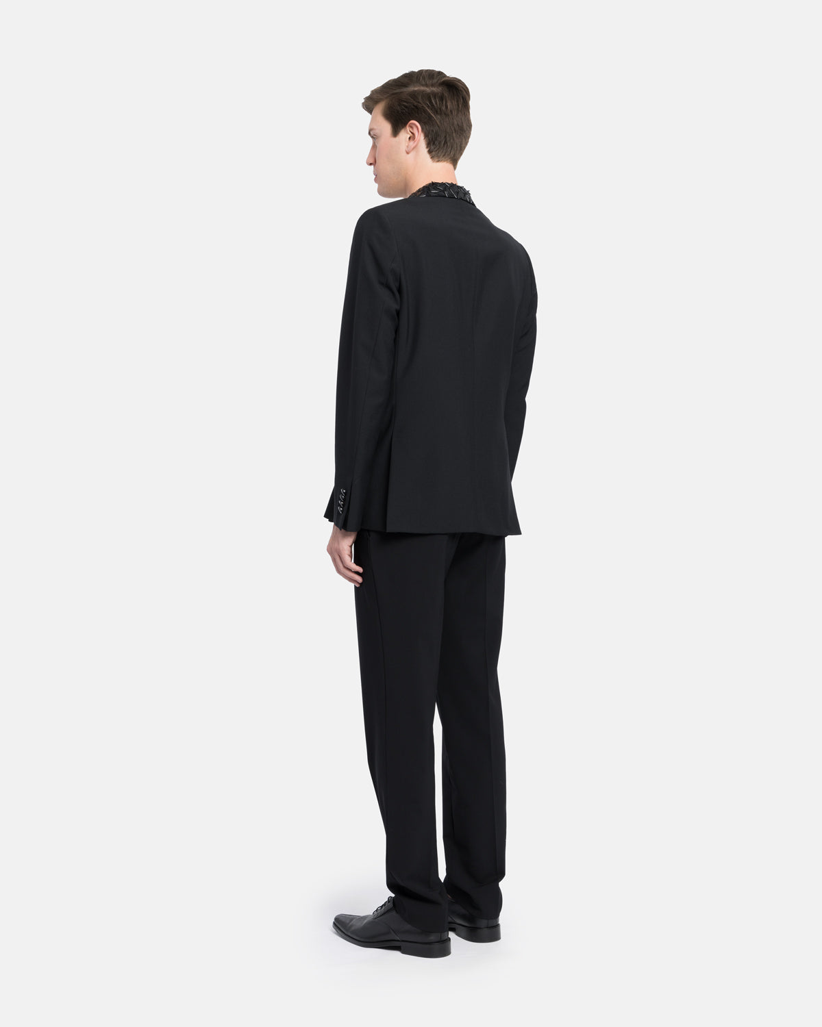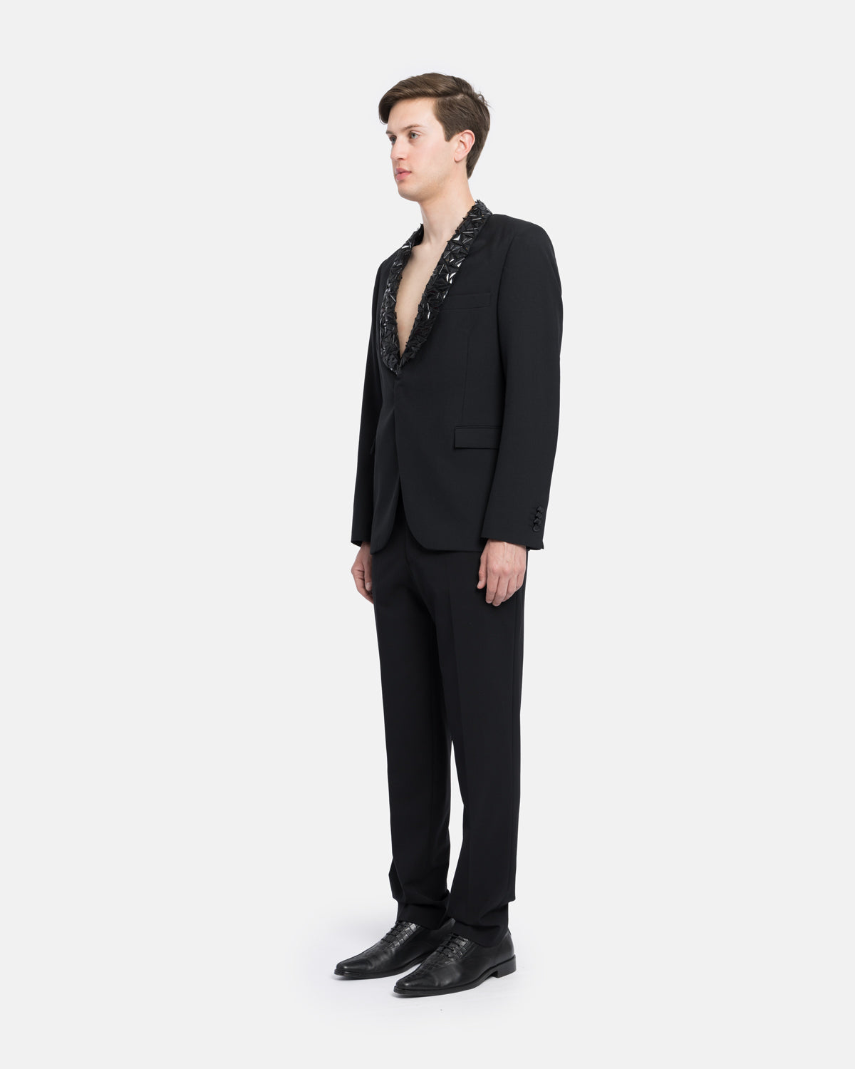Smoking de alfaiataria alta, ajustado, de duas peças, em lã virgem, com gola bordada. Disponível no tamanho 50. Outros tamanhos disponíveis feitos sob medida com prazo de fabricação de 30 a 45 dias. Composição: |
