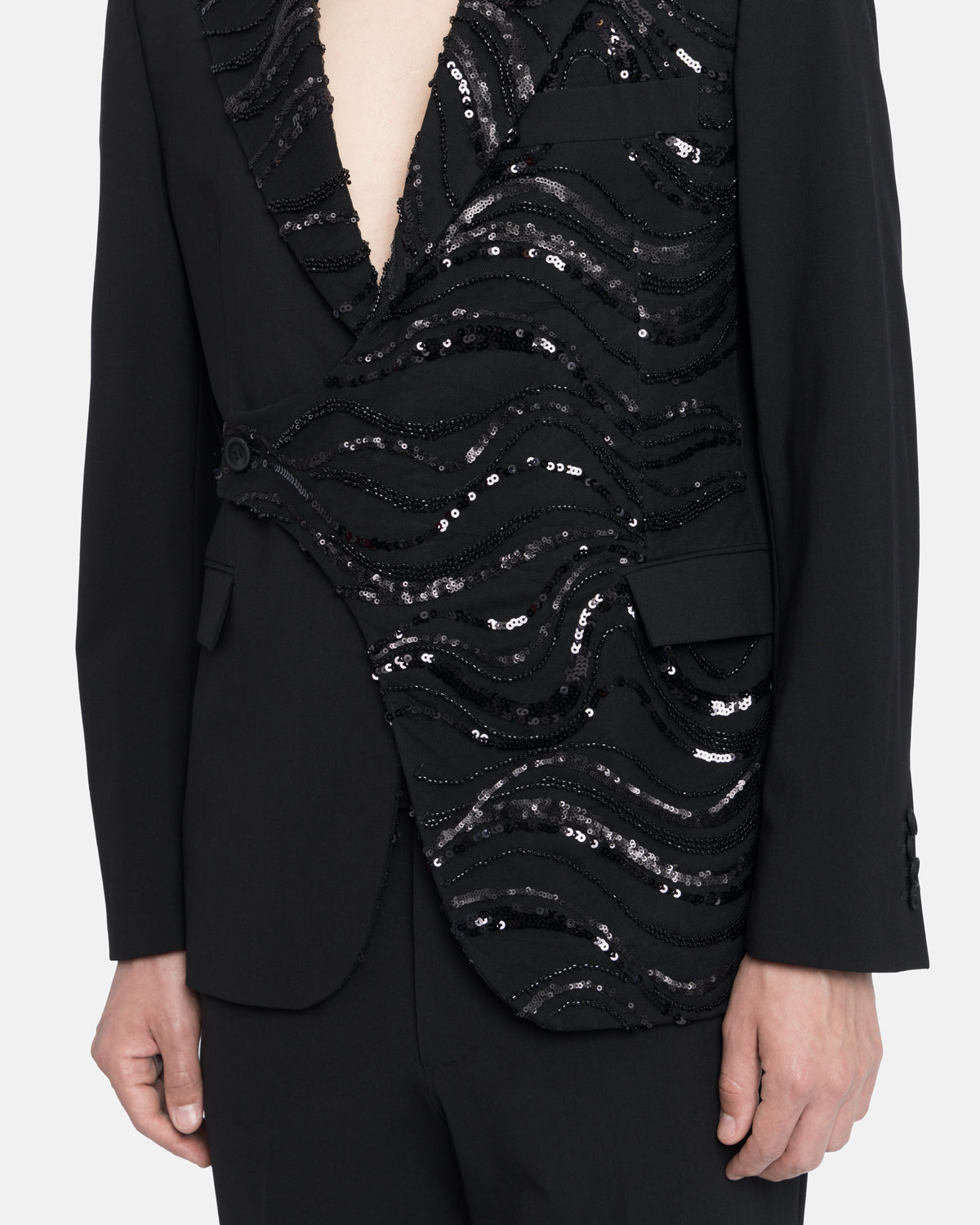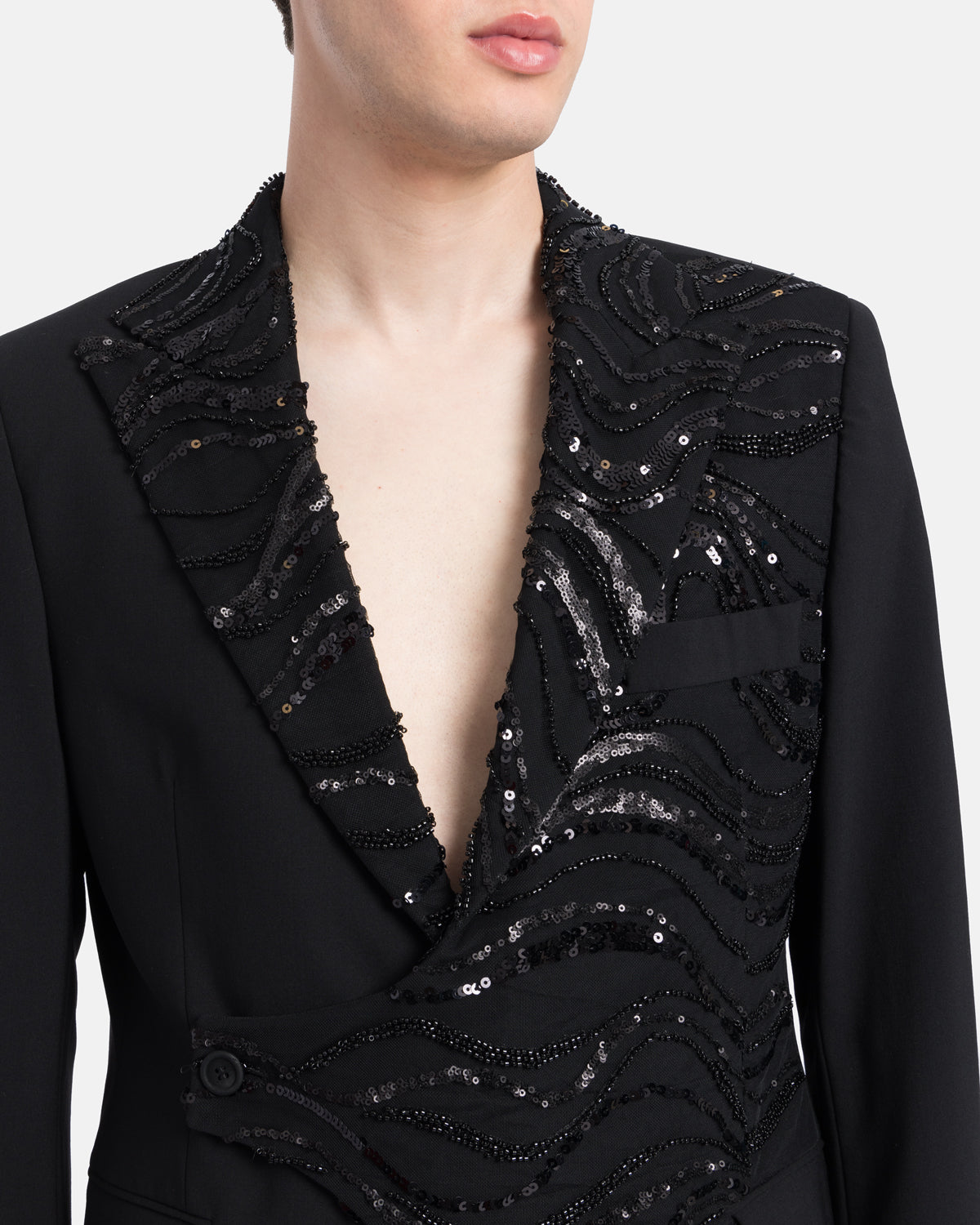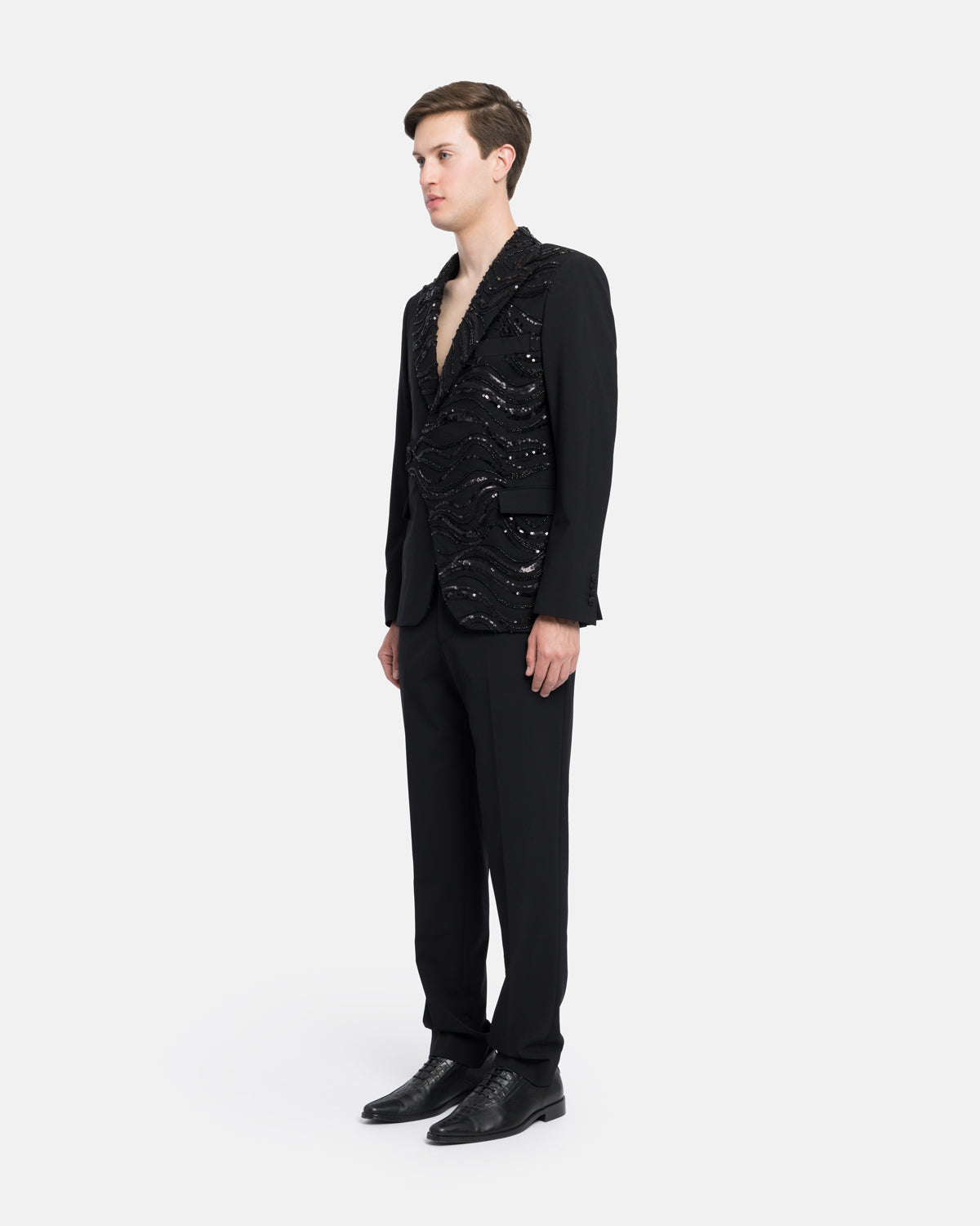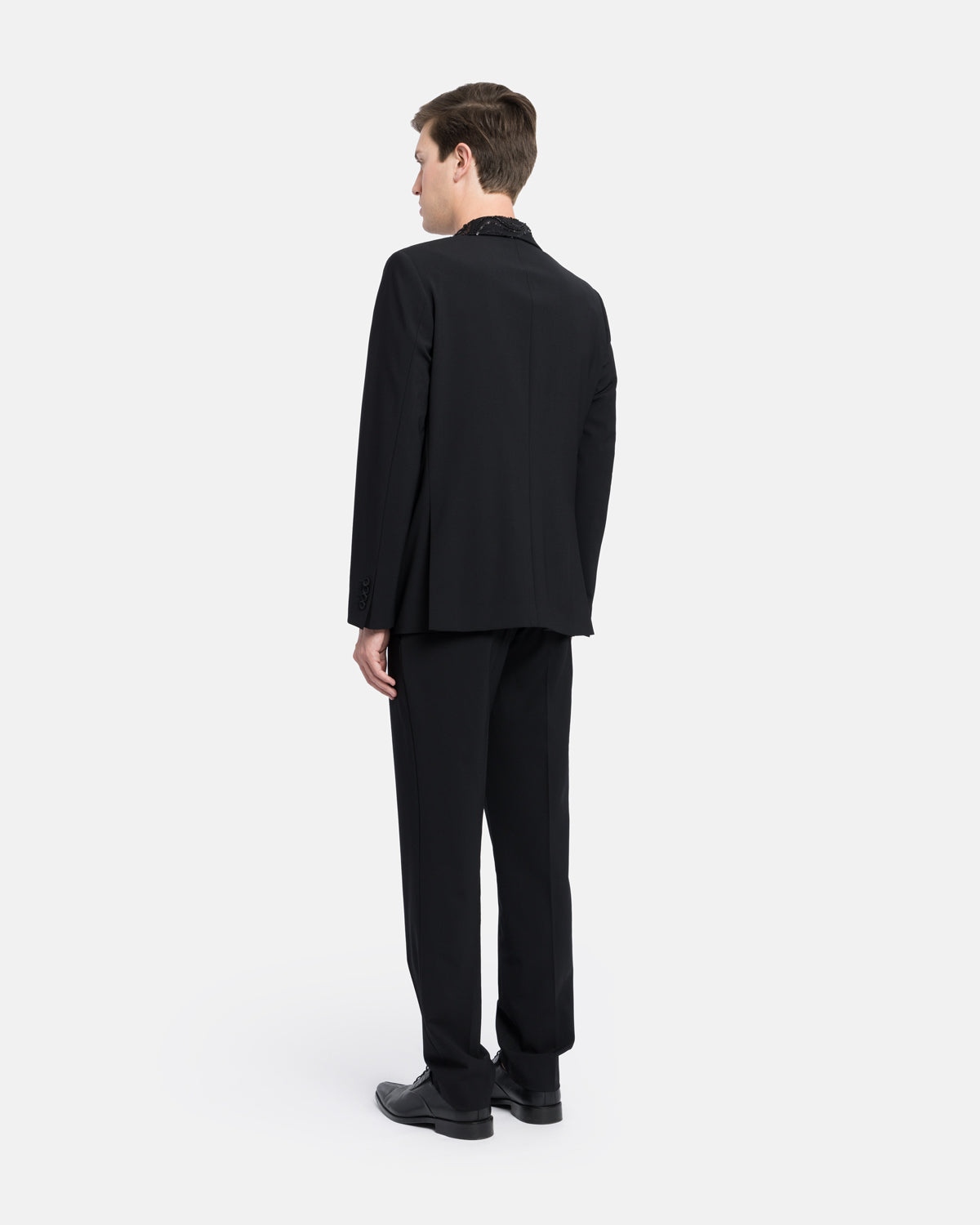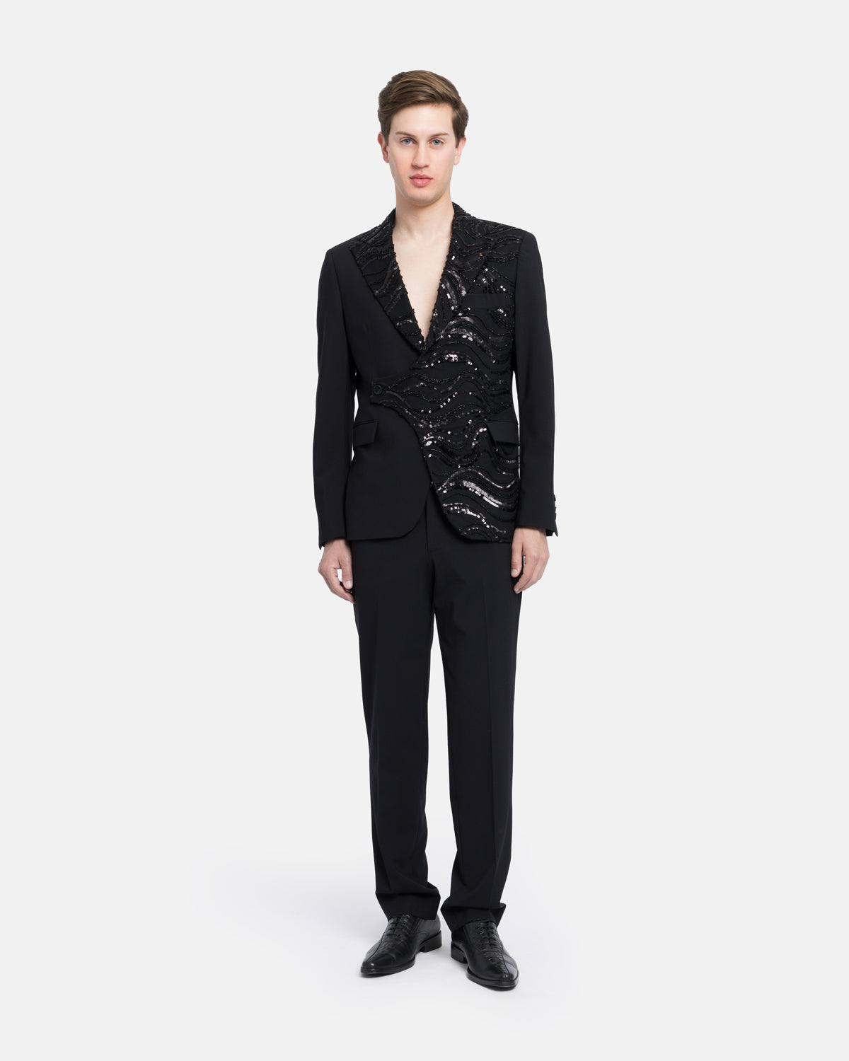Smoking de alta alfaiataria de duas peças em lã virgem e renda bordada com lantejoulas, ajustado, com lapelas largas e cruzadas em assimetria. Disponível no tamanho 50. Outros tamanhos disponíveis feitos sob medida com prazo de fabricação de 30 a 45 dias. Composição: |