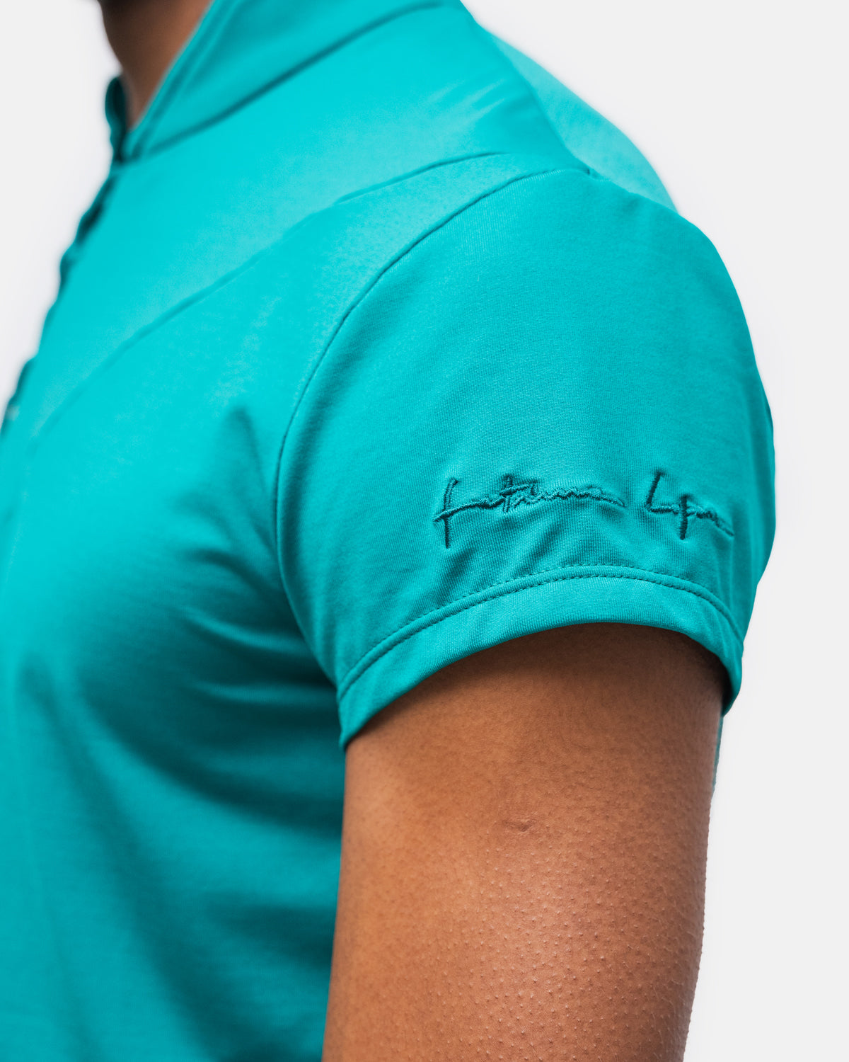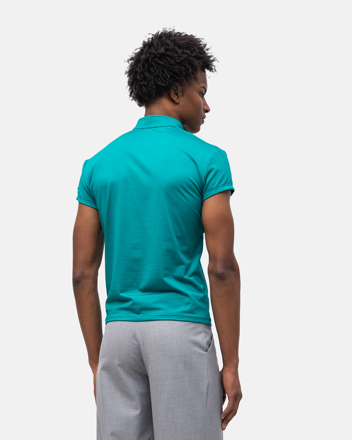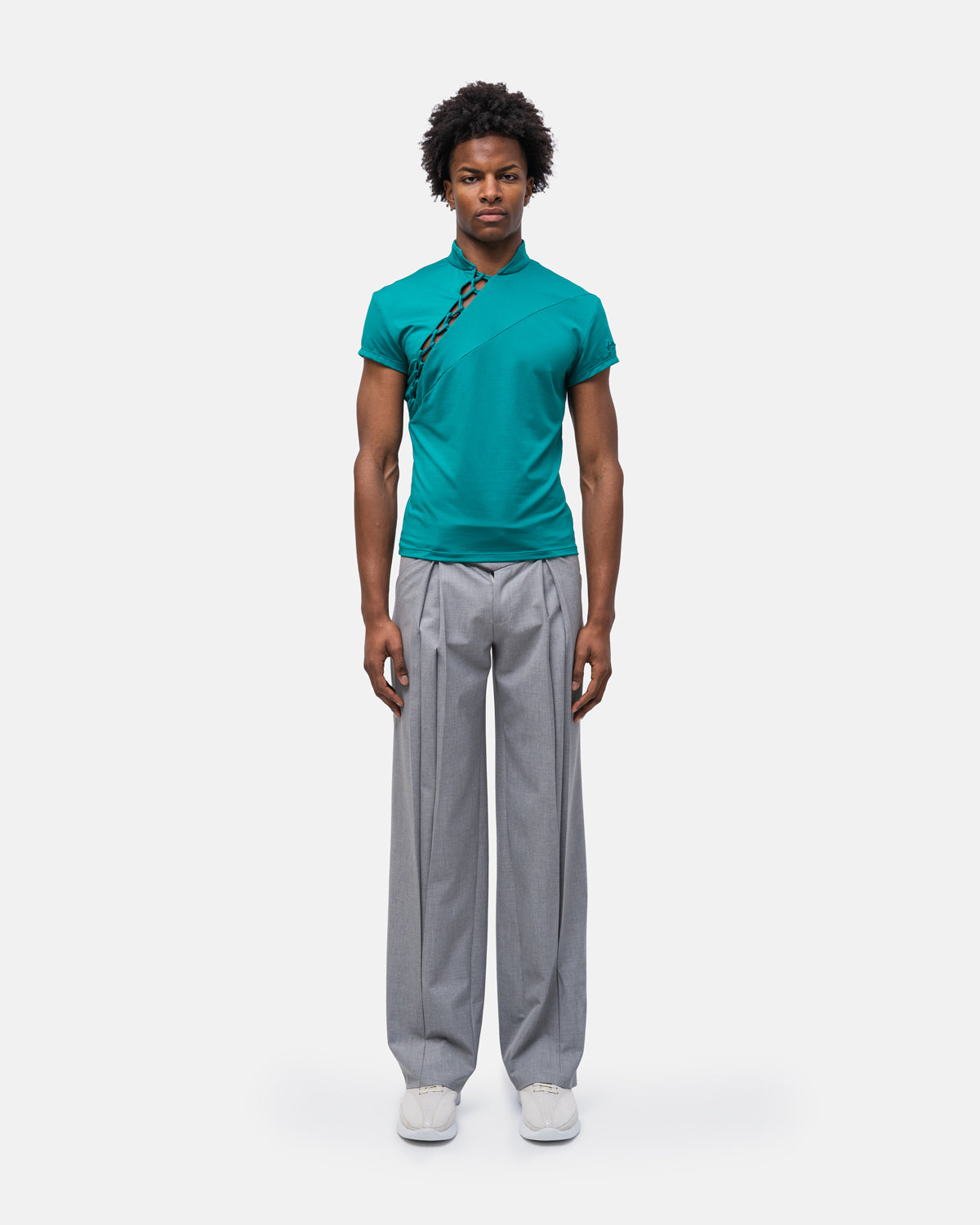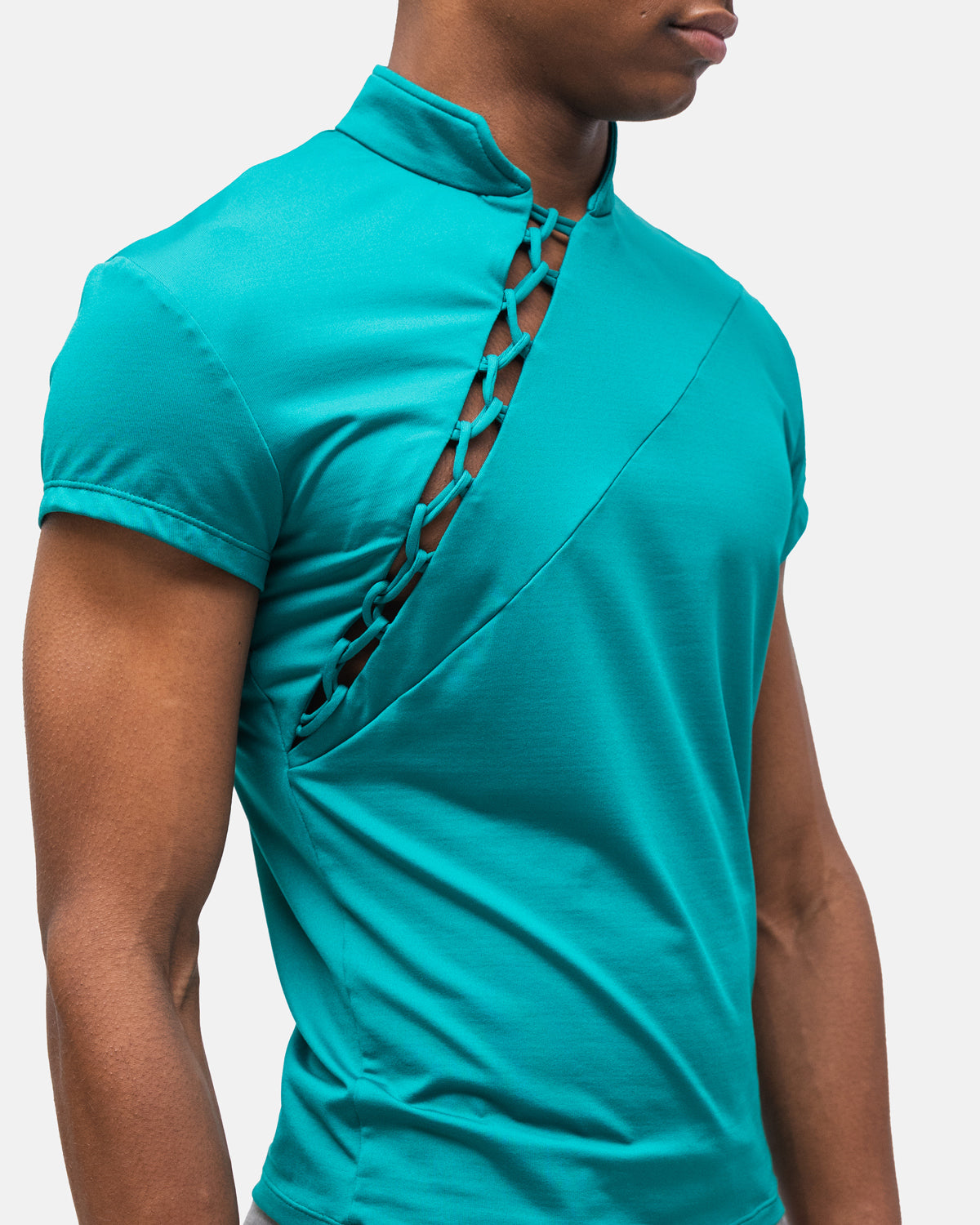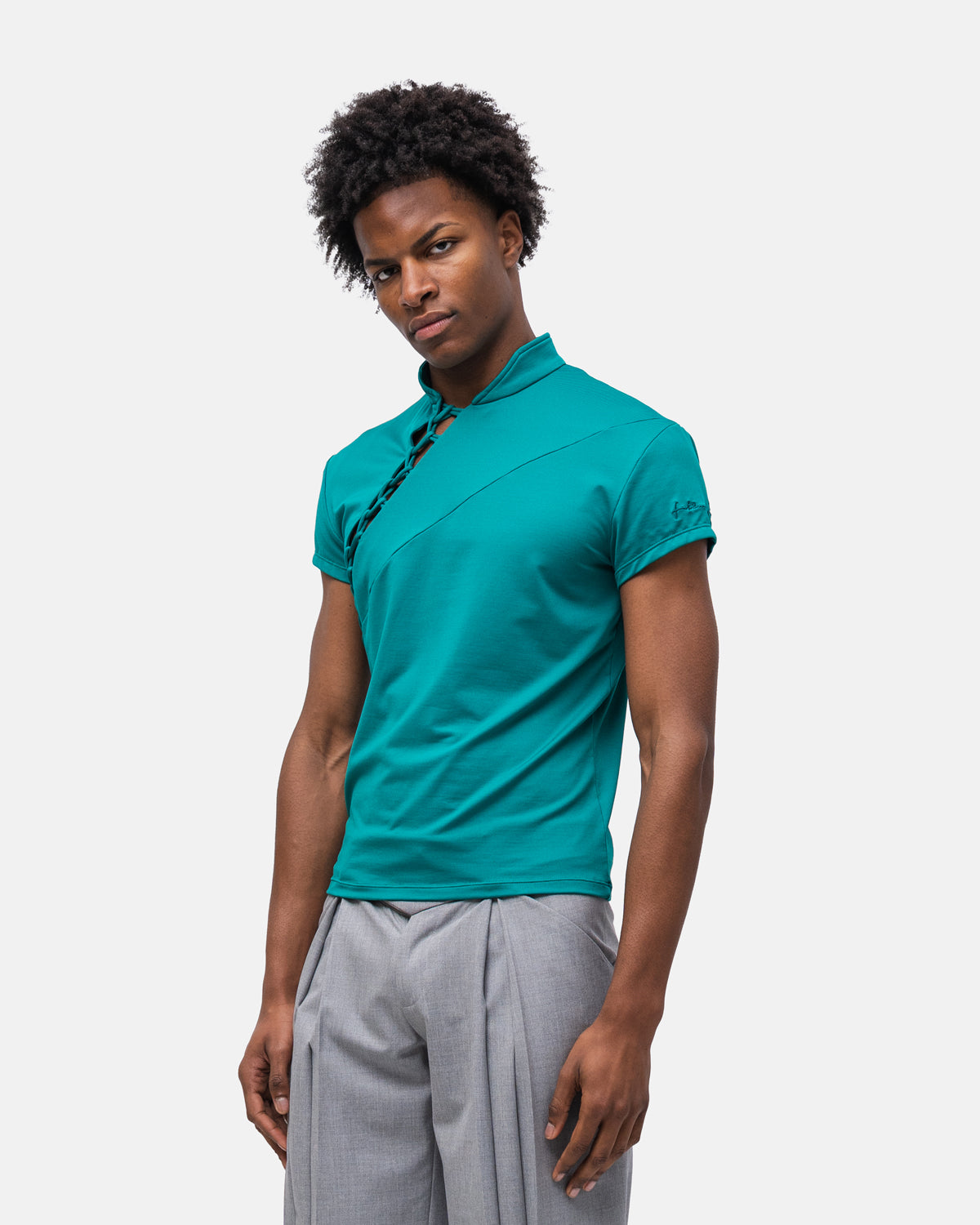 Camiseta com corte assimétrico, fecho em macramê e gola falsa com logo bordado na manga