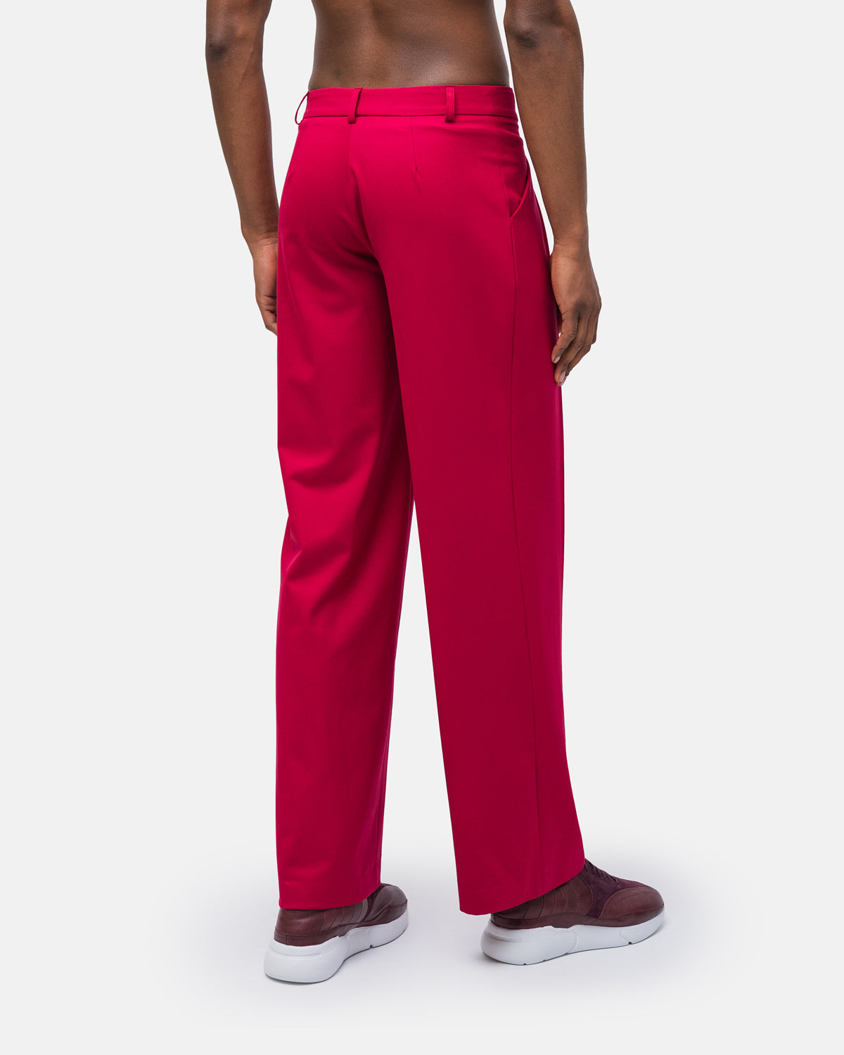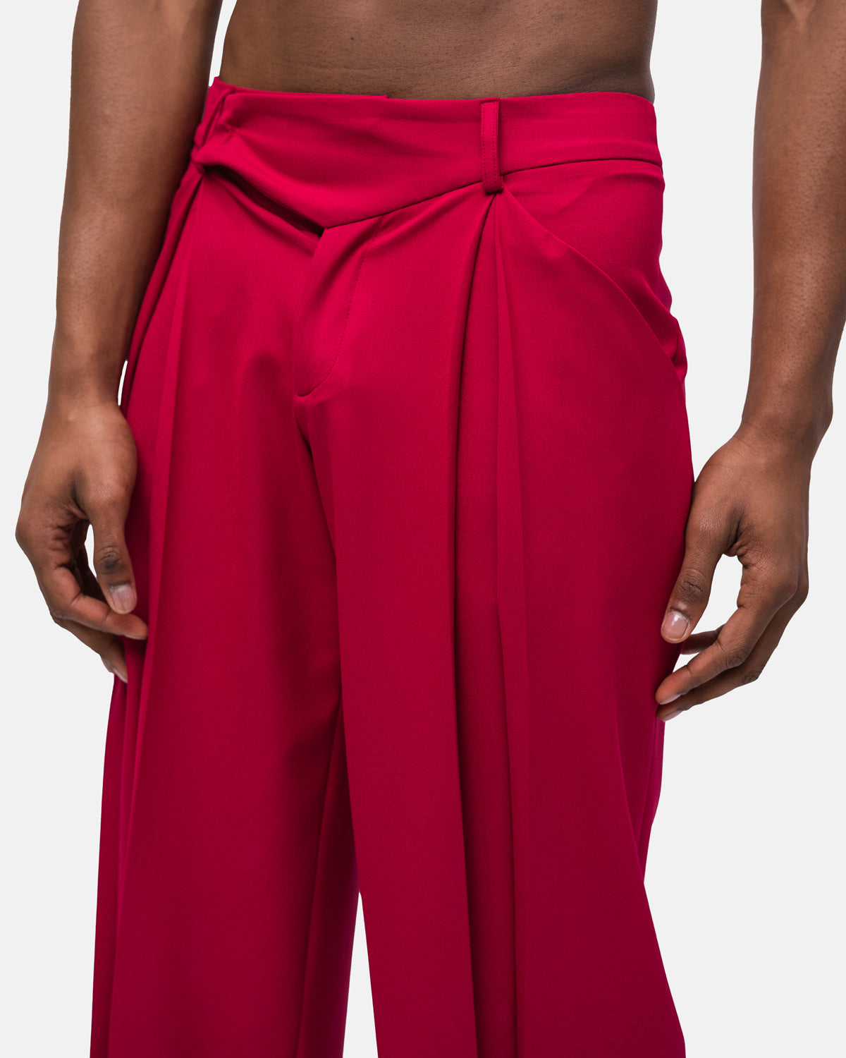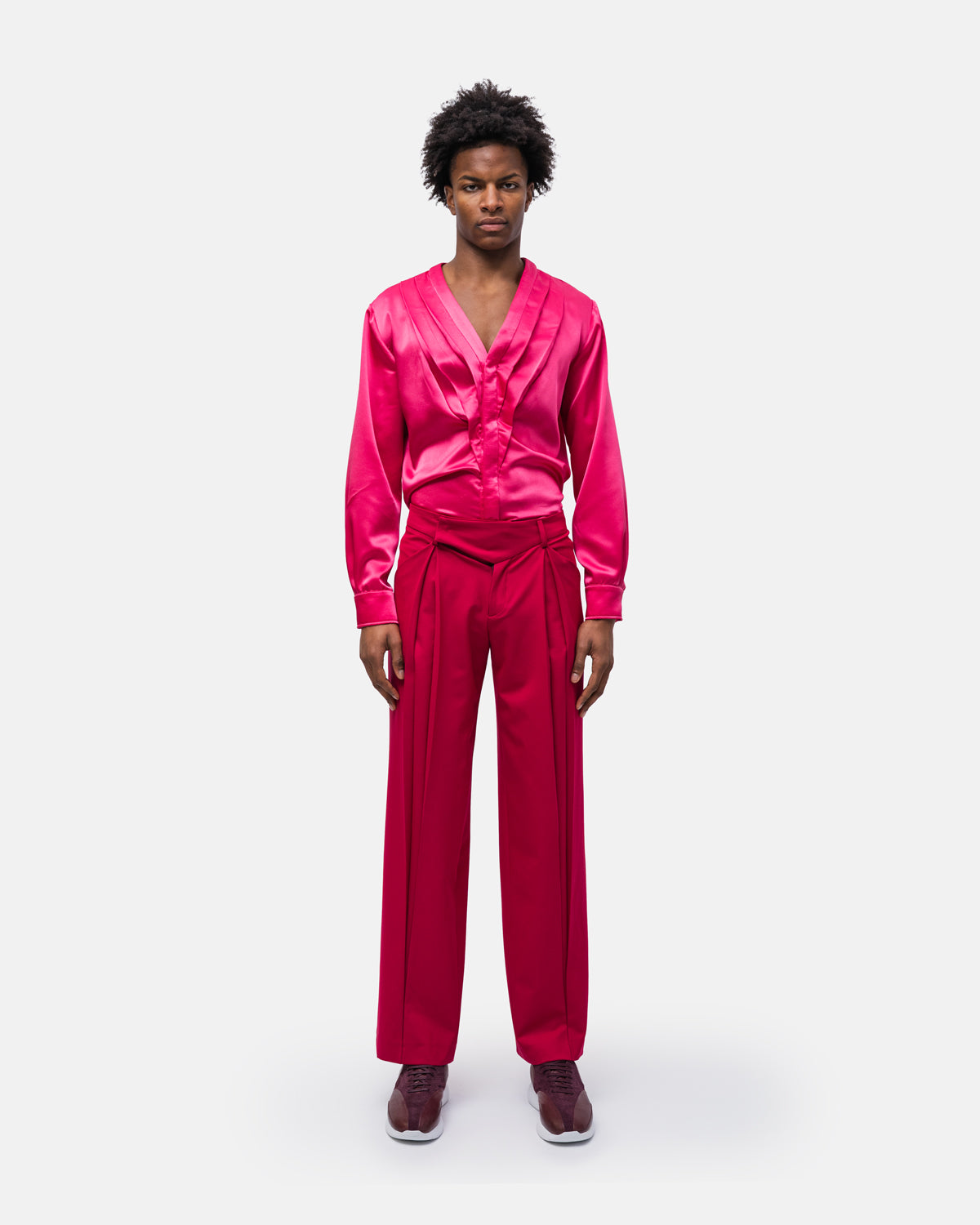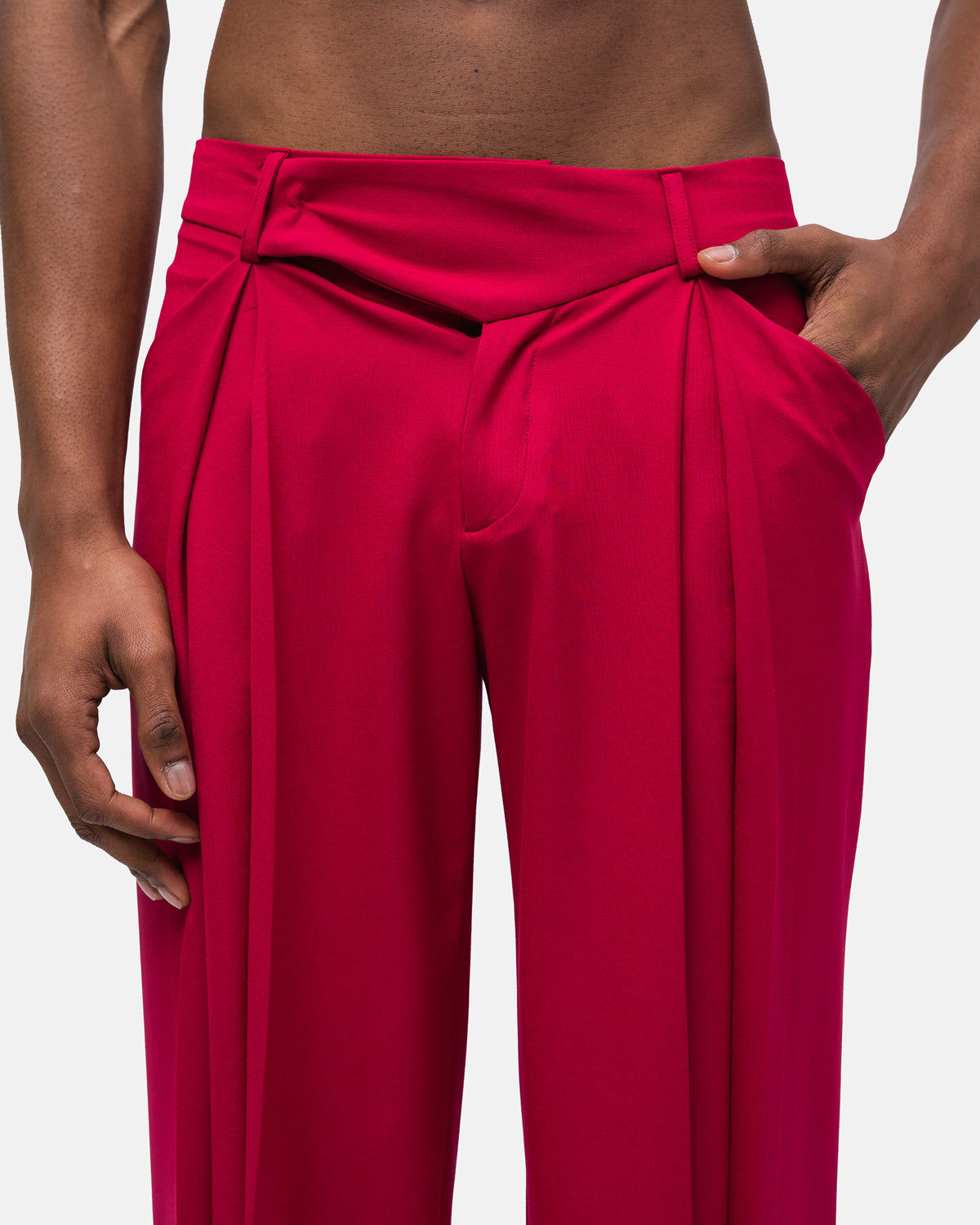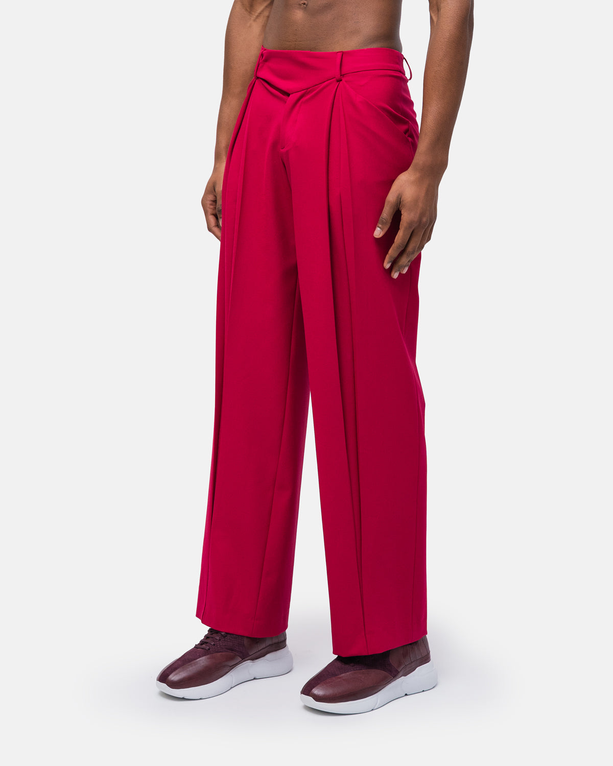 Calças largas com cós gráfico, costura em V e pregas no centro das pernas