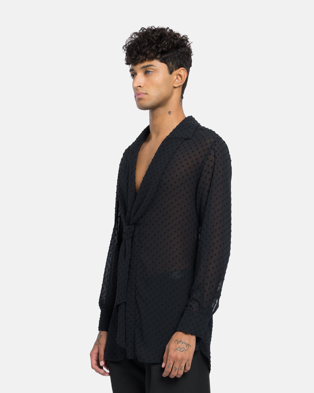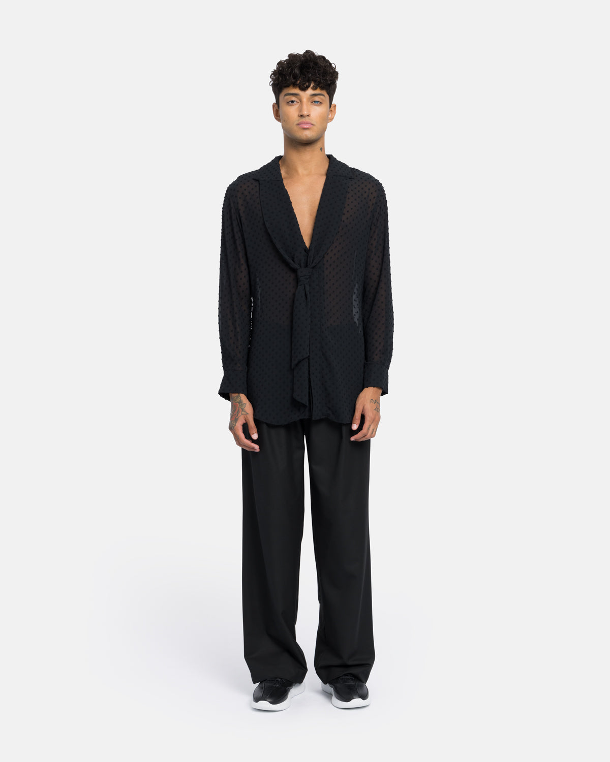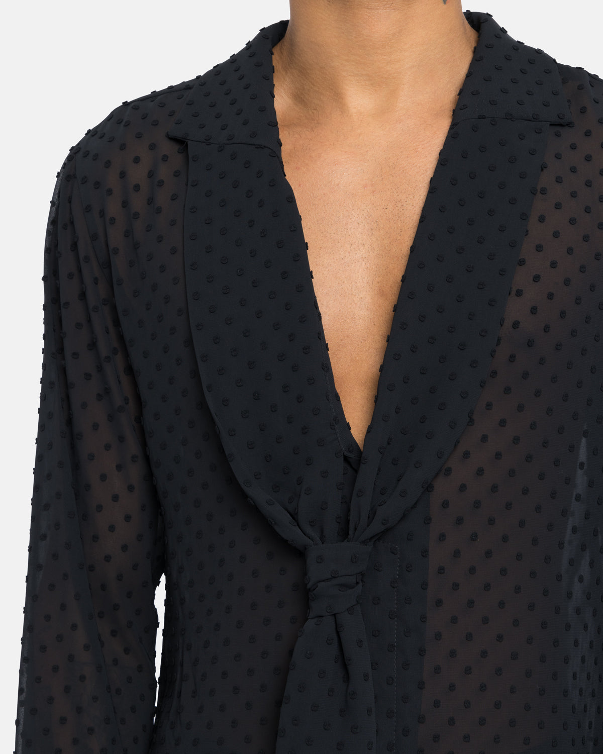 Camisa com gola gráfica e dicas para amarrar.