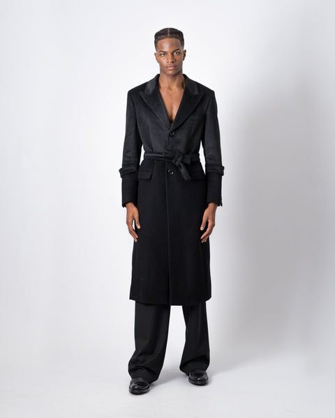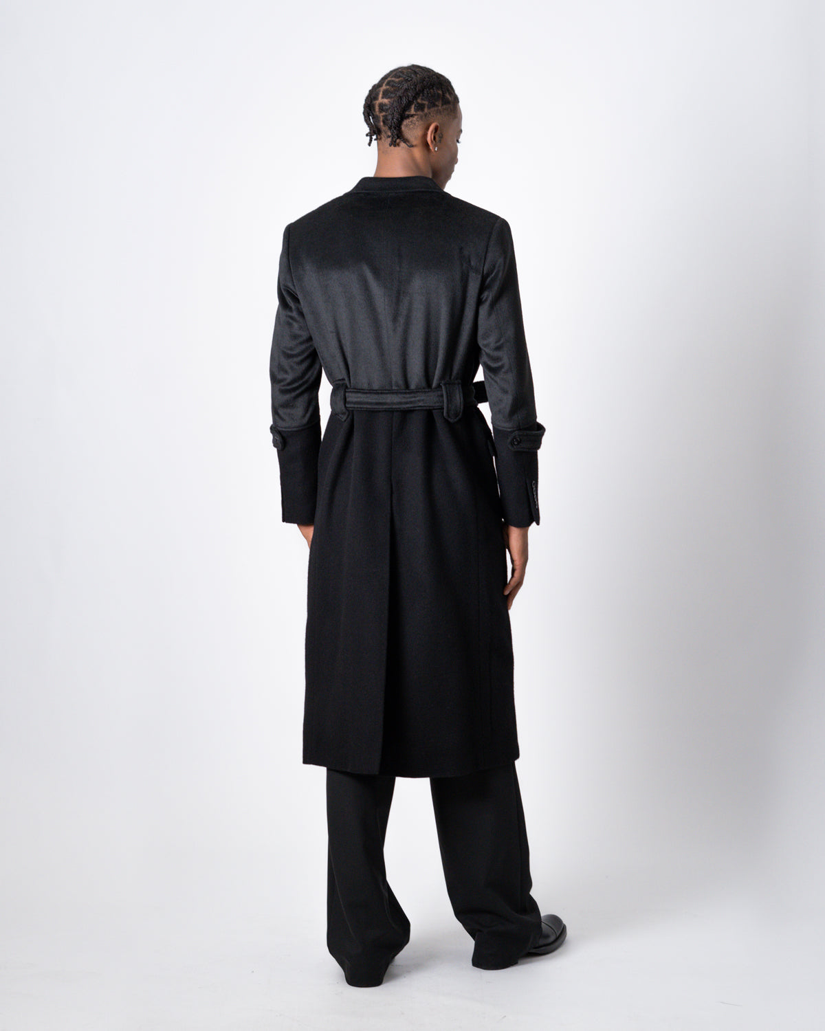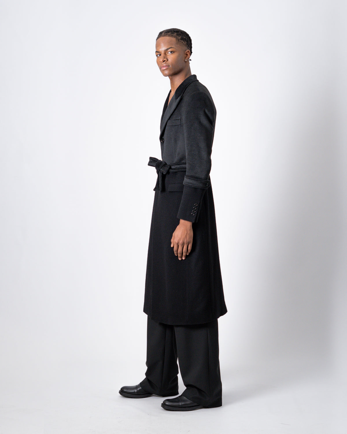 Long coat with graphic design, cut in half, upper part in Alpaca and lower part in pure Wool