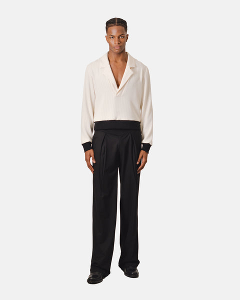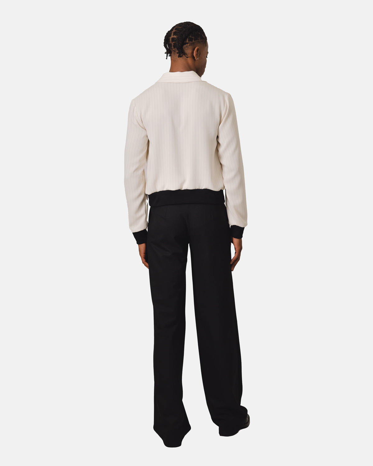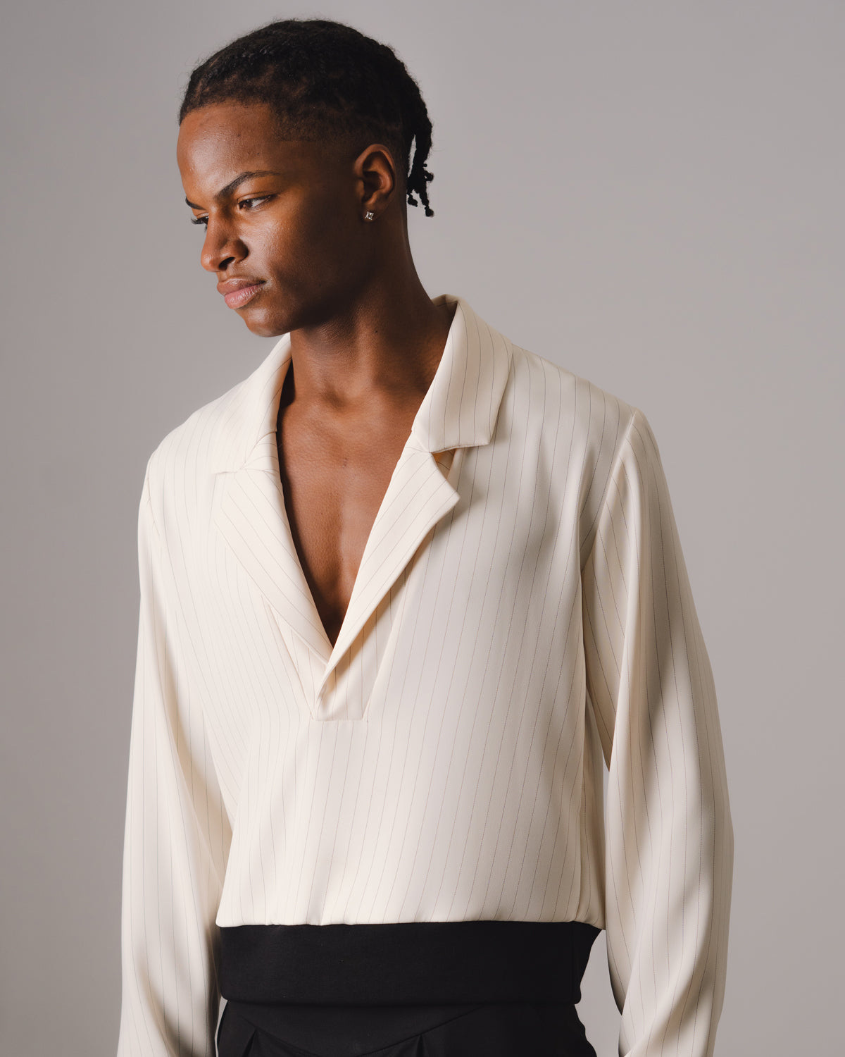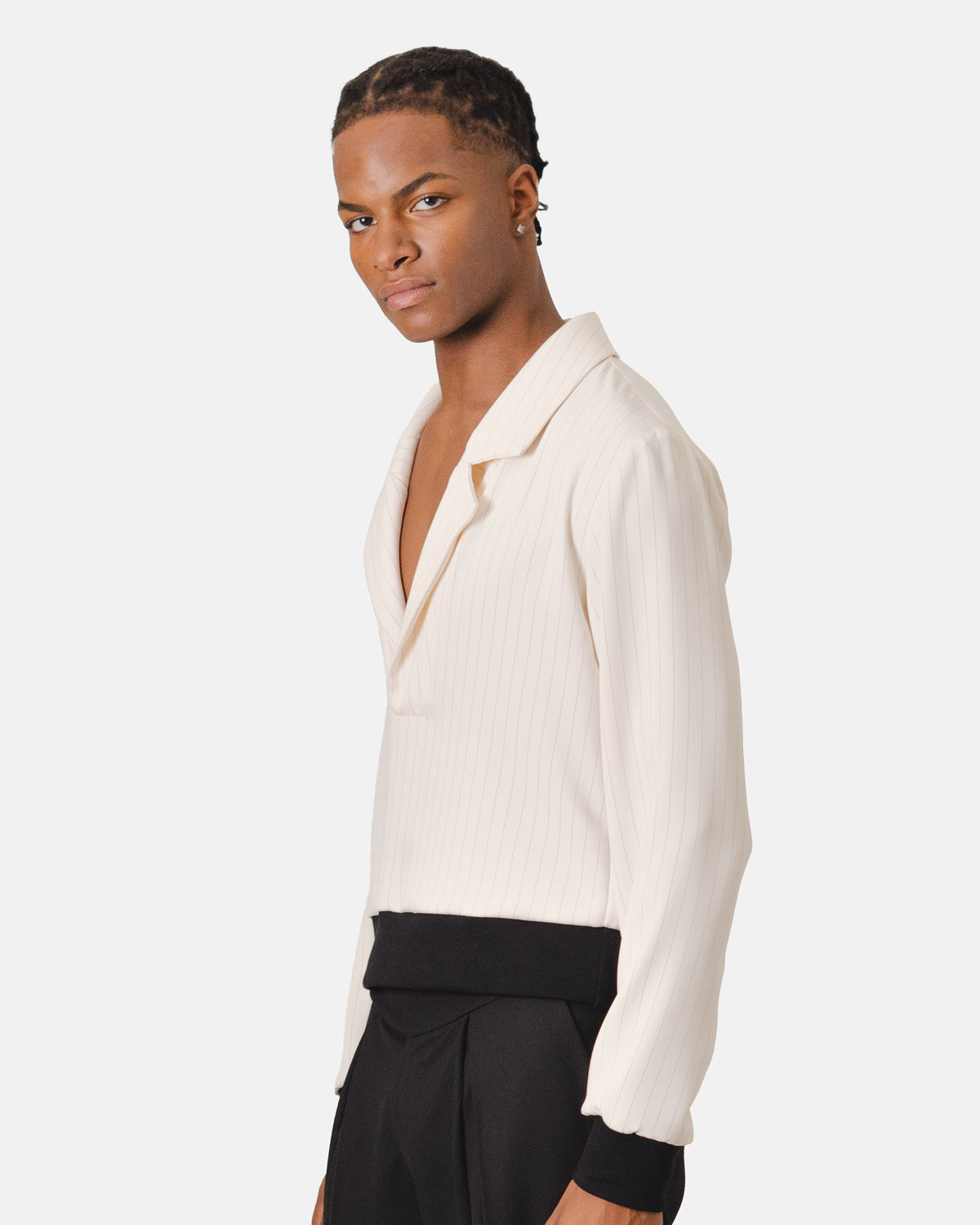 Buttonless shirt with collar and lapel in beige fabric with thin black stripes, black knit waistband and cuffs, long sleeves