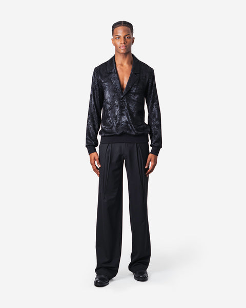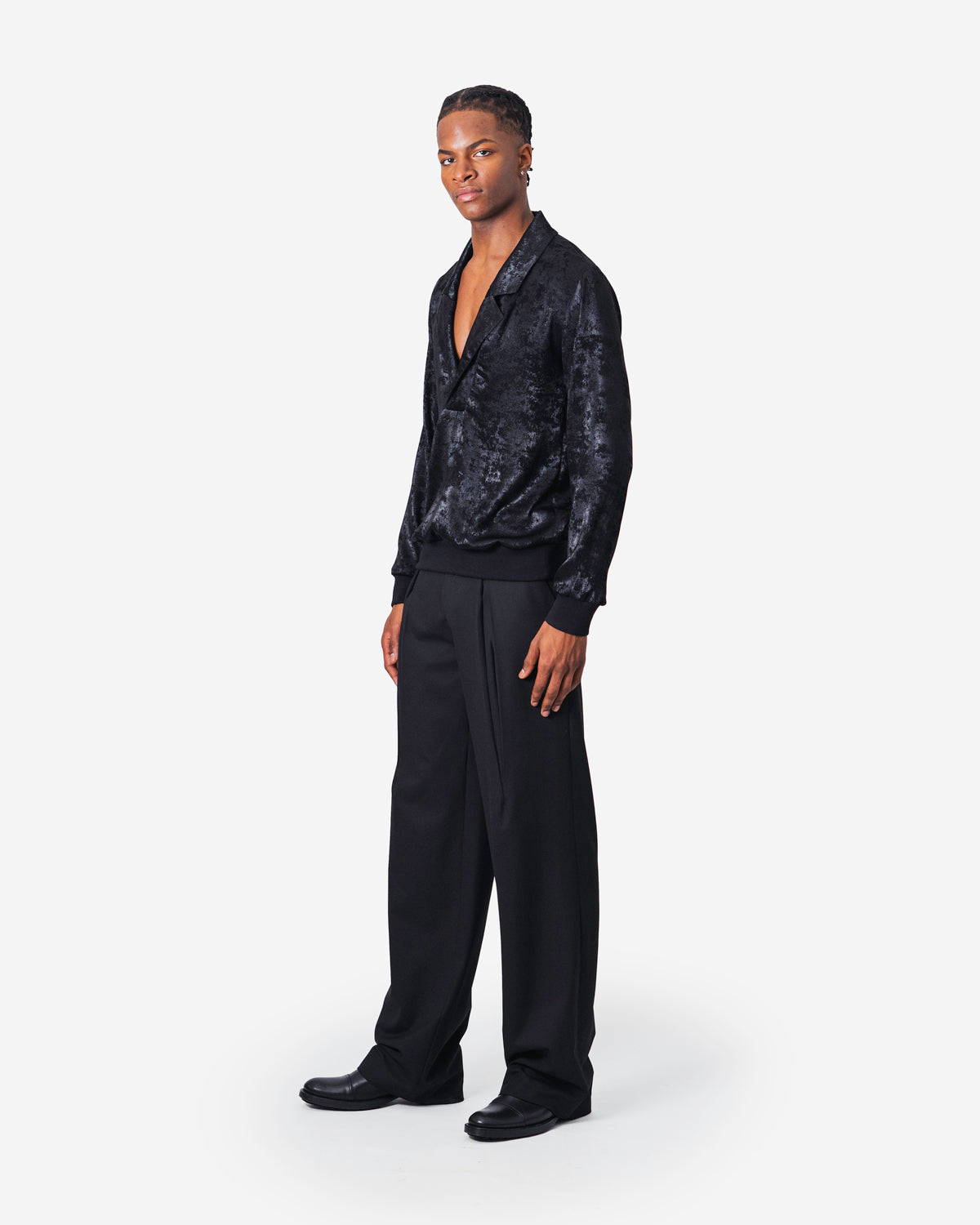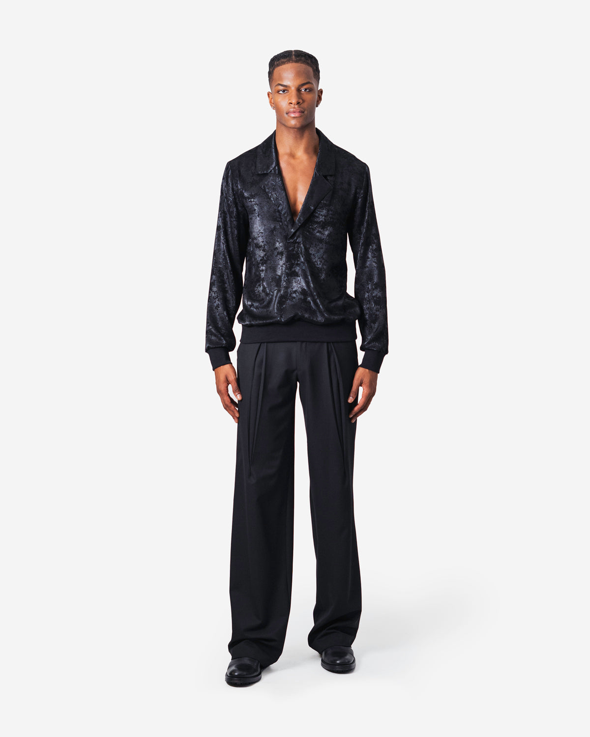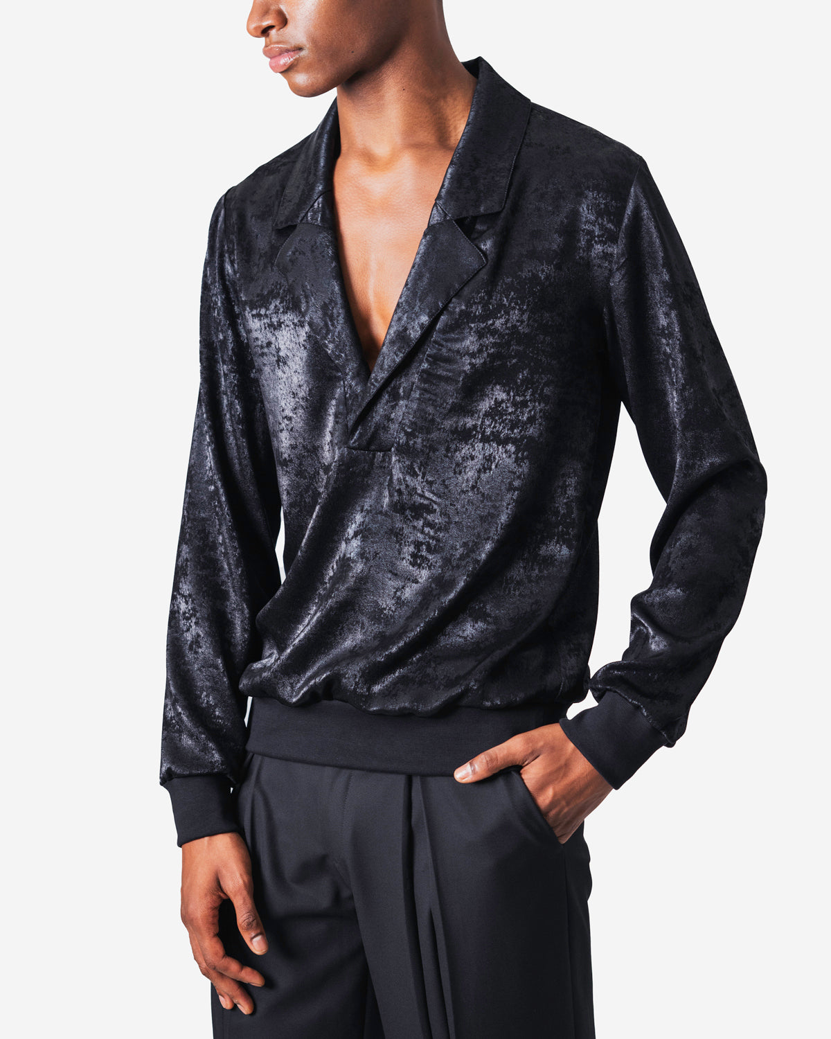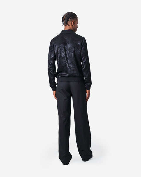 Buttonless shirt with collar and lapel in beige fabric with thin black stripes, black knit waistband and cuffs, long sleeves