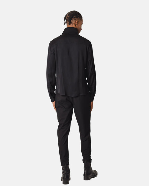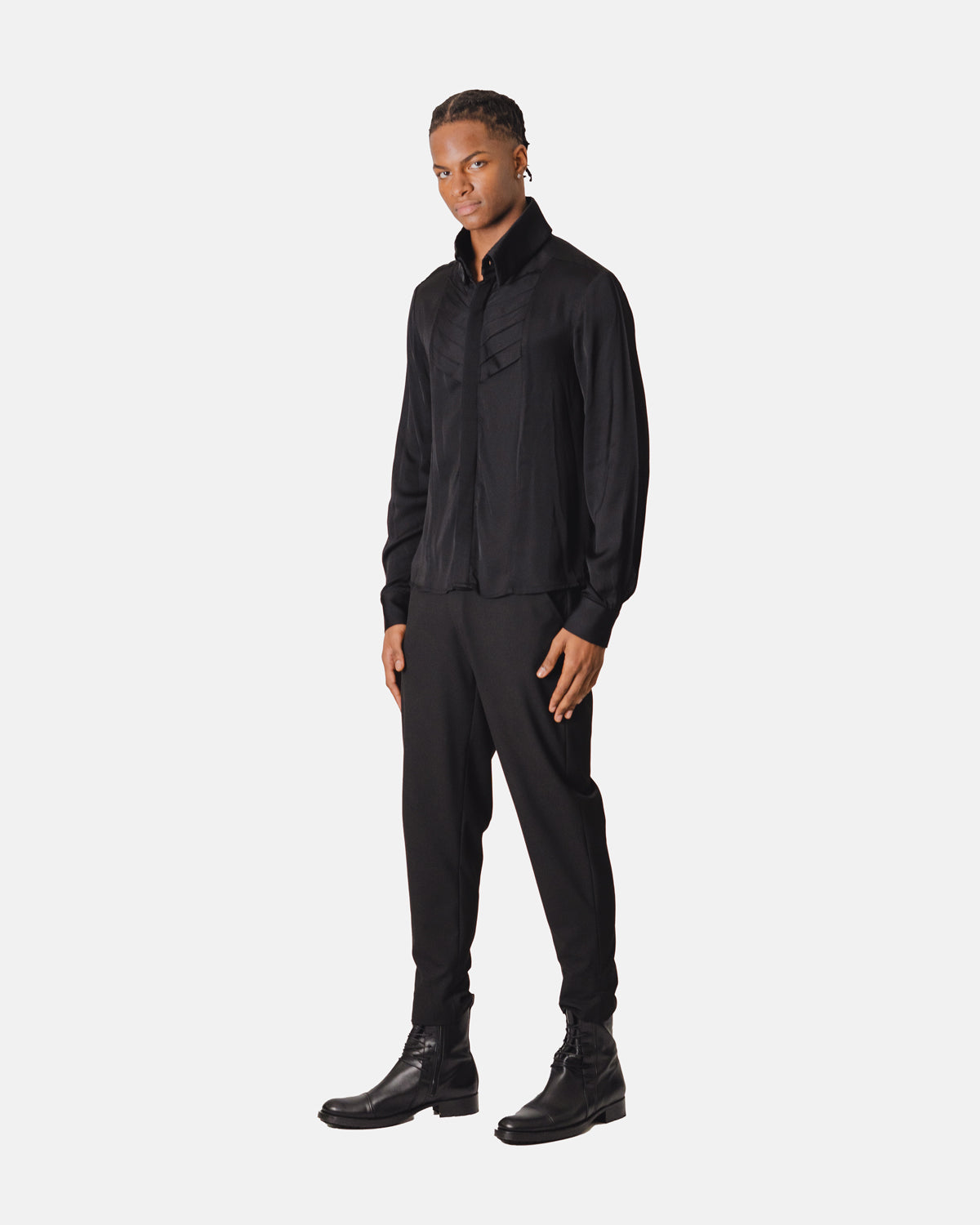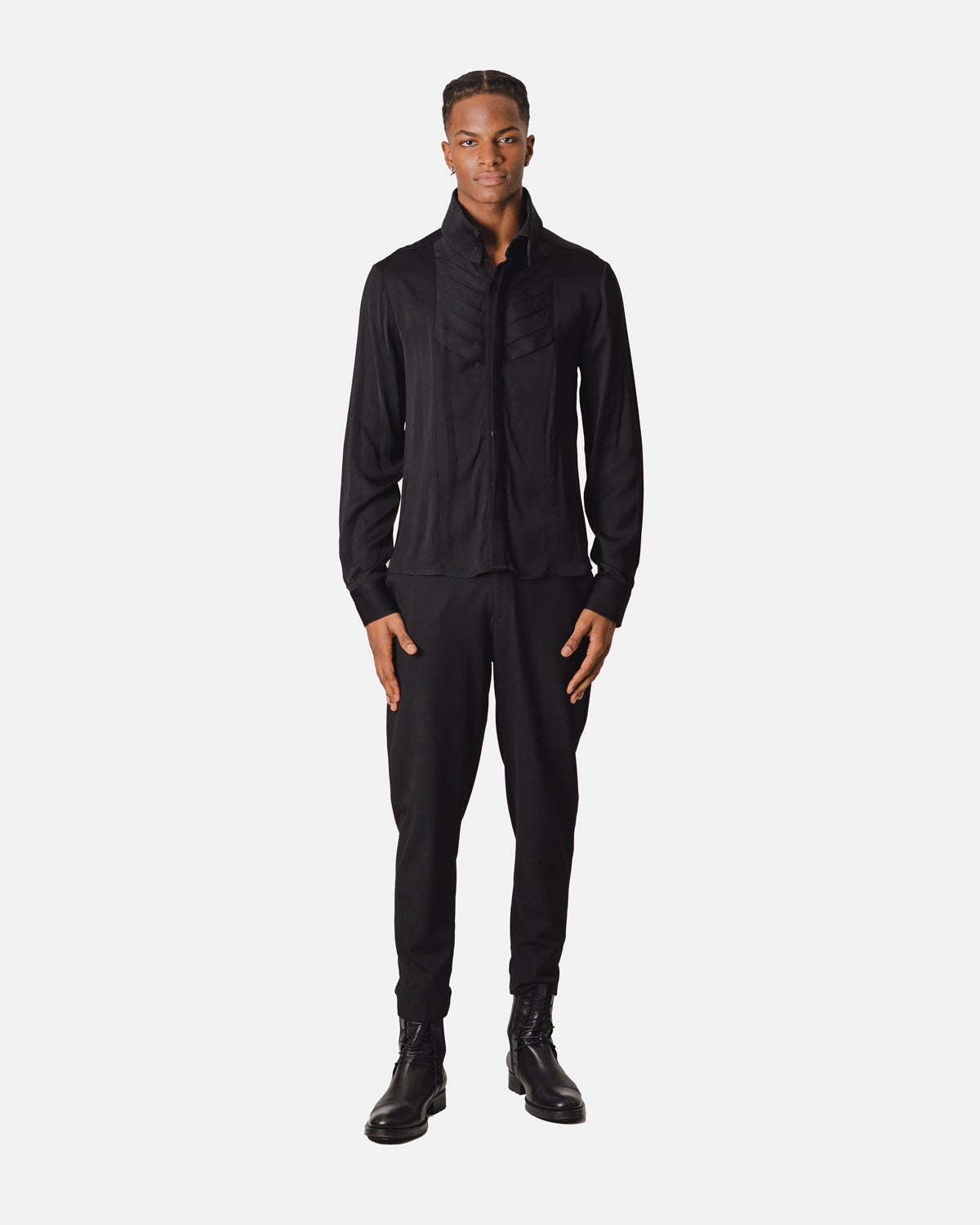 Camisa branca de manga comprida com pregas gráficas no peito.