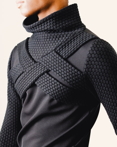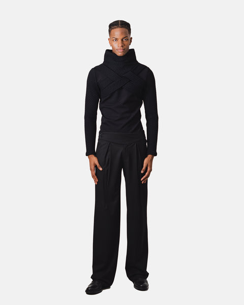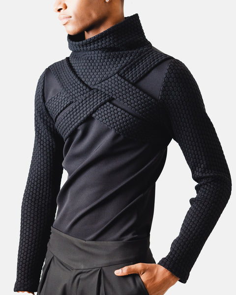 Long-sleeved jumper with graphic criss-cross straps across the chest