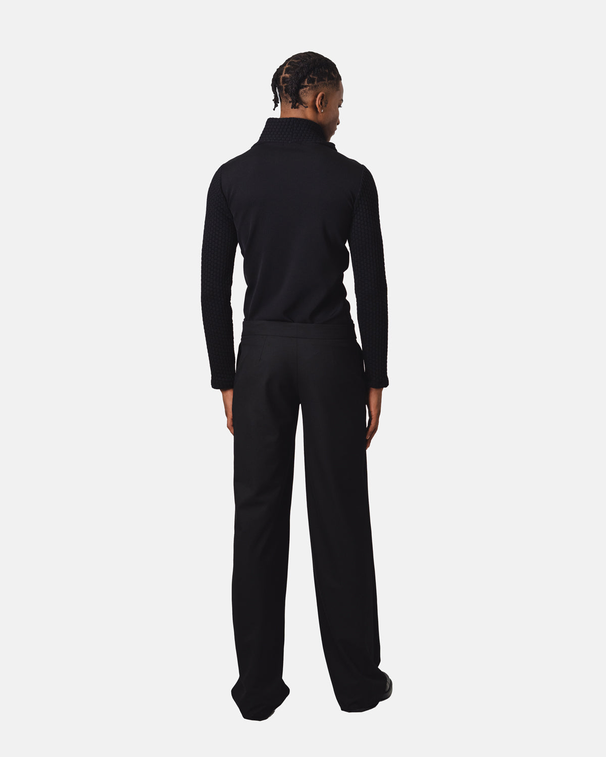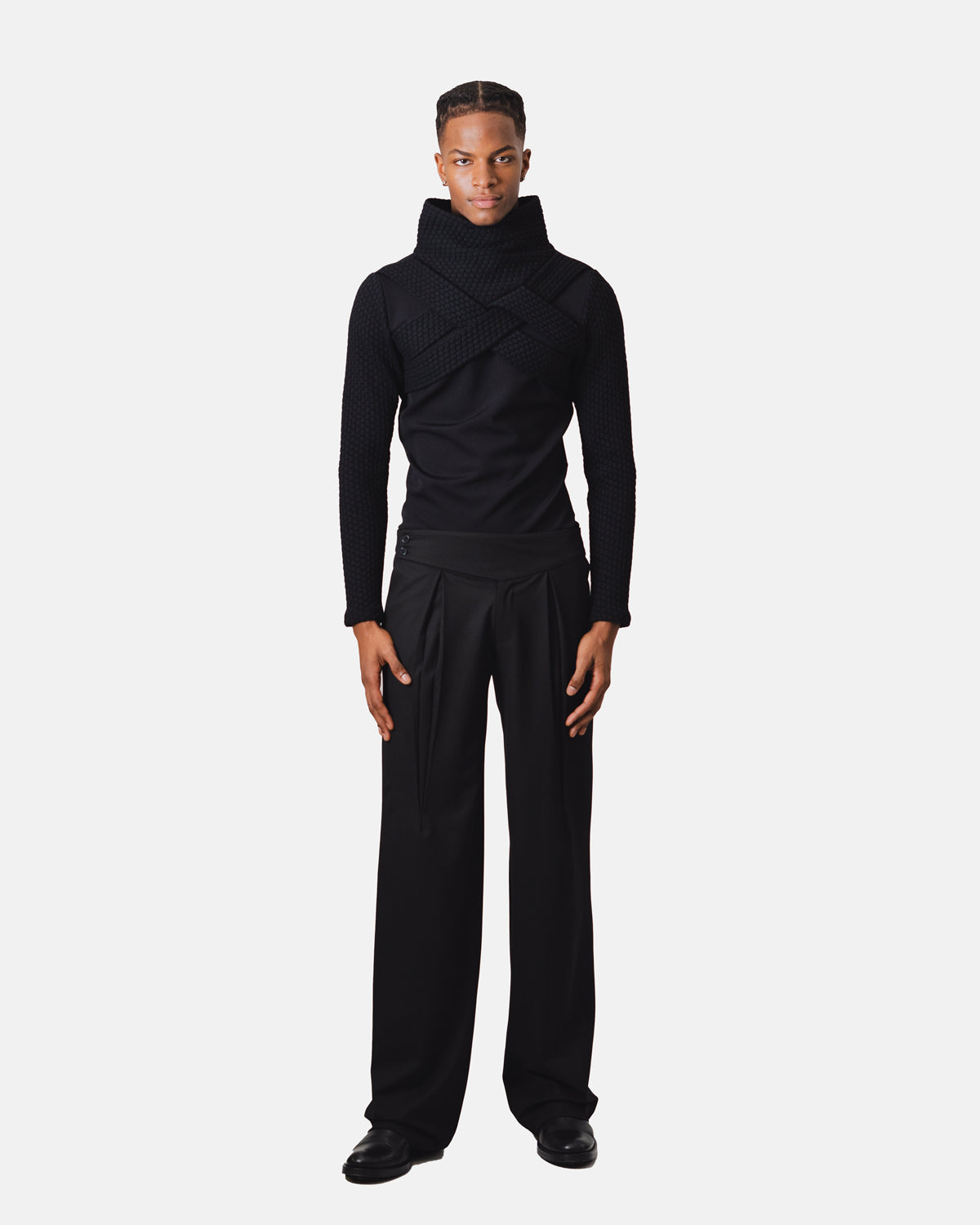 Calças largas com cós gráfico, costura em V e pregas no centro das pernas