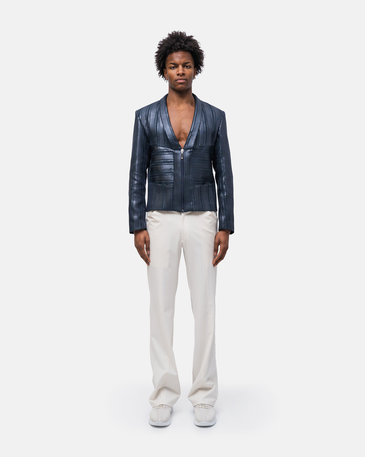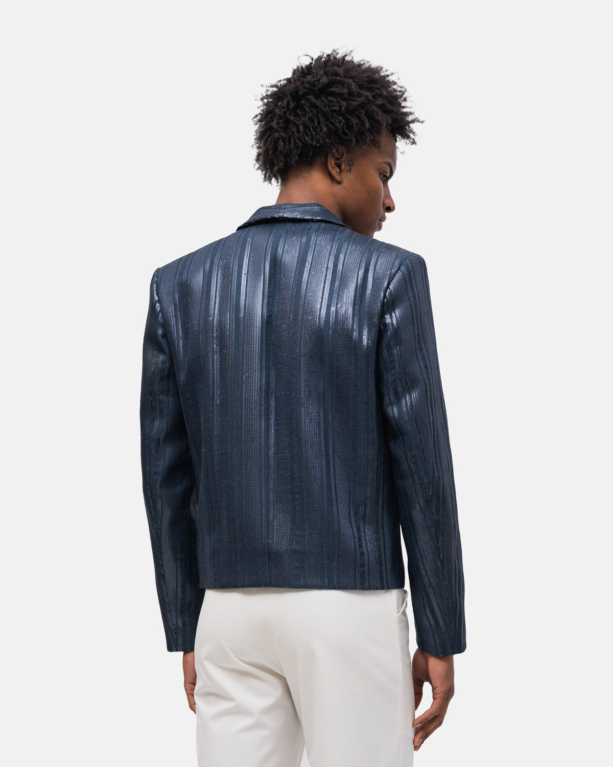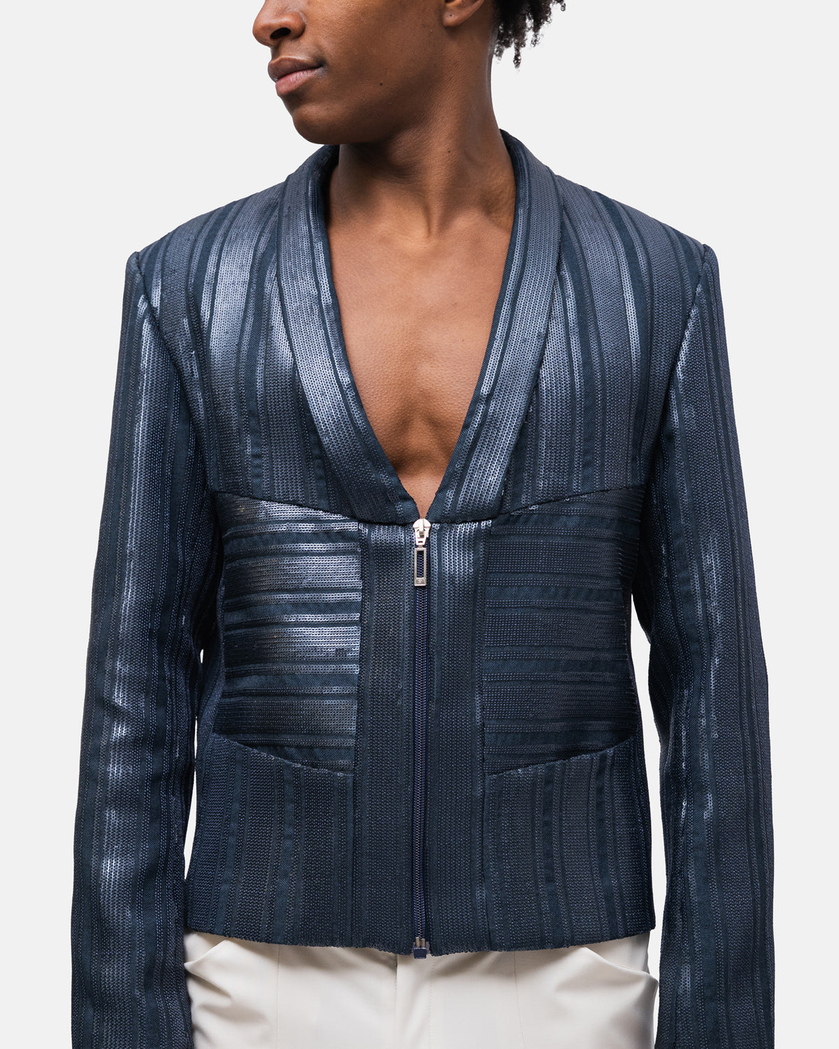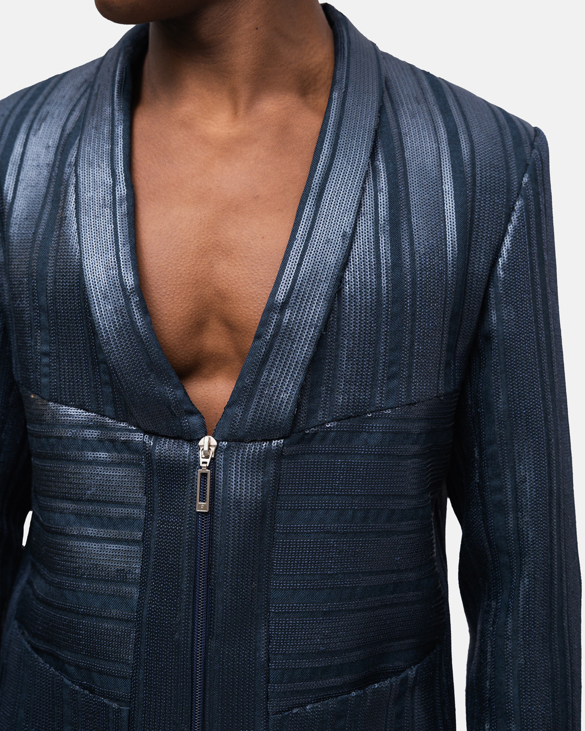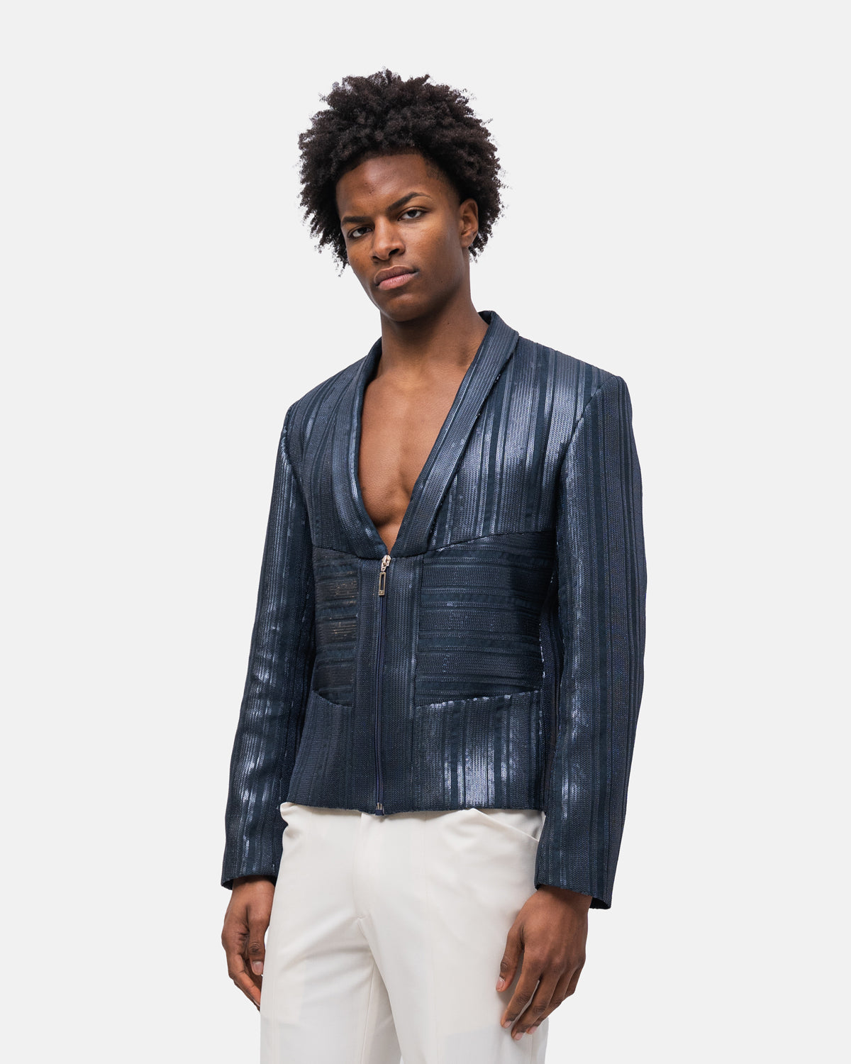 Jaqueta com cortes geométricos em mix de listras com lantejoulas, gola V com fecho em zíper
