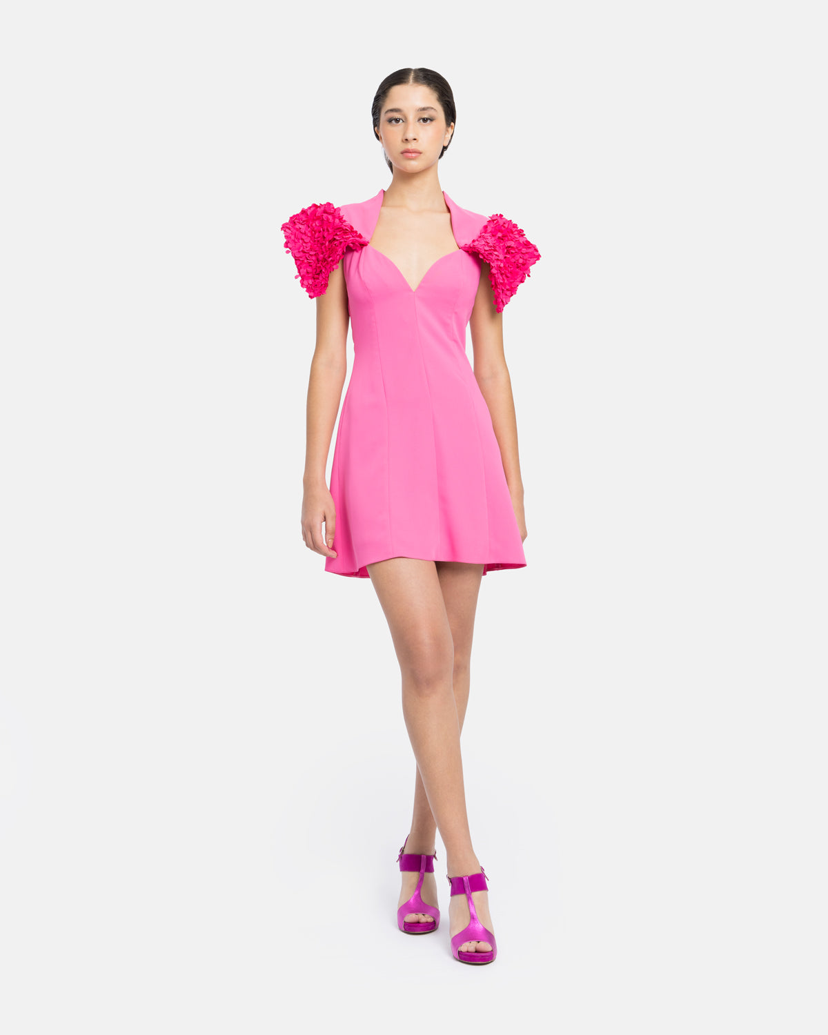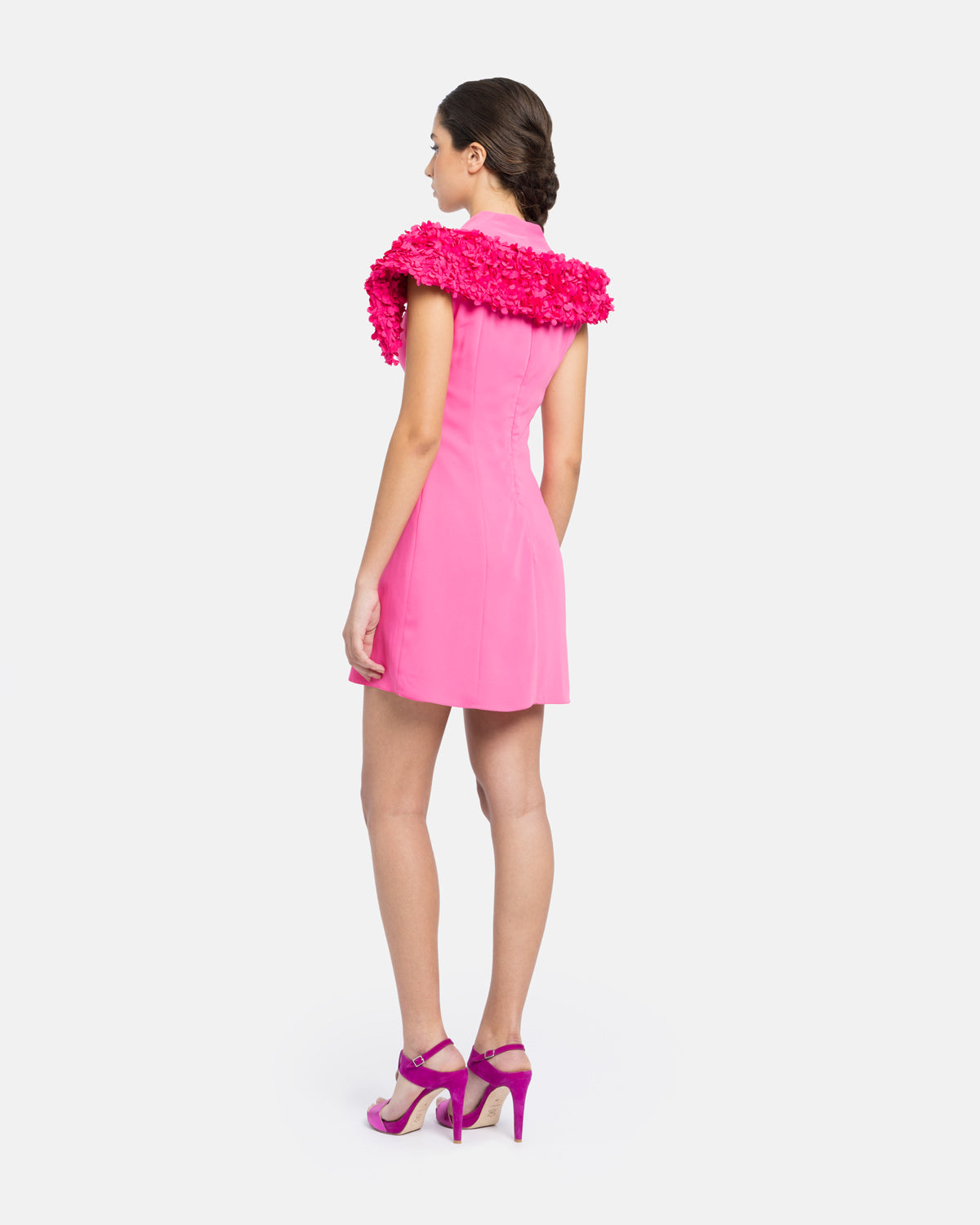 Vestido mini-saia evasê, materiais mistos, gola e decote altos, com segunda gola gráfica rígida em flores 3D. Composição: Exterior: 100% poliéster | 100% poliéster |