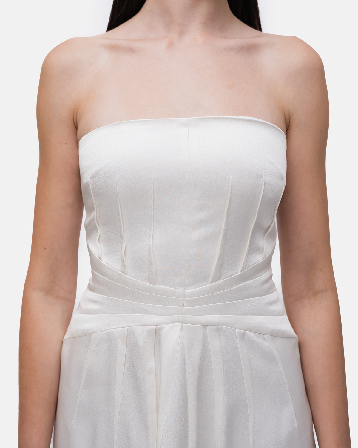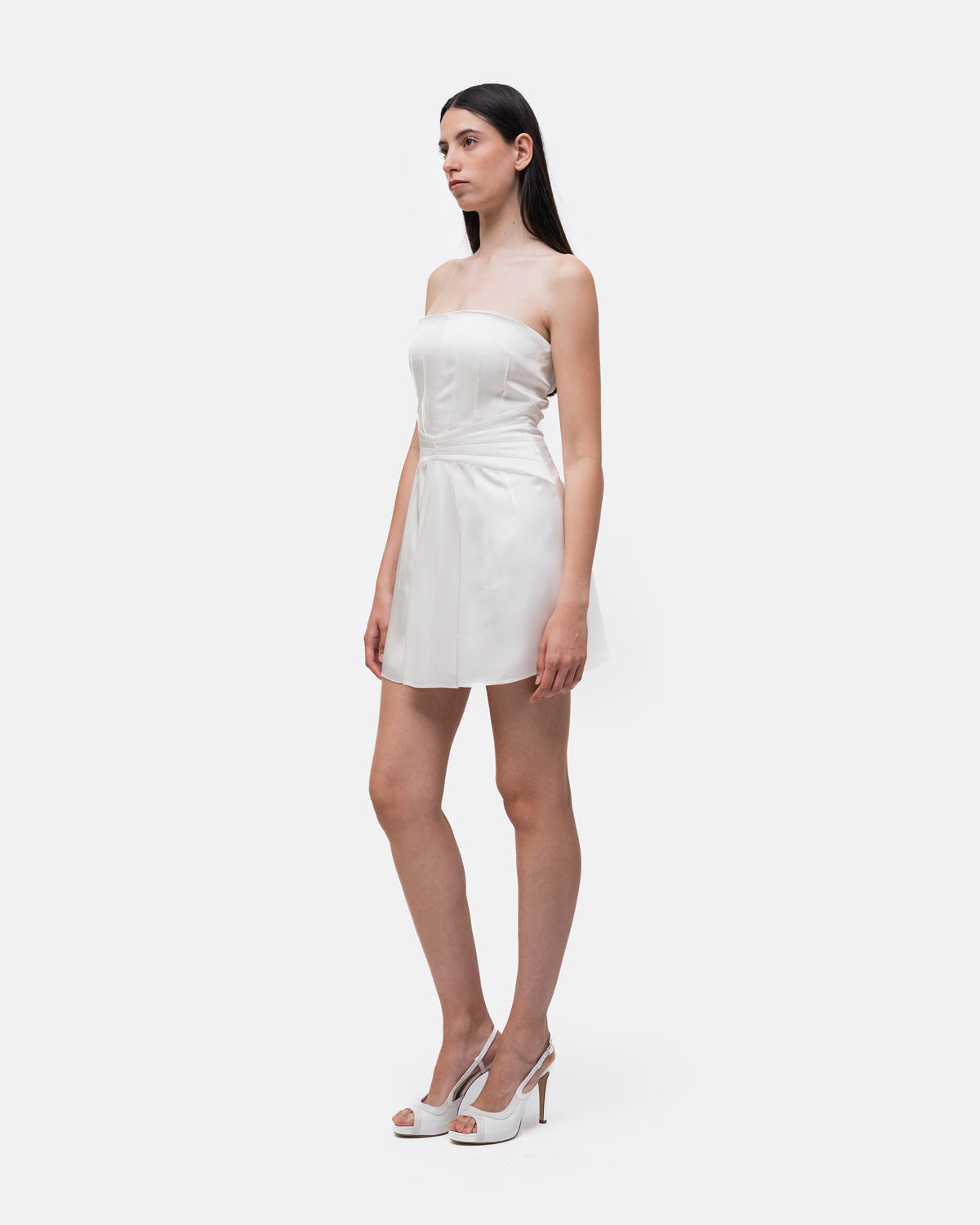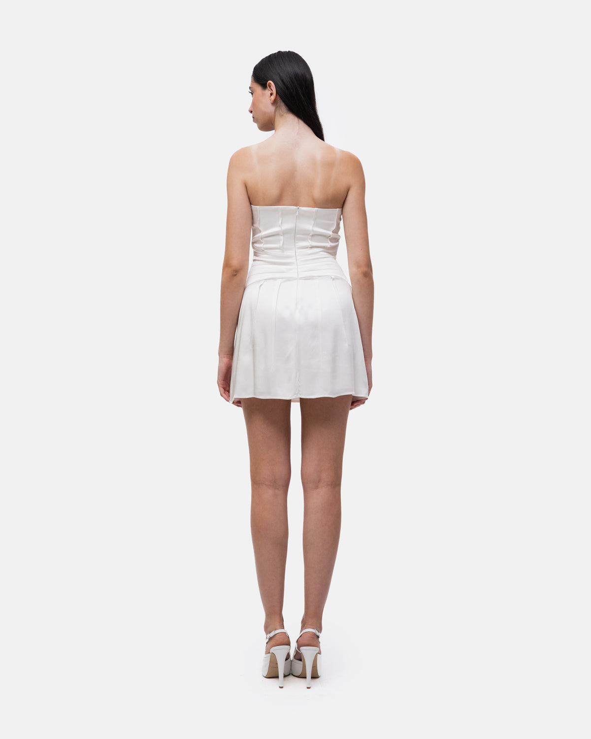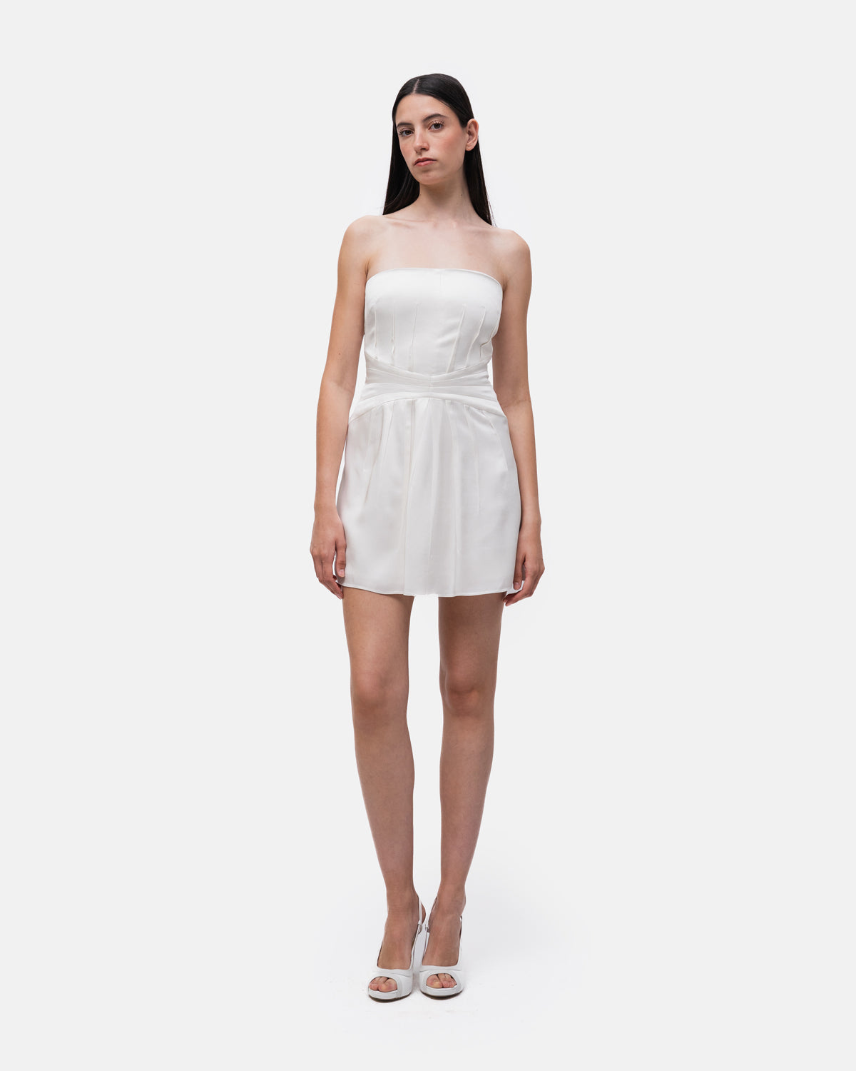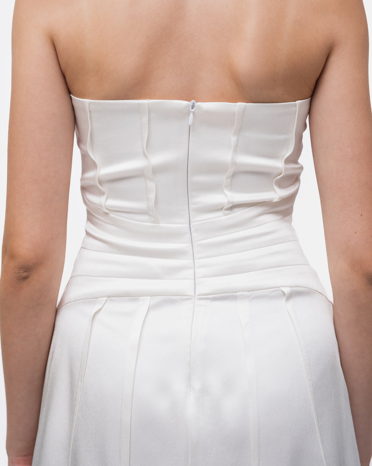 Vestido curto sem alças com recorte na cintura e várias nervuras formando um design muito gráfico