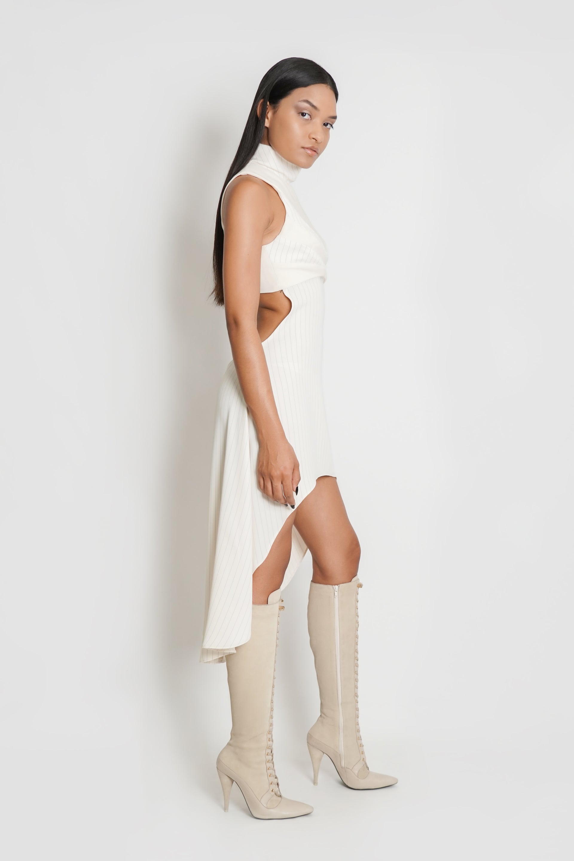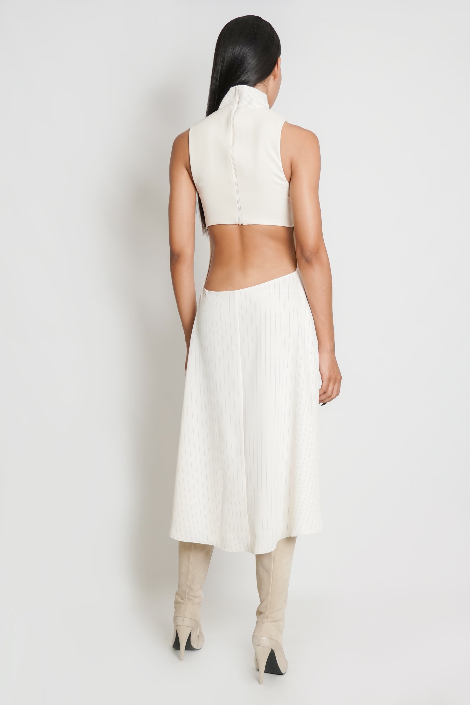 Vestido decote redondo, cintura e costas nuas, busto gráfico com recortes finos listrados e saia evasé assimétrica, mais curto na frente